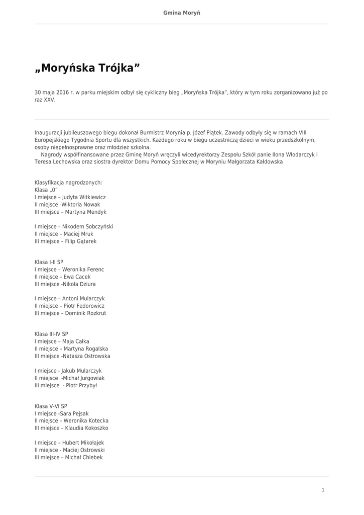 Gmina Moryń „Moryńska Trójka” 30 maja 2016 r. w parku miejskim odbył się cykliczny bieg „Moryńska Trójka”, który w tym roku zorganizowano już po raz XXV. Inauguracji jubileuszowego biegu dokonał Burmistrz Morynia p. Józef Piątek. Zawody odbyły się w ramach VIII Europejskiego Tygodnia Sportu dla wszystkich. Każdego roku w biegu uczestniczą dzieci w wieku przedszkolnym, osoby niepełnosprawne oraz młodzież szkolna. Nagrody współfinansowane przez Gminę Moryń wręczyli wicedyrektorzy Zespołu Szkół panie Ilona Włodarczyk i Teresa Lechowska oraz siostra dyrektor Domu Pomocy Społecznej w Moryniu Małgorzata Kałdowska Klasyfikacja nagrodzonych: Klasa „0” I miejsce – Judyta Witkiewicz II miejsce -Wiktoria Nowak III miejsce – Martyna Mendyk I miejsce – Nikodem Sobczyński II miejsce – Maciej Mruk III miejsce – Filip Gątarek Klasa I-II SP I miejsce – Weronika Ferenc II miejsce – Ewa Cacek III miejsce -Nikola Dziura I miejsce – Antoni Mularczyk II miejsce – Piotr Fedorowicz III miejsce – Dominik Rozkrut Klasa III-IV SP I miejsce – Maja Całka II miejsce – Martyna Rogalska III miejsce -Natasza Ostrowska I miejsce - Jakub Mularczyk II miejsce -Michał Jurgowiak III miejsce - Piotr Przybył Klasa V-VI SP I miejsce -Sara Pejsak II miejsce – Weronika Kotecka III miejsce – Klaudia Kokoszko I miejsce – Hubert Mikołajek II miejsce - Maciej Ostrowski III miejsce – Michał Chlebek 1 Gmina Moryń Klasa I-II Gimnazjum I miejsce – Dominika Fira II miejsce – Hanna Pietrzyk III miejsce – Dagmara Ogórek I miejsce – Jakub Krajewski II miejsce – Tomasz Musiał III miejsce – Piotr Mierzyński Klasa III Gimnazjum I miejsce – Ada Kaniewska II miejsce – Joanna Plinta I miejsce – Paweł Rząd II miejsce - Hubert Wojtczak III miejsce – Mariusz Małek Bieg Główny I miejsce - Małgorzata Jaz I miejsce – Marcel Adamczewski II miejsce - Krzysztof Jaz III miejsce – Bartek Kwaśniewski Miejski Ośrodek Kultury w Moryniu składa serdeczne podziękowania osobom zaangażowanym w organizację biegów. 2
