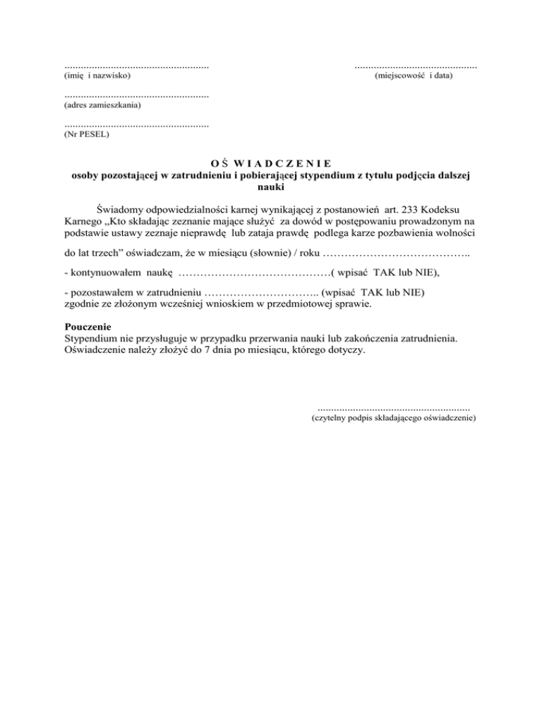 ..................................................... (imię i nazwisko) ............................................. (miejscowość i data) ..................................................... (adres zamieszkania) ..................................................... (Nr PESEL) OŚ WIADCZENIE osoby pozostającej w zatrudnieniu i pobierającej stypendium z tytułu podjęcia dalszej nauki Świadomy odpowiedzialności karnej wynikającej z postanowień art. 233 Kodeksu Karnego „Kto składając zeznanie mające służyć za dowód w postępowaniu prowadzonym na podstawie ustawy zeznaje nieprawdę lub zataja prawdę podlega karze pozbawienia wolności do lat trzech” oświadczam, że w miesiącu (słownie) / roku ………………………………….. - kontynuowałem naukę ……………………………………( wpisać TAK lub NIE), - pozostawałem w zatrudnieniu ………………………….. (wpisać TAK lub NIE) zgodnie ze złożonym wcześniej wnioskiem w przedmiotowej sprawie. Pouczenie Stypendium nie przysługuje w przypadku przerwania nauki lub zakończenia zatrudnienia. Oświadczenie należy złożyć do 7 dnia po miesiącu, którego dotyczy. ........................................................ (czytelny podpis składającego oświadczenie)