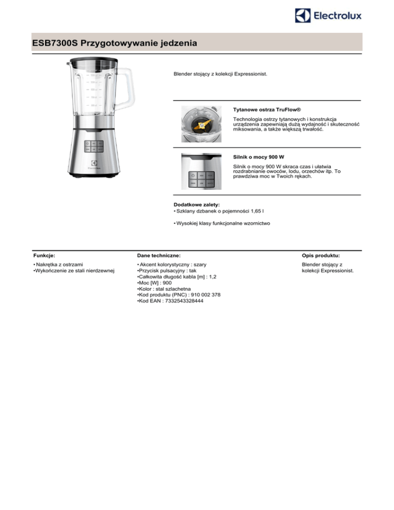 ESB7300S Przygotowywanie jedzenia Blender stojący z kolekcji Expressionist. Tytanowe ostrza TruFlow® Technologia ostrzy tytanowych i konstrukcja urządzenia zapewniają dużą wydajność i skuteczność miksowania, a także większą trwałość. Silnik o mocy 900 W Silnik o mocy 900 W skraca czas i ułatwia rozdrabnianie owoców, lodu, orzechów itp. To prawdziwa moc w Twoich rękach. Dodatkowe zalety: • Szklany dzbanek o pojemności 1,65 l • Wysokiej klasy funkcjonalne wzornictwo Funkcje: Dane techniczne: Opis produktu: • Nakrętka z ostrzami •Wykończenie ze stali nierdzewnej • Akcent kolorystyczny : szary •Przycisk pulsacyjny : tak •Całkowita długość kabla [m] : 1,2 •Moc [W] : 900 •Kolor : stal szlachetna •Kod produktu (PNC) : 910 002 378 •Kod EAN : 7332543328444 Blender stojący z kolekcji Expressionist.