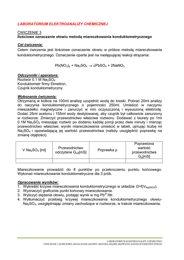 LABORATORIUM ELEKTROANALIZY CHEMICZNEJ ĆWICZENIE 3 Ilościowe oznaczanie ołowiu metodą miareczkowania konduktometrycznego Cel ćwiczenia: Celem ćwiczenia jest ilościowe oznaczenie ołowiu w próbce metodą miareczkowania konduktometrycznego. Oznaczenie oparte jest na następującej reakcji strącania: Pb(NO3)2 + Na2SO4 PbSO4 + 2NaNO3 Odczynniki i aparatura: Roztwór 0.1 M Na2SO4 Konduktometr firmy Elmetron, Czujnik konduktometryczny Wykonanie ćwiczenia: Otrzymaną w kolbce na 100ml analizę uzupełnić wodą do kreski. Pobrać 20ml analizy do naczynia konduktometrycznego o pojemności 250ml. Umieścić w naczyniu mieszadełko magnetyczne i zanurzyć w nim oczyszczoną i wysuszoną elektrodę. Dodać 25ml acetonu i 155ml wody destylowanej, aby czujnik był całkowicie zanurzony w roztworze. Zmierzyć przewodnictwo właściwe roztworu. Dodawać z biurety po 1ml 0.1M Na2SO4 mieszając roztwór po dodaniu każdej porcji przez dwie minuty i mierząc przewodnictwo właściwe; wyniki miareczkowania umieścić w tabeli, ujmując liczbę ml Na2SO4 i opowiadającą jej wartość przewodnictwa (należy uwzględnić poprawkę na zmianę objętości). V Na2SO4 [ml] Przewodnictwo odczytane God[mS] Poprawka p Poprawiona wartość przewodnictwa Gp[mS] Miareczkowanie prowadzić do 8 punktów po przekroczeniu punktu końcowego. Wykonać miareczkowanie konduktometryczne dla 3 prób. Opracowanie wyników: 1. Wykreślić krzywe miareczkowania konduktometrycznego w układzie G=f(VNa2SO4). 2. Wyznaczyć graficznie punkt końcowy miareczkowania. 3. Wyliczyć stężenie ołowiu, podając wynik w mg Pb2+/litr. 4. Wytłumaczyć przebieg krzywej miareczkowania konduktometrycznego ołowiuNa2SO4, uwzględniając zmiany zachodzące w roztworze, w trakcie miareczkowania. LABORATORIUM ELEKTROANALIZY CHEMICZNEJ ĆWICZENIE 3 ILOŚCIOWE OZNACZANIE OŁOWIU METODĄ MIARECZKOWANIA KONDUKTOMETRYCZNEGO 5. Przeprowadzić dyskusję wyników. Ilościowo scharakteryzować precyzję pomiaru. W tym celu obliczyć: średnią arytmetyczną próbki (dla stężenia mg Pb2+/litr) x , Odchylenie standardowe próbki s, Wariancję s2, Odchylenie standardowe średniej (błąd standardowy) sm, Względne odchylenie standardowe (RSD) RSD = sr, Współczynnik zmienności CV, Rozrzut (lub rozstęp) w, 6. Jak ilościowo wyraża się błąd pomiaru? 7. Rodzaje błędów w praktyce laboratoryjnej. 8. Wytłumaczyć, jaki cel ma wstępne gotowanie wody wodociągowej, którą poddaje się analizie. LITERATURA UZUPEŁNIAJĄCA: Douglas A. Skoog, Donald M. West, F.James Holler, Stanley R. Crouch, Podstawy chemii analitycznej tom 1, PWN 2007 Praca zbiorowa, Ocena i kontrola jakości wyników analitycznych, CDAiMŚ, Gdańsk 2004 Minczewski J., Marczenko Z.: Chemia analityczna, t.III PWN, Warszawa 1976. LABORATORIUM ELEKTROANALIZY CHEMICZNEJ ĆWICZENIE 3 ILOŚCIOWE OZNACZANIE OŁOWIU METODĄ MIARECZKOWANIA KONDUKTOMETRYCZNEGO