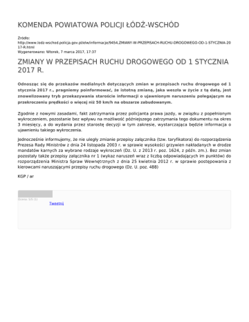 KOMENDA POWIATOWA POLICJI ŁÓDŹ-WSCHÓD Źródło: http://www.lodz-wschod.policja.gov.pl/elw/informacje/9454,ZMIANY-W-PRZEPISACH-RUCHU-DROGOWEGO-OD-1-STYCZNIA-20 17-R.html Wygenerowano: Wtorek, 7 marca 2017, 17:37 ZMIANY W PRZEPISACH RUCHU DROGOWEGO OD 1 STYCZNIA 2017 R. Odnosząc się do przekazów medialnych dotyczących zmian w przepisach ruchu drogowego od 1 stycznia 2017 r., pragniemy poinformować, że istotną zmianą, jaka weszła w życie z tą datą, jest znowelizowany tryb przekazywania staroście informacji o ujawnionym naruszeniu polegającym na przekroczeniu prędkości o więcej niż 50 km/h na obszarze zabudowanym. Zgodnie z nowymi zasadami, fakt zatrzymania przez policjanta prawa jazdy, w związku z popełnionym wykroczeniem, pozostanie bez wpływu na możliwość późniejszego zatrzymania tego dokumentu na okres 3 miesięcy, a do wydania przez starostę decyzji w tym zakresie, wystarczająca będzie informacja o ujawnieniu takiego wykroczenia. Jednocześnie informujemy, że nie uległy zmianie przepisy załącznika (tzw. taryfikatora) do rozporządzenia Prezesa Rady Ministrów z dnia 24 listopada 2003 r. w sprawie wysokości grzywien nakładanych w drodze mandatów karnych za wybrane rodzaje wykroczeń (Dz. U. z 2013 r. poz. 1624, z późn. zm.). Bez zmian pozostały także przepisy załącznika nr 1 (wykaz naruszeń wraz z liczbą odpowiadających im punktów) do rozporządzenia Ministra Spraw Wewnętrznych z dnia 25 kwietnia 2012 r. w sprawie postępowania z kierowcami naruszającymi przepisy ruchu drogowego (Dz. U. poz. 488) KGP / ar Ocena: 5/5 (1) Tweetnij