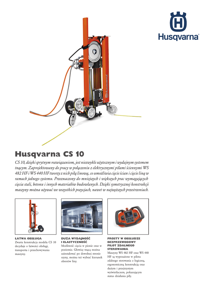Husqvarna CS 10 CS 10, dzięki sprytnym rozwiązaniom, jest niezwykle użytecznym i wydajnym systemem tnącym. Zaprojektowany do pracy w połączeniu z elektrycznymi piłami ściennymi WS 482 HF i WS 440 HF tworzy z nich piłą linową, co umożliwia cięcie ścian i cięcie liną w ramach jednego systemu. Przeznaczony do mniejszych i większych prac wymagających cięcia stali, betonu i innych materiałów budowlanych. Dzięki symetrycznej konstrukcji maszyny można używać we wszystkich pozycjach, nawet w najwęższych przestrzeniach. ŁATWA OBSŁUGA Zwarta konstrukcja modelu CS 10 decyduje o łatwości obsługi, transportu i przechowywania maszyny. DUŻA WYDAJNOŚĆ I ELASTYCZNOŚĆ Możliwość cięcia w pionie oraz w poziomie. Głowicę tnącą można zainstalować po dowolnej stronie szyny, można też wybrać kierunek obrotów liny. PROSTY W OBSŁUDZE BEZPRZEWODOWY PILOT ZDALNEGO STEROWANIA Maszyny WS 482 HF oraz WS 440 HF są wyposażone w pilota zdalnego sterowania z logiczną, ergonomiczną konstrukcją oraz dużym i przejrzystym wyświetlaczem, pokazującym status działania piły. TECHNICAL SPECIFICATION Output power with WS 482 HF and PP 480 HF 19 kW / 25 KM Output power with WS 440 HF and PP 440 HF 13 kW / 17 KM Speed Wire speed at 1200 rpm 0-1200 obr/min 24 m/s / 78,7 stopy Pojemność magazynu 10 m / 32,8 stopy Wire length, max/min 11,7/1,7 m / 38,4/5,6 stopy Wysokość kolumny Weight, WS 482 HF / WS 440 HF 1200 mm 138/135 kg / 304/297 funty