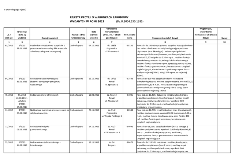 organu prowadzącego rejestr) REJESTR DECYZJI O WARUNKACH ZABUDOWY WYDANYCH W ROKU 2013 (Dz.U.2004.130.1385) Lp. = znak spr. Nr decyzji i data jej wydania Rodzaj inwestycji Nazwa i adres wnioskodawcy Data wpływu wniosku Oznaczenie nieruchomości (nr dz. ew. + obręb geodezyjny) Pow. działki w m2 Streszczenie ustaleń decyzji 1 63/2012 3 1/2013 23.01.2013 4 Przebudowa i rozbudowa budynków z przeznaczeniem na usługi SPA w zespole zabudowy usługowej turystycznej. 5 Osoba fizyczna 6 04.10.2012 7 dz. 288/1 Pogorzelica ul. Wrzosowa 4 64/2012 2/2013 31.01.2013 Rozbudowa części rekreacyjnej (basenu) istniejącego pensjonatu wczasowego. Osoba prawna 15.10.2012 dz. 14/16 Rewal ul. Spokojna 1 0,1448 45/2012 55/2012 26.10.2012 uchylona 3/2013 04.02.2013 4/2013 05.02.2013 Budowa domków letniskowych Osoba fizyczna 13.08.2012 dz. 433/12 Rewal ul. Akacjowa 3 0,1036 Nadbudowa budynku z przeznaczeniem na Osoba prawna salę konferencyjną. 20.11.2012 dz. 11/2 Pogorzelica ul. Wojska Polskiego 3 3,0334 71/2012 5/2013 06.02.2013 Rozbudowa budynku gastronomicznego. Osoba fizyczna 14.11.2012 dz. 45/3 Rewal ul. Warszawska 2 0,4692 Pow.zab.do 28,09%; Zespół zabudowy (mak 1 kondygn.), możliwe podpiwniczenie, wysokość 0,00 budynków do 0,30 m n.p.t., możliwa funkcja turystyczna, letniskowa, wypoczynkowa, funkcja gastronomiczna bez stosowania urządzeń nagłaśniających. 72/2012 6/2013 14.02.2013 Budowa domu jednorodzinnego letniskowego. Osoba fizyczna 16.11.2012 dz. 94 Trzęsacz 0,0476 Pow.zab. do 21,85 %; zabudowa z możliwą kondygnacją w poddaszu użytkowym (max 2 kond.), możliwy zespół zabudowy, możliwe podpiwniczenie, wysokość 0,00 budynkow do 0,30 m n.p.t., możliwa funkcja turystyczna, letniskowa, wypoczynkowa, rekreacyjna. 74/2012 0,8152 8 Pow.zab. do 200m2 w przyziemiu budynku; Rodzaj zabudowy bez zmian zabudowa z ostatnią kondygnacją w poddaszu użytkowym (max.3kondygn.) z zadaszonymi galeriami i zadoszonymi balkonami/tarasami, możliwe podpiwniczenie, wysokość 0,00 budynku do 0,30 m n.p.t.., możliwa funkcja mieszkalna ograniczona do jednego lokalu mieszkalnego, możliwa funkcja handlowa o pow. sprzedaży poniżej 400m2, możliwa funkcja gastronomiczna, bez stosowania urządzeń nagłaśniających, niecka basenu kąpielowego o pow. lustra wody co najmniej 50m2, usługi SPA o pow. co najmniej 100m2. Pow.zab.do 110 m2; Zespół zabudowy, rozbudowa jednokondygnacyjna, możliwe podpiwniczenie, wysokość 0,00 budynku do 0,30 m n.p.t., niecka basenu kapielowego o powierzchni lustra wody co najmniej 50m2, usługi Spa o powierzchni co najmniej 100m2. Pow. zab. do 16,43%; Zabudowa z możliwą kondygnacją w poddaszu użytkowym (max2kondygn.), możliwy zespół zabudowy, możliwe podpiwniczenie, wysokość 0,00 budynków do 0,30 m n.p.t., możliwa funkcja turystyczna, letniskowa, wypoczynkowa. Pow. zab. do 16,23%; zespół zabudowy (max 5 kondygnacji), możliwe podpiwniczenie, wysokość 0,00 budynku do 0,30 m n.p.t., możliwa funkcja handlowa o pow. sprz. Poniżej 400 m2, możliwa funkcja gastronomiczna, bez stosowania urządzeń nagłaśniających. Wygaśnięcie, stwierdzenie nieważności lub zmiana decyzji Uwagi 9 10 69/2012 7/2013 18.02.2013 Budowa pawilonu handlowego. Osoba fizyczna 06.11.2012 dz. 515/1 Rewal ul. Westerplatte 0,0458 73/2012 8/2013 19.02.2013 Budowa budynków letniskowych. Osoba fizyczna 19.11.2012 dz. 280/1 Pogorzelica 0,1548 59/2012 9/2013 20.02.2013 Budowa budynku letniskowego. Osoba prawna 01.10.2012 dz. 284 Pogorzelica ul. Wojska Polskiego 25 1,4712 4 10/2013 26.02.2013 Zmiana sposou użytkowania na cele mieszkalne. Osoba fizyczna 11.01.2013 dz. 562/1 Pobierowo ul. Wojska Polskiego 42a 0,0232 70/2012 11/2013 26.02.2013 Nadbudowa lub budowa budynku usługowego o funkcji handlowej, turystycznej z mieszkaniem Osoba fizyczna 08.11.2012 dz. 274, 275 Pogorzelica ul. Wojska Polskiego 28 0,025 67/2012 12/2013 13.03.2013 Rozbudowa ośrodka wczasowego na cele usługowo-handlowe. Osoba fizyczna 29.10.2012 dz. 46, 47, 135 Rewal ul. Sikorskiego 0,4601 21/2012 13/2013 18.03.2013 Park Wieloryba - park tematyczny o charakterze rekreacyjnym. Osoba fizyczna 14.05.2012 dz. 203/1, 203/2 Rewal ul. Kamieńska 2,9284 61/2012 14/2013 19.03.2013 Rozbudowa i przebudowa budynku Osoba fizyczna handlowego z przeznaczeniem na funkcje usługową, gastronomiczną i zakwaterowania turystycznego wraz z funkcją mieszkalną. 03.0.2012 dz. 293 Trzęsacz ul. Klifowa 0,1145 Pow.zab.do 38,6%; Zabudowa z możliwą kondygnacją w poddaszu uzytkowym (max2kondygn.), możliwy zespół zabudowy, możliwe podpiwniczenie, wysokość 0,00 do 0,30 m n.p.t., powierzchnia sprzedaży poniżej 400m2, możliwość zabudowy w odległości 3,00 od strony dz. 389 w uzgodnieniu z jej Pow.zab.do 17,56%; Zabudowa z możliwą kondygnacją w poddaszu użytkowym, (max3kondygn.), możliwy zespół zabudowy, możliwe podpiwniczenie, wysokość 0,00 budynków do 0,30 m n.p.t., możliwa rozbiórka zabudowy w całości lub części, możliwa funkcja turystyczna, letniskowa, wypoczynkowa. Pow.zab.do 14,79%; Zabudowa z możliwą kondygnacją w poddaszu użytkowym (max 2kondygn.), możliw podpiwniczenie, wysokość 0,00 budynku do 0,30 m n.p.t.. Po.zab. do 22,6%; zabudowa z możżliwą kondygnacją w poddaszu użytkowym (max 2 kondygn.), możliwy zespół zabudowy, możliwe podpiwniczenie, wysokość 0,00 budynków do 0,30 m n.p.t., możliwa funkcja turystyczna, letniskowa, wypoczynkowa, funkcja mieszkalna nie większa jak na dz. Pow.zab.do 65,8%; Zabudowa z możliwą kondygnacją w poddaszu użytkowym (max 3 kondytgn.), możliwy zespół zabudowy, możliwa funkcja gastronomiczna bez stosowania urządzeń nagłaśniających, możliwa funkcja handlowa o powierzchni sprzedaży do34,52%; 400 m2,Zabudowa funkcja mieszkalna o pow. do 180 m2. Pow.zab.do według zał. do decyzji, zabudowa z możliwą kondygnacją w poddaszu uzytkowym, możliwy zespół zabudowy, możliwe podpiwniczenie, wysokość 0,00 budynków do 0,30 m n.pt., funkcja