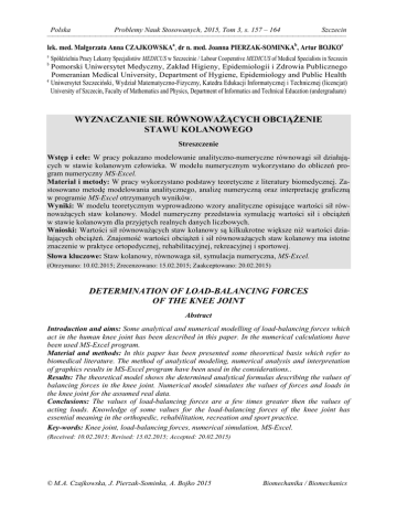 Polska Problemy Nauk Stosowanych, 2015, Tom 3, s. 157 – 164 Szczecin lek. med. Małgorzata Anna CZAJKOWSKAa, dr n. med. Joanna PIERZAK-SOMINKAb, Artur BOJKOc a Spółdzielnia Pracy Lekarzy Specjalistów MEDICUS w Szczecinie / Labour Cooperative MEDICUS of Medical Specialists in Szczecin Pomorski Uniwersytet Medyczny, Zakład Higieny, Epidemiologii i Zdrowia Publicznego Pomeranian Medical University, Department of Hygiene, Epidemiology and Public Health c Uniwersytet Szczeciński, Wydział Matematyczno-Fizyczny, Katedra Edukacji Informatycznej i Technicznej (licencjat) University of Szczecin, Faculty of Mathematics and Physics, Department of Informatics and Technical Education (undergraduate) b WYZNACZANIE SIŁ RÓWNOWAŻĄCYCH OBCIĄŻENIE STAWU KOLANOWEGO Streszczenie Wstęp i cele: W pracy pokazano modelowanie analityczno-numeryczne równowagi sił działających w stawie kolanowym człowieka. W modelu numerycznym wykorzystano do obliczeń program numeryczny MS-Excel. Materiał i metody: W pracy wykorzystano podstawy teoretyczne z literatury biomedycznej. Zastosowano metodę modelowania analitycznego, analizę numeryczną oraz interpretację graficzną w programie MS-Excel otrzymanych wyników. Wyniki: W modelu teoretycznym wyprowadzono wzory analityczne opisujące wartości sił równoważących staw kolanowy. Model numeryczny przedstawia symulację wartości sił i obciążeń w stawie kolanowym dla przyjętych realnych danych liczbowych. Wnioski: Wartości sił równoważących staw kolanowy są kilkukrotne większe niż wartości działających obciążeń. Znajomość wartości obciążeń i sił równoważących staw kolanowy ma istotne znaczenie w praktyce ortopedycznej, rehabilitacyjnej, rekreacyjnej i sportowej. Słowa kluczowe: Staw kolanowy, równowaga sił, symulacja numeryczna, MS-Excel. (Otrzymano: 10.02.2015; Zrecenzowano: 15.02.2015; Zaakceptowano: 20.02.2015) DETERMINATION OF LOAD-BALANCING FORCES OF THE KNEE JOINT Abstract Introduction and aims: Some analytical and numerical modelling of load-balancing forces which act in the human knee joint has been described in this paper. In the numerical calculations have been used MS-Excel program. Material and methods: In this paper has been presented some theoretical basis which refer to biomedical literature. The method of analytical modeling, numerical analysis and interpretation of graphics results in MS-Excel program have been used in the considerations.. Results: The theoretical model shows the determined analytical formulas describing the values of balancing forces in the knee joint. Numerical model simulates the values of forces and loads in the knee joint for the assumed real data. Conclusions: The values of load-balancing forces are a few times greater then the values of acting loads. Knowledge of some values for the load-balancing forces of the knee joint has essential meaning in the orthopedic, rehabilitation, recreation and sport practice. Key-words: Knee joint, load-balancing forces, numerical simulation, MS-Excel. (Received: 10.02.2015; Revised: 15.02.2015; Accepted: 20.02.2015) © M.A. Czajkowska, J. Pierzak-Sominka, A. Bojko 2015 Biomechanika / Biomechanics M.A. Czajkowska, J. Pierzak-Sominka, A. Bojko 1. Podstawy anatomiczne Przedstawmy najpierw krótki zarys anatomii układu mięśniowego kończyny dolnej człowieka (Rys. 1). (b) (a) Rys. 1. Układ mięśni kończyny dolnej (a) – widok z przodu, (b) – widok z tyłu [18] Fig. 1. System of the lower limb muscles (a) – the front view, (b) – the back view [18] Mięśnie dwugłowe uda znajdują się w górnych częściach nóg. U góry przyczepione są do tylnej części biodra i do uda, a u dołu, do jednej z kości podudzia, tzw. strzałki. Każdy mięsień dwugłowy uda powoduje prostowanie nogi w biodrze i zginanie jej w kolanie. Mięśnie płaszczkowate należą do mięśni łydki leżących w tylnej części podudzia. Obydwa mięśnie płaszczkowate prostują stopy w kostce. Każdy z nich jest jednym końcem przyczepiony do kości podudzia, a drugim – do kości piętowej. Mięsień pośladkowy wielki tworzy główną masę pośladkową. Jest przyczepiony do tylnej części miednicy i do kości udowej. Mięsień pośladkowy wielki to silny mięsień, który prostuje nogę w biodrze i ciągnie ją do tyłu podczas chodzenia i wspinania się. Mięśnie półścięgniste znajdują się w tylnych częściach obydwu ud. Podobnie jak mięsień dwugłowy uda i mięsień półbłoniasty, prostują one biodro i zginają kolano. Przyczepione są do tylnej części miednicy (biodra) i do jednej z kości podudzia. Mięśnie przywodzicielskie wielkie znajdują się w górnych częściach nóg, przyciągają nogi do wewnątrz. Każdy przywodziciel wielki jest przyczepiony górnym końcem do miednicy, a dolnym końcem do kości udowej [1]-[4], [6], [8], [10]. 2. Model biomechaniczny Sprawdzanie sprawności mięśni kończyny dolnej, a w szczególności stawu kolanowego przeprowadza się na specjalistycznych przyrządach do ćwiczeń wysiłkowych (Rys. 2). Prostowanie nóg na maszynie sprawnościowej odbywa się w ten sposób, iż blokowane są stopy na uchwycie, tak by były jak najbliżej kostek. Powoli wykonuje się pełny wyprost nóg, ale bez blokowania nóg w kolanach. Następnie wstrzymuje się ruch na moment i równie wolno powraca do pozycji wyjściowej. W celu wykonania ćwiczenia sportowego na wyprostowanie nóg na maszynie, siedzi się na krzesełku maszyny do ćwiczenia mięśni czworogłowych ud, z nogami ugiętymi w kolanach, 158 Wyznaczanie sił równoważących obciążenie stawu kolanowego i stopami pod wałkami ruchomego ramienia maszyny, i z dłońmi na uchwytach. Ćwiczenie to jest stosowane zarówno w okresie zwiększania masy mięśniowej, jak i „tworzenia” rzeźby. W zależności od celu, stosujemy odpowiedni sposób prostowania nóg. Ruchy wolne i znaczny ciężar dobre są na masę, ruchy szybkie i mniejszy ciężar lepsze są na rze