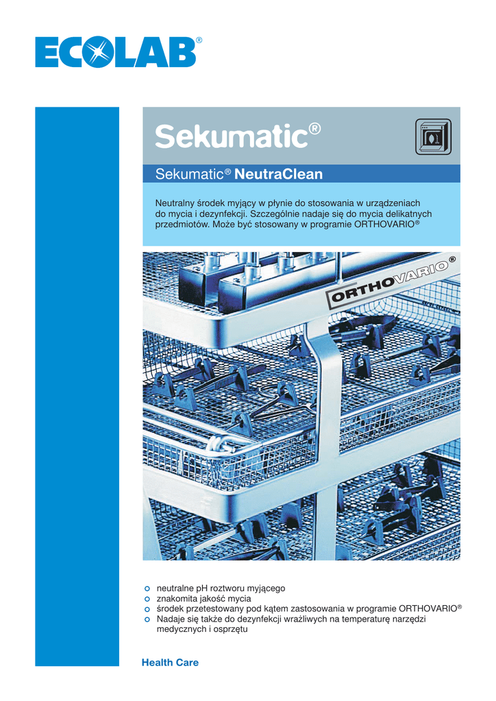 Sekumatic ® NeutraClean Neutralny środek myjący w płynie do stosowania w urządzeniach do mycia i dezynfekcji. Szczególnie nadaje się do mycia delikatnych przedmiotów. Może być stosowany w programie ORTHOVARIO ® RIO ® A OV H T OR neutralne pH roztworu myjącego znakomita jakość mycia środek przetestowany pod kątem zastosowania w programie ORTHOVARIO® Nadaje się także do dezynfekcji wrażliwych na temperaturę narzędzi medycznych i osprzętu Health Care Sekumatic ® NeutraClean Neutralny środek myjący w płynie do stosowania w urządzeniach do mycia i dezynfekcji. Szczególnie nadaje się do mycia delikatnych przedmiotów. Może być stosowany w programie ORTHOVARIO ® Właściwości Obszar zastosowań Korzyści Środek do mycia o neutralnym pH do narzędzi medycznych Szeroka gama zastosowań obejmująca niemal wszystkie materiały stosowane w medycynie Wysoka tolerancja materiałowa Możliwość stosowania do mycia delikatnych materiałów Wysoka jakość mycia typowych zanieczyszczeń medycznych np. krwi, białka i surowicy Środek sprawdzony pod kątem zastosowania w programie ORTHOVARIO ® Nie tworzy osadów na mytych narzędziach i we wnętrzu maszyny Możliwość stosowania w wodzie o różnej twardości Skuteczny już w niskich temperaturach Bardzo dobre właściwości myjące Środek przeznaczony do stosowania w myjniachdezynfektorach w obszarze medycznym, stomatologii i laboratoriach. Do uniwersalnego stosowania w maszynach z pompą dozującą do mycia narzędzi chirurgicznych i mikrochirurgicznych, endoskopów sztywnych, narzędzi z tworzyw sztucznych (np. anestezjologicznych, urologicznych i stomatologicznych), a także do mycia kontenerów i obuwia operacyjnego. Nadaje się do stosowania w metodzie ORTHOVARIO ® i do mycia przy chemo-termicznej dezynfekcji wrażliwych na temperaturę narzędzi i osprzętu (w temp. od 45° - 60°C). Sposób postępowania / dozowanie Skład: Niejonowe środki powierzchniowoczynne, glikol, środki ułatwiające rozpuszczanie i środki wspomagające proces mycia. Do mycia w myjniach-dezynfektorach. W programie ORTHOVARIO ® 3 – 4 ml / l. W zależności od jakości wody ok. 5 – 7 ml / l. Opakowania Jednostkowe Handlowe Symbol Kanister 5 l Karton 3 x 5 l 3025410 W miarę możliwości stosować wodę zdemineralizowaną: - do narzędzi chirurgicznych, mikrochirurgicznych i innych termostabilnych narzędzi medycznych i osprzętu (93°C). W zależności od jakości wody w kolejnym etapie płukania zaleca się neutralizację przy użyciu Sekumatic FNZ lub Sekumatic FNP. - do mycia obuwia operacyjnego i termolabilnych materiałów medycznych w temp. 45° – 60°C. Po myciu dezynfekcję chemo-termiczną przeprowadzić przy użyciu Sekumatic FD lub Sekumatic FDR w temp. 60°C w czasie 5 – 10 minut. Do płukania końcowego zaleca się używania wody zdemineralizowanej. Dane fizykochemiczne (w temp. 20°C) Gęstość 1,03 g/ml Wartość pH koncentratu ok. 8,6 Wartość pH roztworu ok. 7,4 (w wodzie zdemineralizowanej) Wytwórca: Ecolab GmbH & Co. OHG P.O. Box 130405 D-40554 Düsseldorf - Deutschland tel.: (0211) 9893-0; fax: (0211) 9893-384 Autoryzowany przedstawiciel: Ecolab Sp. z o.o. ul. Opolska 100 31-323 Kraków - Polska tel.: 0-12 26 16 100; fax: 0-12 26 16 101 www.ecolab.pl M NC / 0 3 0 7 / P L Oferujemy kompletną paletę produktów oraz systemy gwarantujące utrzymanie wysokiego standardu higieny instytucjonalnej, szpitalnej, tekstylnej i przemysłowej. Zachęcamy do zapoznania się z naszą ofertą i do współpracy. Ecolab - Państwa partner w dziedzinie higieny!