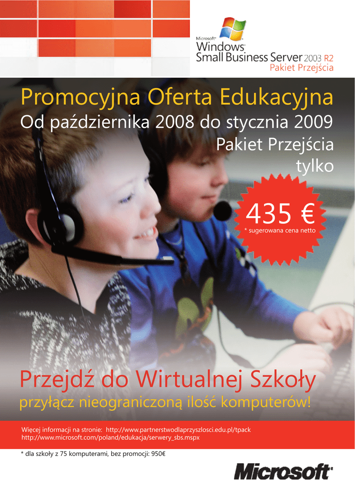 Promocyjna Oferta Edukacyjna Od października 2008 do stycznia 2009 Pakiet Przejścia tylko 435 € * sugerowana cena netto Przejdź do Wirtualnej Szkoły przyłącz nieograniczoną ilość komputerów! Więcej informacji na stronie: http://www.partnerstwodlaprzyszlosci.edu.pl/tpack http://www.microsoft.com/poland/edukacja/serwery_sbs.mspx * dla szkoły z 75 komputerami, bez promocji: 950€ Przejdź do Wirtualnej Szkoły przyłącz nieograniczoną ilość komputerów! Promocja od października 2008 do stycznia 2009 Co to jest Windows Small Business Server 2003 Pakiet Przejścia? Pakiet przejścia (ang. Transition Pack) dla systemu MS Windows SBS 2003 R2 Premium Edition umożliwia zamianę zainstalowanego (skonfigurowanego i działającego) serwera SBS na pełne wersję: systemu serwerowego Windows Server 2003 R2 Standard Edition, oraz wchodzących w skład SBS aplikacji serwerowych Microsoft, jak: SQL Server, Exchange Server, ISA Server. Tym samym znosi wbudowane do systemu SBS ograniczenia, czyniąc go pełnoprawnym systemem serwerowym dającym znaczne możliwości skalowalności w zależności od potrzeb. Kiedy może mi być potrzebny Windows Small Business Server 2003 Pakiet Przejścia? W szkolnych warunkach Pakiet Przejścia jest potrzebny w sytuacji, gdy istnieje potrzeba zniesienia ograniczenia licencyjnego, nie pozwalającego podłączyć do jednego serwera więcej niż 75 stacji roboczych. Mimo, iż liczba 75 komputerów dla szkoły może wydawać się dużą, to biorąc pod uwagę, że szkolna pracownia ponadgimnazjalna dostarczana w ramach projektów EFS liczyła 20 komputerów + serwer, a wiele szkół na przestrzeni kilku lat zostało wyposażonych w trzy takie pracownie oraz jedną bądź kilka pracowni dla szkolnego Centrum Informacji Multimedialnej, to liczba komputerów w szkole zbliża się do tej granicy. Jeżeli weźmiemy pod uwagę także komputery będące stanowiskami pracy nauczycieli w ich salach lekcyjnych, oraz komputery będące na usługach szkolnej administracji, to może się okazać, że w coraz większej ilości szkół maksymalna liczba 75 komputerów już została przekroczona. Warto też wziąć pod uwagę fakt, iż coraz większa liczba nauczycieli i uczniów posiada różnego rodzaju urządzenia mobilne. Coraz częściej opiekun ma do czynienia w szkole z sytuacją, w której dostaje pytania i prośby o możliwość podłączenia takich urządzeń do szkolnej sieci celem wymiany dokumentów i korzystania z sieci Internet. W takich wypadkach liczba urządzeń współpracujących z serwerem i korzystających z zasobów na nim udostępnionych, takich jak dokumenty, drukarki, poczta, miejsce przeznaczone na prywatne strony WWW, może znacząco wzrosnąć w krótkiej perspektywie czasu. Ile kosztuje Windows Small Business Server 2003 Pakiet Przejścia? Cena migracji zależy od liczby posiadanych licencji klienckich SBS. W rzeczywistości Pakiet Przejścia składa się z dwóch produktów: szkoła zakupi dwa Pakiety: jeden dla serwera, zawierający nośnik i licencje migrujące serwer, drugi – tylko dla poszczególnych licencji klienckich. Cena sugerowana Pakietu Przejścia, który zamienia serwer SBS w pojedyncze nielimitowane serwery wynosi w ramach promocji 250€ netto. Przeniesienie pojedynczej stacji roboczej to koszt rzędu ok. 2.5€ netto (to Pakiet Przejścia dla licencji klienckich - CAL). Na pierwszej stronie ulotki określono cenę migracji systemu i stacji dla 75 komputerów. Co daje Windows Small Business Server 2003 Pakiet Przejścia od strony technicznej? Pakiet Przejścia do serwera znosi wszystkie ograniczenia występujące w systemie Windows Small Business Server 2003 (takie jak ograniczenie liczby licencji dostępowych CAL do 75, brak obsługi relacji zaufania w Active Directory, wymuszanie licencji CAL). Pakiet Przejścia do licencji CAL zawiera tylko licencje. Jak się instaluje Pakiet Przejścia? W przypadku pakietu Pakiet Przejścia do serwera, wystarczy uruchomić program Setup (znajdujący się na płycie CD1) w działającym Windows Small Business Server. Pakiet Przejścia dla stacji roboczych nie wymaga instalacji, zawiera jedynie potwierdzenie migracji do licencji dostępowych do poszczególnych serwerów. Czy Pakiet Przejścia przenosi jakieś komponenty serwera na inny serwer fizyczny? Nie, Pakiet Przejścia jedynie usuwa ograniczenia produktu Windows Small Business Server i dokonuje konwersji licencji. Jeśli zdarzy się awaria systemu, jak mogę ponownie zainstalować jeden z komponentów serwera? Jeśli zachodzi potrzeba ponownego zainstalowania lub przeniesienia jednego z komponentów serwera, należy użyć zestawu nośników. Jeśli klient nie dysponuje zestawem nośników, powinien je uzyskać od sprzedawcy (Lista Autoryzowanych Resellerów Edukacyjnych na stronie https://aer.microsoft.com) . Czy po użyciu Pakietu Przejścia mogę w dalszym ciągu korzystać z kreatorów i narzędzi udostępnianych przez Windows Small Business Server? Po zakończeniu procesu wykonywanego przez Pakiet Przejścia, kreatory i narzędzia produktu Windows Small Business Server są nadal dostępne. Można także używać standardowych narzędzi konsoli MMC (Microsoft Management Console) służących do administrowania serwerem. Czy, a jeśli tak, to na jakie wsparcie dotyczące instalacji i konfiguracji programu Pakiet Przejścia mogę liczyć? W ramach współpracy firmy Microsoft oraz Ośrodka Edukacji Informatycznej i Zastosowań Komputerów został przygotowany cały pakiet wsparcia przeznaczonego dla szkolnych opiekunów, którzy zdecydują się na wdrożenie Pakietu Przejścia w swojej placówce. Adres Pomocy Technicznej: http://www.partnerstwodlaprzyszlosci. edu.pl/tpack