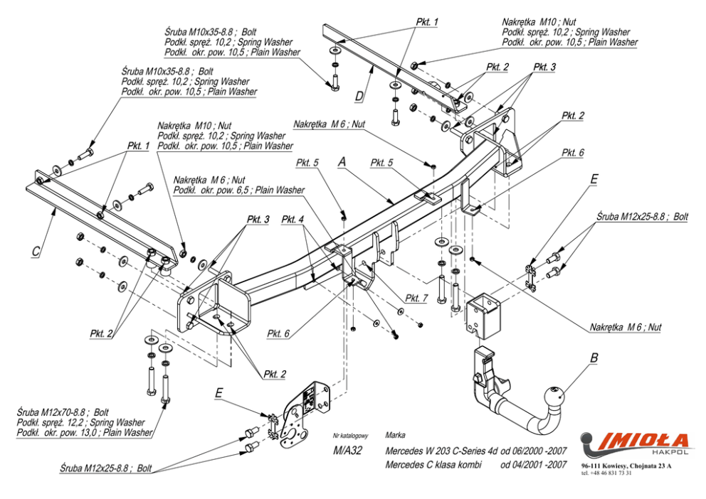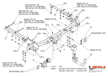 Pkt. 1 Śruba M10x35-8.8 ; Bolt Podkł. spręż. 10,2 ; Spring Washer Podkł. okr. pow. 10,5 ; Plain Washer Nakrętka M10 ; Nut Podkł. spręż. 10,2 ; Spring Washer Podkł. okr. pow. 10,5 ; Plain Washer Pkt. 2 Śruba M10x35-8.8 ; Bolt Podkł. spręż. 10,2 ; Spring Washer Podkł. okr. pow. 10,5 ; Plain Washer Pkt. 3 D Pkt. 2 Nakrętka M 6 ; Nut Nakrętka M10 ; Nut Podkł. spręż. 10,2 ; Spring Washer Pkt. 1 Podkł. okr. pow. 10,5 ; Plain Washer Pkt. 5 A Pkt. 6 Pkt. 5 E Nakrętka M 6 ; Nut Podkł. okr. pow. 6,5 ; Plain Washer Pkt. 3 Śruba M12x25-8.8 ; Bolt Pkt. 4 C Pkt. 7 Pkt. 2 Nakrętka M 6 ; Nut Pkt. 6 B Pkt. 2 E Śruba M12x70-8.8 ; Bolt Podkł. spręż. 12,2 ; Spring Washer Podkł. okr. pow. 13,0 ; Plain Washer Śruba M12x25-8.8 ; Bolt Nr katalogowy Marka M/A32 Mercedes W 203 C-Series 4d od 06/2000 -2007 Mercedes C klasa kombi od 04/2001 -2007 96-111 Kowiesy, Chojnata 23 A tel. +48 46 831 73 31 Gniazdo 7-biegunowe 12V z ruchomymi bolcami Symbol SWW 1135-812 Oznaczenie zacisku 31 L R 54 58L 58R + Zacisk do łączenia przewodów do masy pojazdu do świateł kierunku jazdy lewych do świateł kierunku jazdy prawych do świateł hamowania do świateł pozycyjnych lewych do świateł pozycyjnych prawych tylne światła przeciwmgłowe Moment skręcający dla śrub i nakrętek (8.8) Torgue settings for nuts and bolts (8.8) M8 25 Nm M12 M10 55 Nm M14 M16 195 Nm ZESTAW ŚRUBOWY: FASTENING MEANS: Kolory Biały , white Żółty , yellow zielony, green czerwony, red czarny, black brązowy, brown niebieski , blue -M12x40 8.8 -M12x70 8.8 -M12x25 12.9 -M10x35 8.8 -M12 MERCEDES C-KLASA sed., com. 00 NO CAT. M/A32 -M10 INSTRUKCJA MONTAŻU: FITTING INSTRUCTION: • • • • • • • • • • - Ø 36 10szt. 10szt -M12 6szt -M10 10szt -M10 6szt 2szt 85 Nm 135 Nm • • • • 2szt 2szt 6szt 4szt 6szt Odkręcić mocowanie tłumika od obudowy wewnętrznej zderzaka. Odkręcić zderzak wraz z obudową wewnętrzną zderzaka (nie będzie już wykorzystana) Odkręcić tłumik oraz osłonę termiczną. Wyjąć gumowe zaślepki otworów podłużnic. W podłużnice wsunąć elementy C i D i poprzez technologiczne otwory w podłużnicach przykręcić lekko śrubami M10x35 8.8 (pkt 1). Belkę haka przykręcić do zderzaka wykorzystując śruby M6 (pozostały one po odkręceniu wypełnienia zderzaka). Belkę główną haka A wraz ze zderzakiem przykręcić lekko do tylnego pasa śrubami M10x35 8.8 (pkt 3) oraz do elementów: C śrubami M12x70 8.8 (pkt 2) i D śrubami M12x40 8.8 (pkt 2). Dokręcić wszystkie śruby z momentem wg tabeli. Do elementów przy belce głównej haka przykręcić mocowanie tłumika. Zamontować osłonę termiczną oraz tłumik. Dokręcić kulę i blachę gniazda elektrycznego śrubami M12x25 8.8/ obowiązkowo zastosować podkładkę zębatą E/ . Podłączyć instalację elektryczną. • • • • • • • • • • Unscrew the reinforcement of the damper from the inside casing of the bumper. Unscrew the bumper and its inside casing (it will not be used any more). Unscrew the damper and thermal shield. Remove the rubber plugs from the holes of the metal clamps. Insert the elements C and D in the metal clamps and screw slightly with bolts M10x35 8.8, through the technological holes in the metal clamps (point 1). Screw the main bar to the bumper using bolts M6 (they stayed after twisting off the filling of the bumper ). Screw the main bar A and bumper to the rear belt with bolts M10x35 8.8 (point 3) and to the elements: C with bolts M12x70 8.8 (point 2) and D with bolts M12x40 8.8 (point 2). Tighten all the bolts according to the torque setting- see the table. Screw the reinforcement of the damper to the elements by the main bar. Assemble the thermal shield and damper. Fix the ball and electric plate with bolts M12x25 8.8/ it is obligatory to use the toth washer E/. Connect the electric wires. WARUNKI EKSPLOATACJI. Zakład Produkcyjno Handlowo Usługowy 96-111 Kowiesy, Chojnata 23A tel. (0-46) 831 73 31, fax 831 74 29 www.hakpol.pl POLAND Zaczep kulowy posiada tabliczkę znamionową obowiązującą użytkownika w zakresie prawidłowego i bezpiecznego obciążenia. R =1700 kg D= 10,00 kN ⇓ Zaczep kulowy do samochodu: S = 75kg MERCEDES C-KLASA (W-203) sed.. 06/00 - 07 MERCEDES C-KLASA (W-203) com. 04/01 - 07 Nr katalogowy M/A32 KARTA GWARANCYJNA Warunki gwarancyjne i postępowanie reklamacyjne 1. 2. 3. 4. 5. Producent zobowiązuje się do wymiany wadliwego wyrobu w okresie 12 miesięcy od daty zakupu lub 24 miesięcy od daty produkcji, w terminie 14-dniowym. Wymianę wadliwego wyrobu dokonuje się w miejscu zakupu lub bezpośrednio u producenta. Nie podlega reklamacji gwarancyjnej zaczep kulowy, którego uszkodzenie nastąpiło: a) wskutek wypadku, b) wskutek nieprzestrzegania zasad prawidłowej obsługi, eksploatacji, konserwacji podanych w instrukcji. Karta gwarancyjna bez daty sprzedaży , pieczęci sklepu lub warsztatu montującego, nie może służyć jako podstawa do reklamacji. Wskutek nieprawidłowego zamontowania zaczepu. Przeznaczenie Zaczep kulowy zamontowany do samochodu przeznaczony jest do holowania przyczep towarowych i turystycznych. W czasie całej eksploatacji należy poszczególne elementy zaczepu kulowego utrzymywać w należytym stanie technicznym (właściwie dokręcone elementy złączone, całość konstrukcji zabezpieczona przed działaniem korozji). Przyczepa musi być połączona z zaczepem kulowym dodatkowym złączem o odpowiedniej wytrzymałości (łańcuch, linka z zapięciem). UWAGA Uszkodzenia mechaniczne zaczepu kulowego np. w wyniku najechania, zaczepienia o przeszkodę, wykluczają dalszą eksploatację zaczepu. Uszkodzony zaczep kulowy nie może być naprawiany. Sprawdzić śruby mocujące zaczep kulowy po około 1000 km przebiegu eksploatacji. Nacisk pionowy na kulę zaczepu nie może przekroczyć 75 kg. Po zamontowaniu haka kulowego należy dokonać przeglądu na stacji diagnostycznej! data sprzedaży............................ nr re