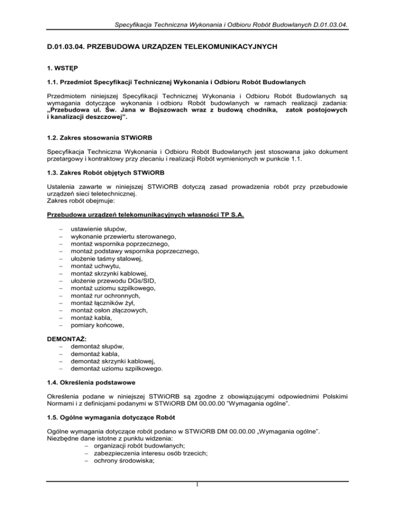 Specyfikacja Techniczna Wykonania i Odbioru Robót Budowlanych D.01.03.04. D.01.03.04. PRZEBUDOWA URZĄDZEN TELEKOMUNIKACYJNYCH 1. WSTĘP 1.1. Przedmiot Specyfikacji Technicznej Wykonania i Odbioru Robót Budowlanych Przedmiotem niniejszej Specyfikacji Technicznej Wykonania i Odbioru Robót Budowlanych są wymagania dotyczące wykonania i odbioru Robót budowlanych w ramach realizacji zadania: „Przebudowa ul. Św. Jana w Bojszowach wraz z budową chodnika, zatok postojowych i kanalizacji deszczowej”. 1.2. Zakres stosowania STWiORB Specyfikacja Techniczna Wykonania i Odbioru Robót Budowlanych jest stosowana jako dokument przetargowy i kontraktowy przy zlecaniu i realizacji Robót wymienionych w punkcie 1.1. 1.3. Zakres Robót objętych STWiORB Ustalenia zawarte w niniejszej STWiORB dotyczą zasad prowadzenia robót przy przebudowie urządzeń sieci teletechnicznej. Zakres robót obejmuje: Przebudowa urządzeń telekomunikacyjnych własności TP S.A. ustawienie słupów, wykonanie przewiertu sterowanego, montaż wspornika poprzecznego, montaż podstawy wspornika poprzecznego, ułożenie taśmy stalowej, montaż uchwytu, montaż skrzynki kablowej, ułożenie przewodu DGs/SID, montaż uziomu szpilkowego, montaż rur ochronnych, montaż łączników żył, montaż osłon złączowych, montaż kabla, pomiary końcowe, DEMONTAŻ: demontaż słupów, demontaż kabla, demontaż skrzynki kablowej, demontaż uziomu szpilkowego. 1.4. Określenia podstawowe Określenia podane w niniejszej STWiORB są zgodne z obowiązującymi odpowiednimi Polskimi Normami i z definicjami podanymi w STWiORB DM 00.00.00 ”Wymagania ogólne”. 1.5. Ogólne wymagania dotyczące Robót Ogólne wymagania dotyczące robót podano w STWiORB DM 00.00.00 „Wymagania ogólne”. Niezbędne dane istotne z punktu widzenia: organizacji robót budowlanych; zabezpieczenia interesu osób trzecich; ochrony środowiska; 1 Specyfikacja Techniczna Wykonania i Odbioru Robót Budowlanych D.01.03.04. warunków bezpieczeństwa pracy; zaplecza dla potrzeb Wykonawcy; warunków organizacji ruchu; zabezpieczenia chodników i jezdni, podano w STWiORB DM 00.00.00 „Wymagania ogólne”. 1.6. Wspólny Słownik Zamówień (CPV) Kody grup, klas i kategorii robót Wspólnego Słownika Zamówień (CPV) dotyczących przedmiotu zamówienia podano w STWiORB DM 00.00.00 „Wymagania ogólne”. 2. MATERIAŁY 2.1. Ogólne wymagania dotyczące materiałów Ogólne wymagania dotyczące materiałów, ich pozyskania i składowania podano w STWiORB DM 00.00.00 ”Wymagania ogólne”. Jakakolwiek nazwa handlowa użyta w STWiORB lub Dokumentacji Projektowej oznaczać będzie definicję standardu a nie specyficzny produkt do zastosowania w projekcie. Wszystkie materiały przewidywane do wbudowania będą zgodne z postanowieniami Kontraktu, wymaganiami i warunkami Specyfikacji Technicznych i poleceniami Inżyniera. Wszelkie użyte w Dokumentacji Projektowej nazwy producentów i typ urządzeń należy rozumieć jako przykładowe. Dopuszczone jest stosowanie równoważnych materiałów i urządzeń innych producentów o parametrach technicznych takich samych bądź lepszych po uzyskaniu akceptacji Inżyniera, Inwestora i właściciela przebudowywanych urządzeń. 2.2. Piasek Piasek do układania kanalizacji w ziemi powinien odpowiadać wymaganiom PN-B-11113. 2.3. Kable Typy kabli telekomunikacyjnych, ich pojemności i średnice żył ustala się w uzgodnieniu z urzędem telekomunikacyjnym odpowiednim dla danego terenu. Zastosowane kable powinny odpowiadać wymogom odpowiednich norm. Kable telekomunikacyjne dostarczane są na bębnach drewnianych, których wielkości określone są w normie PN-76/D-79353 i zależą od średnicy kabla i jego powłoki. Każdy bęben jest nacechowany numerem wielkości i numerem ewidencyjnym oraz następującymi znakami i napisami: nazwą i znakiem fabrycznym producenta, strzałką wskazującą kierunek obrotów bębna przy toczeniu. Do jednej z tarcz bębna przymocowana jest tabliczka, na której podany jest typ kabla, jego długość i ciężar oraz producent. Należy zastosować następujące typy kabli: XzTKMXpwn 5×4×0,5; XzTKMXpwn 3×2×0,5; 2.4. Rury ochronne Należy zastosować następujące rury ochronne: HDPE 110/6,3; dzielona HDPE 122/110 (A 120 PS); kolanko dzielone KF 120 PS Ø122/110; dzielona HDPE 160/141 (A 160 PS); Rury należy przechowywać na utwardzonym placu, zabezpieczonych przed działaniem sił mechanicznych. 2 w nienasłonecznionych miejscach Specyfikacja Techniczna Wykonania i Odbioru Robót Budowlanych D.01.03.04. 2.5. Słupy Należy zastosować istniejące słupy drewniane: pojedynczy, uszczudlony z osprzętem, bliźniaczy, uszczudlony z osprzętem, 2.6. Skrzynka kablowa Należy zastosować istniejącą skrzynkę kablową. 2.7. Pozostałe elementy Należy zastosować uziom nierdzewny, szpilkowy Ø 18mm o długości umożliwiającej uzyskanie rezystancji uziemienia nie przekraczającej 10Ω. Należy zastosować pozostałe wyroby zgodnie z projektem: tyczka drewniana stosowana awaryjnie przy konstrukcjach tymczasowych lub awaryjnych wraz z osprzętem, uchwyt typu PA 07-250, uchwyt typu PA 06-200, 2.8. Demontaż Należy zdemontować następujące wyroby: słup drewniany pojedynczy, uszczudlony z osprzętem, słup drewniany bliźniaczy, uszczudlony z osprzętem, tyczka drewniana stosowana awaryjnie przy konstrukcjach tymczasowych lub awaryjnych wraz z osprzętem, kabel linii napowietrznej, skrzynka kablowa, uziom szpilkowy, Wszystkie materiały z demontażu nie wykorzystane ponownie do zabudowy należy przekazać do magazynu właściciela urządzeń lub poddać utylizacji. 3. SPRZĘT 3.1. Ogólne wymagania dotyczące sprzętu Ogólne wymagania dotyczące sprzętu podano w STWiORB DM 00.00.00 ”Wymagania ogólne”. 3.2. Sprzęt do budowy sieci teletechnicznej Do budowy sieci teletechnicznej należy stosować: - ubijak spalinowy, - koparkę jednonaczyniową kołową, - żuraw samochodowy, - inny sprzęt 