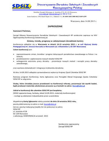 Siedziba Zarządu Głównego ul. Jasielska 47/8, 02-128 Warszawa www.sdsiz.pl; [email protected] tel. 500 44 72 62 konto bankowe: ING Bank Śląski S.A., Oddział 173, 30 1050 1038 1000 0022 8109 4199 Warszawa, dnia 14.08.2015 r. ZAPROSZENIE Szanowni Państwo, Zarząd Główny Stowarzyszenia Doradców Szkolnych i Zawodowych RP serdecznie zaprasza na XXV Ogólnopolską Konferencję Szkoleniową pt. Zmiany, trendy, prognozy w całożyciowym doradztwie kariery Konferencja odbędzie się w Warszawie w dniach 14-15 września 2015 r. w auli Wyższej Szkoły Pedagogicznej im. Janusza Korczaka w Warszawie (ul. Urbanistów 3, 02-397 Warszawa) Celem konferencji jest: zaprezentowanie zmian, trendów i prognoz dotyczących poradnictwa zawodowego w Polsce i na świecie, przedstawienie i zaplanowanie nowych działań SDSiZ RP wzbogacenie warsztatu pracy doradcy - prezentacje nowych metod i narzędzi pracy doradcy zawodowego, oraz wymiana doświadczeń i integracja środowiska doradców. W dniu 14.09.2015 odbędzie sprawozdawczo wyborczy Krajowy Zjazd Członków SDSiZ RP Ramowy program Konferencji, Karta Zgłoszenia oraz Porządek Obrad Krajowego Zjazdu Członków SDSiZ RP w załączeniu. Osoby, które chciałyby jeszcze przedstawić na Konferencji referaty, prezentacje lub wyniki badań, bądź przekazać materiały szkoleniowe proszone są o kontakt na adres: [email protected] Udział w konferencji dla członków SDSiZ RP jest bezpłatny. (SDSiZ zapewnia kawę, herbatę, obiad 14.09.2015, materiały konferencyjne) - noclegi są załatwiane indywidualnie przez uczestników Wypełnioną Kartę Zgłoszenia należy przesłać do dnia 10 września 2015 roku, pocztą elektroniczną na adres e-mail: [email protected] lub ew. pocztą tradycyjną (zwykły list nie polecony) na adres: SDSiZ RP ul. Jasielska 47/8 02-128 Warszawa z adnotacją: KONFERENCJA wrzesień 2015 Serdecznie zapraszamy Zarząd SDSiZ RP