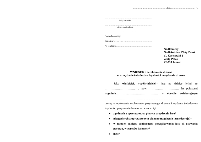 …………………………………………dnia…………….………….…… r . …………………………………………..……………............ imię i nazwisko ……………………………………………………………….. miejsce zamieszkania ……………………………………………………………….. Dowód osobisty: Seria i nr ……………...………………………………... Nr telefonu ……………………………………………….. Nadleśniczy Nadleśnictwa Złoty Potok ul. Kościuszki 2 Złoty Potok 42-253 Janów WNIOSEK o ocechowanie drewna oraz wydanie świadectwa legalności pozyskania drewna Jako właściciel, współwłaściciel* lasu na działce leśnej nr …………….…………….. o pow. ……….………………… ha położonej w gminie…………...………………………… w obrębie ewidencyjnym …………………………………............................................................................. proszę o wykonanie cechowanie pozyskanego drewna i wydanie świadectwa legalności pozyskania drewna w ramach cięć: zgodnych z uproszczonym planem urządzenia lasu* niezgodnych z uproszczonym planem urządzenia lasu (decyzje)* w ramach zabiegu sanitarnego porządkowania lasu tj. usuwania posuszu, wywrotów i złomów* inne* 1. …………………………………………………………………………...…... Jednocześnie świadomy odpowiedzialności karnej wynikającej z art. 233 Kodeksu Karnego, który stanowi, że ,,Kto składając zeznania mające służyć za dowód w postępowaniu sądowym lub innym postępowaniu prowadzonym na podstawie ustawy, zeznaje nieprawdę lub zataja prawdę, podlega karze pozbawienia wolności do lat 3” oświadczam, że las którego dotyczy niniejszy wniosek jest: - moją własnością a realizowane prawo pozyskania drewna nie jest w żaden sposób ograniczone prawami osób trzecich*, - stanowi współwłasność, a pozostali współwłaściciele zostali przeze mnie powiadomieni o zamiarze pozyskania drewna i wyrażają na nie zgodę*. Do wniosku dołączam zgodę podpisaną przez wszystkich współwłaścicieli wraz z ich aktualnymi adresami zamieszkania. imię i nazwisko, adres zamieszkania ……………………………... data i podpis współwłaściciela 2. …………………………………………………………………………...…... imię i nazwisko, adres zamieszkania ……………………………... data i podpis współwłaściciela 3. …………………………………………………………………………...…... imię i nazwisko, adres zamieszkania ………………………………………………………….. ……………………………... (podpis właściciela) data i podpis współwłaściciela Nadleśnictwo Złoty Potok nie ponosi konsekwencji prawnych z tytułu błędnego wskazania na gruncie działki lub jej granic oraz nie bierze na siebie odpowiedzialności za ewentualne spory wynikające z naruszenia praw własności lub innych należności majątkowych. 4. …………………………………………………………………………...…... imię i nazwisko, adres zamieszkania ……………………………... data i podpis współwłaściciela * niepotrzebne skreślić Oświadczenie współwłaścicieli działki 5. …………………………………………………………………………...…... imię i nazwisko, adres zamieszkania Ja, niżej podpisany oświadczam, że jako współwłaściciel działki ew. nr ……………………………... …………………….. położonej w obr ew. ………………………………………. wyrażam zgodę dla p. …………………………..……………………………..…, data i podpis współwłaściciela 6. …………………………………………………………………………...…... imię i nazwisko, adres zamieszkania zam. ……………………………….…………………………………………..….. na pozyskanie drewna z lasu znajdującego się na w/w działce oraz wystąpienie do Nadleśniczego Nadleśnictwa Złoty Potok o dokonanie ocechowania i legalizacji pozyskanego drewna. ……………………………... data i podpis współwłaściciela Pouczenie: Do rozporządzania rzeczą wspólną – zgodnie za art. 199 Kodeksu Cywilnego – oraz do innych czynności, które przekraczają zakres zwykłego zarządu, potrzebna jest zgoda wszystkich współwłaścicieli. Spory wynikłe z naruszenia własności i współwłasności rozstrzygają sądy powszechne MSZ