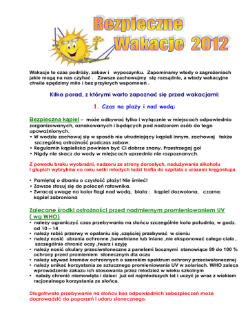 Wakacje to czas podróży, zabaw i wypoczynku. Zapominamy wtedy o zagrożeniach jakie mogą na nas czyhać . Zawsze zachowujmy się rozsądnie, a wtedy wakacyjne chwile spędzimy miło i bez przykrych wspomnień . Kilka porad, z którymi warto zapoznać się przed wakacjami: 1. Czas na plaży i nad wodą: Bezpieczna kąpiel – może odbywać tylko i wyłącznie w miejscach odpowiednio zorganizowanych, oznakowanych i będących pod nadzorem osób do tego upoważnionych. • W wodzie zachowuj się w sposób nie utrudniający kąpieli innym, zachowaj także s szczególną ostrożność podczas zabaw. • Regulamin kąpieliska powinien być Ci dobrze znany. Przestrzegaj go! • Nigdy nie skacz do wody w miejscach uprzednio nie rozpoznanych. Z powodu braku wyobraźni, nadzoru ze strony dorosłych, nadużywania alkoholu i głupich wybryków co roku setki młodych ludzi trafia do szpitala z urazami kręgosłupa. • Pamiętaj o dbaniu o czystość plaży! Nie śmieć! • Zawsze stosuj się do poleceń ratownika. • Zwracaj uwagę na kolor flagi nad wodą, biała : kąpiel dozwolona, czarna: kąpiel zabroniona Zalecane środki ostrożności przed nadmiernym promieniowaniem UV ( wg WHO) • należy ograniczyć czas przebywania na słońcu szczególnie koło południa, w godz. od 10 – 14 • należy robić przerwy w opalaniu się ,częściej przebywać w cieniu • należy nosić ubrania ochronne ,bawełniane lub lniane ,nie eksponować całego ciała , szczególnie chronić oczy ,twarz i szyję • należy nosić okulary przeciwsłoneczne z panelami bocznymi stanowiące 99 do 100 % ochrony przed promieniem słonecznym dla oczu • należy używać kremów ochronnych o szerokim spektrum ochrony przeciwsłonecznej • należy unikać korzystania ze sztucznego promieniowania UV w solariach. WHO zaleca wprowadzenie zakazu ich stosowania przez młodzież w wieku szkolnym • należy chronić niemowlęta i dzieci już od najmłodszych lat i uczyć je wraz z wiekiem racjonalnego korzystania ze słońca. Długotrwałe przebywanie na słońcu bez odpowiednich zabezpieczeń może doprowadzić do poparzeń i udaru słonecznego. 2. Leśne wędrówki oraz rajdy piesze: Jeśli wybierasz się na wycieczkę pieszą pamiętaj o: a. Zabraniu ze sobą parasolki lub dodatkowej odzieży ochronnej (zmienność pogody). b. Włożeniu odpowiedniego obuwia. c. Wcześniejszym przygotowaniu jedzenia (kanapki) i napojów na drogę. Jeśli wybierasz się zaś na wycieczkę rowerową pamiętaj o: Podczas występowania nadmiernego promieniowania słonecznego istnieje bardzo duże zagrożenie pożarami, dlatego kiedy spacerujesz po lesie zachowaj szczególną ostrożność i staraj się nie zaprószyć ognia. Jeśli wybierasz się zaś na wycieczkę do lasu pamiętaj aby : - zachowywać się cicho, w lesie żyje wiele zwierząt nie przeszkadzaj im; - nie bawić się ogniem, nie rozpalać ognisk ponieważ można spowodować pożar; - nie zaśmiecać lasu (nie rzucać papierków, butelek); - nie łamać gałęzi drzew i krzaków Kiedy wędrujesz istnieje prawdopodobieństwo, że spotkasz na swej drodze dzikie zwierzęta. Staraj się unikać bezpośredniego kontaktu z nimi gdyż mogą one być zakażone WŚCIEKLIZNĄ . Nawet zwierzę udomowione może pogryźć!!! Kiedy nie uda Ci się uniknąć konfrontacji niezwłocznie zgłoś się do LEKARZA!!! Pieszym wycieczkom zawsze sprzyja ryzyko napotkania na swej drodze KLESZCZA. Należy zatem pamiętać o: • Odpowiedniej odzieży, zakrywającej w jak największym stopniu ciało. • Dokładnym przejrzeniu całej powierzchni ciała oraz ubrania po wędrówce, gdyż może właśnie „ dopadł Cię kleszcz”. Jeśli kleszcz znajduje się na Twej skórze natychmiast go usuń. W razie, gdy po usunięciu kleszcza, w ciągu kilkunastu dni pojawi się wokół miejsca ukąszenia choćby niewielki odczyn zapalny – ZGŁOŚ SIĘ DO LEKARZA ! 3. Odpoczynek w domku letniskowym, campingu, namiocie czy hotelu: W każdym z tych miejsc obowiązują podobne zasady jeśli chodzi o sporządzanie i spożywanie posiłków. Dlatego zawsze : • Dokładnie umyj ręce przed posiłkiem i po wyjściu z toalety. • Właściwie przechowuj produkty spożywcze, szczególnie łatwopsujące się. • Przestrzegaj terminów przydatności do spożycia żywności i napojów. • Dokładnie oczyszczaj surowce. • Przestrzegaj czasu i temperatury podczas obróbki termicznej. 4. Wieczorne rozrywki: Wakacje sprzyjają nocnym eskapadom podczas których napotykasz nowych ludzi, możesz mieć kontakt z narkotykami czy też przedstawicielami sekt. Znajdując się w nowej sytuacji możesz podjąć pochopną decyzję związaną np. ze stosunkami seksualnymi. W tym wypadku musisz pamiętać, że takie niedojrzałe zachowanie wiąże się z poważnymi, niekiedy bardzo przykrymi konsekwencjami. Jeśli dwoje ludzi (kobieta i mężczyzna) odbyło ze sobą stosunek seksualny, to zawsze istnieje ryzyko: ciąży, zakażenia się chorobą przenoszoną drogą płciową, zakażenia się wirusem HIV. Kiedy wędrujesz o późnej porze zawsze pamiętaj by cenne rzeczy zostawić pod kontrolą osób dorosłych i ZAWSZE mów im dokąd wychodzisz. Unikaj zawierania znajomości z przygodnymi ludźmi, którzy mogą zaprosić Cię na przejażdżkę samochodem bądź zachęcać do spożycia produktów spożywczych niewiadomego pochodzenia i składu. Pod żadnym pozorem NIE WSIADAJ DO SAMOCHODU NIEZNAJOMYCH OSÓB! NIE PRZYMUJ TAKŻE POSIŁKÓW OD NIEZNAJOMYCH! Gdy będziesz musiał wezwać pomocy - dzwoń pod numery: Z telefonu stacjonarnego lub komórkowego: 997, 998, 999 oraz 112 Przestrzeganie tych kilku podstawowych zasad przyczyni się do zwiększenia naszego bezpieczeństwa. Oświata Zdrowotna i Promocja Zdrowia PSSE w Kutnie Źródło: Internet.