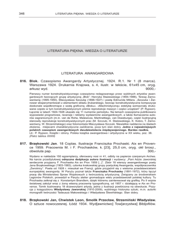 346 LITERATURA PIĘKNA. WIEDZA O LITERATURZE LITERATURA PIĘKNA. WIEDZA O LITERATURZE LITERATURA AWANGARDOWA 816. Blok. Czasopismo Awangardy Artystycznej. 1924. R.1. Nr 1 (8 marca). Warszawa 1924. Drukarnia Krajowa, s. 4, ilustr. w tekście, 61x45 cm, oryg. arkusz wyd. 9000,Pierwszy numer konstruktywistycznego czasopisma redagowanego przez wybitnych artystów awangardowych tworzących grupę artystyczną „Blok”: Henryka Stażewskiego (1894-1988), Teresę Żarnowerównę (1895-1950), Mieczysława Szczukę (1898-1927) i poetę Edmunda Millera. „Szczuka i Żarnower eksperymentowali z elementami składu drukarskiego, tworząc konstruktywistyczne kompozycje doskonale współbrzmiące z szatą graficzną »Bloku«. »Machinistyczną« estetykę wzmacniały drukowane często w tym konstruktywistycznym piśmie reprodukcje maszyn i części urządzeń” (P. Rypson). Łącznie w latach 1924-1926 ukazało się 11 numerów periodyku. Na łamach czasopisma publikowano wypowiedzi programowe, recenzje i reklamy wydawnictw awangardowych, a także tłumaczenia autorów zagranicznych (m.in. van de Rohe, Malewicza, Martinettiego, van Doesburga), część ilustracyjną stanowiły reprodukcje konstruktywistycznych prac (M. Szczuki, H. Stażewskiego, K. Kobro, T. Żarnowerówny, W. Strzemińskiego) oraz fotomontaże Mieczysława Szczuki. Niewielkie naddarcia na śladach złożenia, miejscami charakterystyczne zażółcenia, poza tym stan dobry. Jedno z najważniejszych polskich czasopism awangardowych dwudziestolecia międzywojennego. Bardzo rzadkie. Lit.: P. Rypson, Książki i strony. Polska książka awangardowa i artystyczna w XX wieku, poz. 38. (Patrz tablica XXXII) 817. Brzękowski Jan. 18 Coplas. Ilustracje Franciszka Prochaski. Aix en Provence 1959. Pracownia M. i F. Prochasków, k. [23], 25,0 cm, oryg. okł brosz., obwoluta pap. 300,Wydano w nakładzie 150 egzemplarzy, oferowany nosi nr 41, odbity na papierze czerpanym Arches. Na karcie przedtytułowej odręczna dedykacja autora ilustracji i wydawcy: „Pani Adzie Jaworskiej serdecznie przyjazny F. Prochaska Aix en Prov 1959 [...]”. Zbiór 18 wierszy awangardowego poety Jana Brzękowskiego (1903-1983), członka krakowskiej grupy poetyckiej Awangarda, współpracownika „Zwrotnicy”. Poeta od 1928 r. mieszkał we Francji, gdzie przyjaźnił się z wieloma przedstawicielami europejskiej awangardy. W Paryżu poznał także Franciszka Prochaskę (1891-1972), który łączył pracę dla Ministerstwa Spraw Wojskowych z twórczością artystyczną. Związany ze środowiskiem Legionów Polskich, prowadził w Paryżu atelier gromadzące wielu przedstawicieli polskiej kultury. Tu Prochaska zetknął się z Konstantym Brandlem, dzięki któremu zainteresował się grafiką. Po II wojnie światowej założył wraz z żoną własną pracownię typograficzną, od 1957 r. działającą w Aix en Provence. Tomik ilustrowany 18 drzeworytami artysty, jedna z ilustracji powtórzona na obwolucie. Pozycja z księgozbioru Władysławy Jaworskiej (1910-2009), wybitnego historyka sztuki, m.in. autorki monografii twórczości Tadeusza Makowskiego i Władysława Ślewińskiego. Stan dobry. 818. Brzękowski Jan, Chwistek Leon, Smolik Przecław, Strzemiński Władysław. O sztuce nowoczesnej. Łódź 1934. Wyd[awnictwo] Tow[arzystwa] Bibljofilów. LITERATURA PIĘKNA. WIEDZA O LITERATURZE 818. O sztuce nowoczesnej. 1934. 347 820. B. Jasieński. Palę Paryż. 1929. „Drukarnia Polska” Ludomira Mazurkiewicza, s. [4], 93, [1], 22 cm, oryg. okł. brosz. 2000,Jedna z najważniejszych prac teoretycznych awangardy polskiej dwudziestolecia międzywojennego. Wydano w nakładzie 300 egzemplarzy na ręcznie czerpanym papierze z papierni Franciszka Jeziorańskiego w Dąbrowicy. Siódma publikacja Towarzystwa Bibliofilów w Łodzi. Zawiera cztery artykuły: Jana Brzękowskiego „Nowa sztuka na zachodzie”, Leona Chwistka „Tragedia naturalizmu”, Przecława Smolika „Sztuka a rzeczywistość” i Władysława Strzemińskiego „Sztuka nowoczesna w Polsce”. Okładka i karta tytułowa według projektu Władysława Strzemińskiego. Okładka zakurzona i zaplamiona, wewnątrz stan bardzo dobry. (Patrz ilustracja) 819. Jasieński Bruno. Palę Paryż. Powieść. [Wstęp Juliusz Kaden-Bandrowski]. Warszawa 1929. Towarzystwo Wydawnicze „Rój”, s. 325, [3], 18 cm, opr. z epoki ppł., zach. oryg. okł. pap. 900,Kontrowersyjna powieść Brunona Jasieńskiego (1901-1938) – poety, prozaika, powieściopisarza, jednego z pierwszych polskich futurystów. Autor (właśc. Wiktor Bruno Zysman) założył w 1919 r., wraz ze Stanisławem Młodożeńcem i Tytusem Czyżewskim, studencki klub futurystów „Katarynka”, współtworzył pierwsze jednodniówki futurystów, uczestniczył w licznych wieczorach poetyckich futurystów. Jasiński we wczesnej twórczości przeciwstawiał się założeniom estetyzującej poezji młodopolskiej, do swych utworów wprowadził nowatorskie eksperymenty formalne: fonetyczną pisownię, neologizmy, eksperymenty wersyfikacyjne, łamanie składni. Po opublikowaniu jesienią 1928 r. przekładu oferowanej powieści na łamach paryskiej „L’Humanité” Jasieński został wydalony z granic Francji. W 1930 r. przyjął obywatelstwo rosyjskie i zamieszkał w Moskwie. W lipcu 1937 r. został aresztowany, po rozprawie rozstrzelany 17 września 1938 r. Na grzbiecie opr. superekslibris literowy „A. G. O.” Pod przedmową Kaden-Bandrowskiego odręczna, współczesna nota w jęz. francuskim. Stan bardzo dobry. Rzadkie w takim stanie. (Patrz tablica XXXII) 348 LITERATURA PIĘKNA. WIEDZA O LITERATURZE 821. Miesięcznik Literacki. 1930. 822. Miesięcznik Literacki. 1930. 820. Jasieński Bruno. Je brûle Paris. Roman. Paris (Paryż) 1929. Ernest Flammarion, s. 284, [2], 18,5 cm, oryg. okł. brosz. 200,Francuski przekład kontrowersyjnej powieści „Palę Paryż” Brunona Jasieńskiego (1901-1938) – poety, prozaika, powieściopisarza. Nieznaczne otarcia oprawy, p