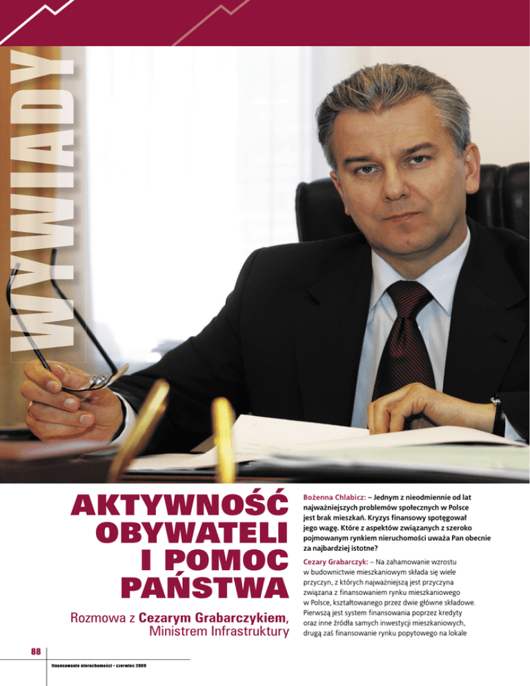 AKTYWNOŚĆ OBYWATELI I POMOC PAŃSTWA Rozmowa z Cezarym Grabarczykiem, Ministrem Infrastruktury 88 finansowanie nieruchomości • czerwiec 2009 Bożenna Chlabicz: – Jednym z nieodmiennie od lat najważniejszych problemów społecznych w Polsce jest brak mieszkań. Kryzys finansowy spotęgował jego wagę. Które z aspektów związanych z szeroko pojmowanym rynkiem nieruchomości uważa Pan obecnie za najbardziej istotne? Cezary Grabarczyk: – Na zahamowanie wzrostu w budownictwie mieszkaniowym składa się wiele przyczyn, z których najważniejszą jest przyczyna związana z finansowaniem rynku mieszkaniowego w Polsce, kształtowanego przez dwie główne składowe. Pierwszą jest system finansowania poprzez kredyty oraz inne źródła samych inwestycji mieszkaniowych, drugą zaś finansowanie rynku popytowego na lokale WYWIADY Foto C. Rogiński / CIR B.Ch.: Które z problemów dotyczących rynku mieszkaniowego najbardziej Pana poruszają i w jakich punktach widzi Pan rolę Ministerstwa Infrastruktury? Jaki rodzaj aktywności w tym zakresie Pan preferuje i przewiduje? mieszkalne, szczególnie w tym segmencie, który wiąże się z zaspokajaniem potrzeb mieszkaniowych. W tej sytuacji można powiedzieć tak: kumulowanie się problemów z obu tych składowych odbija się wprost na reakcjach deweloperów i firm budowlanych, polegających na zaniechaniu uruchamiania nowych inwestycji, albo wręcz zaniechaniu planowania realizacji nowych inwestycji mieszkaniowych w wielkościach typowych dla lat 2006-2008 w latach 2010, 2011 i dalszych. Problemem społecznym wiążącym się z taką sytuacją będzie spadek liczby oddawanych budynków przy jednoczesnym wyhamowaniu pozytywnego trendu zwiększania dostępności lokali mieszkalnych, który miał miejsce jeszcze do końca 2008 roku. C.G.: Jeżeli chodzi o zagadnienia dotyczące problemów mieszkaniowych, czy też związane z problemami mieszkaniowymi, to istotną aktywnością w zakresie działania Ministra Infrastruktury jest przede wszystkim stworzenie nowych, wynikających również z uwarunkowań rynkowych zasad ochrony lokatorów dla segmentu budownictwa na wynajem, którego obecność w Polsce jest zauważalna, a które dotychczasowym działaniem Ustawy o ochronie praw lokatorów, mieszkaniowym zasobie gminy i o zmianie Kodeksu cywilnego nie było objęte. Stąd między innymi inicjatywa zmiany Ustawy, a dotycząca tzw. najmu okazjonalnego. Najem ten będzie dawał swobodę zawierania umów idącą znacznie dalej niż dopuszczalne to było w dotychczasowych regulacjach, będąc jednocześnie próbą wydobycia z szarej strefy zasobu mieszkaniowego, ukrytego do tej pory przed rynkiem wynajmu lokali mieszkalnych oraz systemem podatkowym. Drugim problemem jest wsparcie równoległego tworzenia zasobów mieszkaniowych przez gminy, zasobów dotowanych z budżetu państwa, które mają objąć swoim działaniem potrzeby mieszkaniowe osób najuboższych. Mam na myśli lokale socjalne, lokale chronione, ale również miejsca w noclegowniach i domach dla bezdomnych. Trzecim elementem, niezwykle ważnym, który być może w działaniu Ministra Infrastruktury będzie miał priorytetowe znaczenie dla przyszłości polskiego mieszkalnictwa, jest takie wpływanie na budownictwo mieszkaniowe, które będzie powodowało albo natychmiastowe – jak w przypadku programu „Rodzina na swoim” – albo też obarczone pewną inercją czasową zaprogramowaną w ustawie, dochodzenie do własności lokali mieszkalnych przez obywateli, którzy chcieliby angażować swoje własne środki, własną energię, w pozyskiwanie mieszkań na rynku. Niejako w otoczeniu tych działań znajduje się klasyczny rynek inwestycyjny deweloperski, który nie wymaga wzmocnienia ze strony budżetu państwa, ale również realizuje istotne dla rynku mieszkaniowego zadania, w tym oddając do użytku zasoby traktowane jako inwestycyjne. B.Ch.: Nie wszystkie ze spraw, o których mówimy, znajdują się bezpośrednio w gestii rządu, ale od decyzji i działań Ministerstwa Infrastruktury, jak i innych resortów, sporo zależy. Sztandarowym i po okresie swego rodzaju karencji, sprawdzającym się pomysłem, jest wspomniany przez Pana Ministra program „Rodzina na swoim”. Jak ocenia Pan jego dotychczasową realizację i skuteczność? Jakie zmiany i modyfikacje należy w nim wprowadzić, aby jak najlepiej służył klientom? 89 finansowanie nieruchomości • czerwiec 2009 WYWIADY C.G.: Program pomocy państwa, znany pod nazwą „Rodzina na swoim”, obejmujący dopłaty do oprocentowania kredytów mieszkaniowych, realizowany na warunkach ustawy z dnia 8 września 2006 r. o finansowym wsparciu rodzin w nabywaniu własnego mieszkania, z pewnością nie rozwiązuje wszystkich najważniejszych problemów mieszkalnictwa w Polsce. Program ten dotyczy bowiem jednego z segmentów rynku mieszkaniowego, jakim jest wsparcie gospodarstw domowych zaspokajających potrzeby mieszkaniowe w zakresie budynków własnościowych. Uzupełnia on inne programy polityki mieszkaniowej, jak np. wsparcie gmin w tworzeniu zasobu mieszkaniowego dla osób najuboższych, społeczne budownictwo czynszowe czy pomoc w termomodernizacji i remontach budynków mieszkalnych. Od początku realizacji programu „Rodzina na swoim” udzielonych zostało około 25 tys. kredytów objętych dopłatami do oprocentowania. Z liczby tej prawie 40 proc. udzielonych kredytów finansowało zakup nowego mieszkania lub budowę domu jednorodzinnego przez kredytobiorcę, czyli tzw. rynku pierwotnego. Od kilku miesięcy obserwujemy dynamiczny rozwój akcji kredytowej. Jedynie w I półroczu br. liczba i kwota udzielonych kredytów wyniosła 12.444 na łączną kwotę 2.128 mln zł. Dotychczasowy okres realizacji programu pokazuje więc jasno, że jest on ważnym instrumentem wsparcia, zwłaszcza w warunkach obserwowanego spowolnienia gospodarczego i utrudnionego dostępu do źródeł finansowania. W tym świetle tak program, jak i jego e
