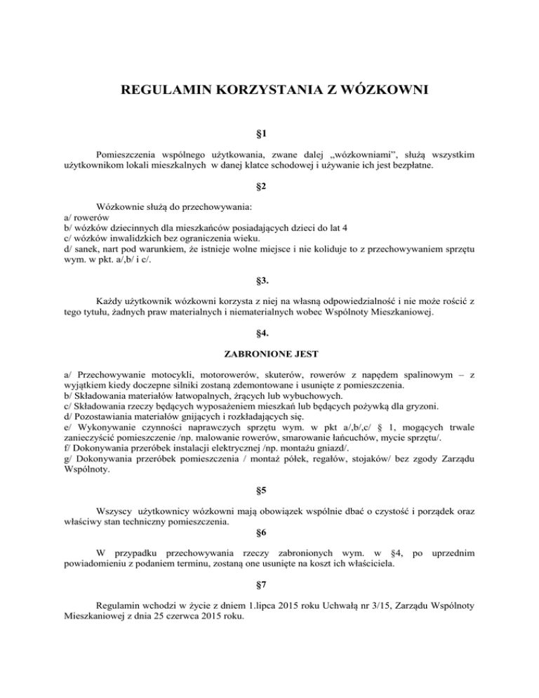 REGULAMIN KORZYSTANIA Z WÓZKOWNI §1 Pomieszczenia wspólnego użytkowania, zwane dalej „wózkowniami”, służą wszystkim użytkownikom lokali mieszkalnych w danej klatce schodowej i używanie ich jest bezpłatne. §2 Wózkownie służą do przechowywania: a/ rowerów b/ wózków dziecinnych dla mieszkańców posiadających dzieci do lat 4 c/ wózków inwalidzkich bez ograniczenia wieku. d/ sanek, nart pod warunkiem, że istnieje wolne miejsce i nie koliduje to z przechowywaniem sprzętu wym. w pkt. a/,b/ i c/. §3. Każdy użytkownik wózkowni korzysta z niej na własną odpowiedzialność i nie może rościć z tego tytułu, żadnych praw materialnych i niematerialnych wobec Wspólnoty Mieszkaniowej. §4. ZABRONIONE JEST a/ Przechowywanie motocykli, motorowerów, skuterów, rowerów z napędem spalinowym – z wyjątkiem kiedy doczepne silniki zostaną zdemontowane i usunięte z pomieszczenia. b/ Składowania materiałów łatwopalnych, żrących lub wybuchowych. c/ Składowania rzeczy będących wyposażeniem mieszkań lub będących pożywką dla gryzoni. d/ Pozostawiania materiałów gnijących i rozkładających się. e/ Wykonywanie czynności naprawczych sprzętu wym. w pkt a/,b/,c/ § 1, mogących trwale zanieczyścić pomieszczenie /np. malowanie rowerów, smarowanie łańcuchów, mycie sprzętu/. f/ Dokonywania przeróbek instalacji elektrycznej /np. montażu gniazd/. g/ Dokonywania przeróbek pomieszczenia / montaż półek, regałów, stojaków/ bez zgody Zarządu Wspólnoty. §5 Wszyscy użytkownicy wózkowni mają obowiązek wspólnie dbać o czystość i porządek oraz właściwy stan techniczny pomieszczenia. §6 W przypadku przechowywania rzeczy zabronionych wym. w §4, po uprzednim powiadomieniu z podaniem terminu, zostaną one usunięte na koszt ich właściciela. §7 Regulamin wchodzi w życie z dniem 1.lipca 2015 roku Uchwałą nr 3/15, Zarządu Wspólnoty Mieszkaniowej z dnia 25 czerwca 2015 roku.