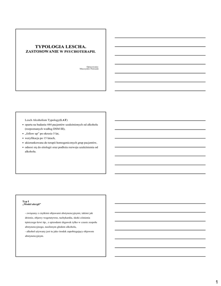 TYPOLOGIA LESCHA. ZASTOSOWANIE W PSYCHOTERAPII. Opracowanie: Mieczysław Potrzuski Lesch Alcoholism Typology(LAT) oparta na badaniu 444 pacjentów uzależnionych od alkoholu (rozpoznanych według DSM III), „follow up” po okresie 5 lat, weryfikacja po 15 latach, ukierunkowana do terapii homogenicznych grup pacjentów, odnosi się do etiologii oraz podłoża rozwoju uzależnienia od alkoholu. Typ I „Model alergii” - związany z ciężkimi objawami abstynencyjnymi, takimi jak drżenie, objawy wegetatywne, tachykardia, skoki ciśnienia tętniczego krwi itp., z epizodami drgawek tylko w czasie zespołu abstynencyjnego, nasilonym głodem alkoholu, - alkohol używany jest tu jako środek zapobiegający objawom abstynencyjnym. 1 Typ II „Model rozwiązywania problemu, Lęk” - obejmuje osoby, u których występuje niewielkie nasilenie objawów abstynencyjnych, - brak jest drgawek alkoholowych, chorób towarzyszących i tendencji samobójczych, - charakterystyczne stany lęku, - alkohol używany jako środek anksjolityczny. Typ III „Alkohol, jako lek na depresję” - z towarzyszącymi chorobami psychiatrycznymi, głęboką depresją, zaburzeniami snu, nasilonymi tendencjami samobójczymi, występującymi niezależne od intoksykacji i zespołu abstynencyjnego - alkohol używany jako środek przeciwdepresyjny. Typ IV „Alkohol jako przystosowanie” - związany z czynnikami wpływającymi na rozwój we wczesnym dzieciństwie, np. uszkodzeniami okołoporodowymi, chorobami OUN i urazami głowy przed 14 rokiem życia, - zaburzeniami zachowania w dzieciństwie (takimi jak obgryzanie paznokci lub/i moczenie nocne), padaczką czy ciężkimi zaburzeniami funkcji poznawczych. 2 TYP I - „Model alergii” ETIOLOGIA: Alkohol jako środek na AZA CEL TERAPEUTYCZNY: Całkowita abstynencja jest konieczna i wraz z zalecaną terapią relatywnie łatwo osiągalna. TERAPIA: skuteczna jest psychoterapia wspierająca, grupy samopomocy skupione na tematyce picia, np. AA. TYP II - „Model rozwiązywania problemu, Lęk” ETIOLOGIA: Alkohol redukuje lęk. Alkoholu, jako środek do „samo leczenia” w sytuacjach trudnych i konfliktowych. CEL TERAPEUTYCZNY: Ważnym celem terapii jest wzmocnienie „ja” oraz nauka właściwego ustanawiania granic interpersonalnych, dzięki czemu osiąga się z jednej strony lepsze radzenie sobie ze stresem zewnętrznym, a z drugiej strony powstaje mniej stresu subiektywnego. Wzorzec picia nie jest punktem centralnym terapii. TERAPIA: Wymaga psychoterapii ukierunkowanej na wzmocnienie ego, udziału w warsztatach tematycznie niekoniecznie związanych z piciem, skoncentrowanych na przeżywaniu emocji. TYP III - „Alkohol, jako lek na depresję” ETIOLOGIA: Alkohol służy w celu poprawy nastroju i jako środek nasenny-wpływa niekorzystnie na napęd, nastrój i strukturę snu. CEL TERAPEUTYCZNY: Zalecana jest terapia nacelowana w pracę nad cechami osobowości będącymi źródłem psychicznych obciążeń dla pacjenta. Kolejnym celem psychoterapii jest zredukowanie epizodów depresyjnych, TERAPIA: wskazana jest psychoterapia nastawiona na uzyskanie wglądu w emocje, główny cel nie ogniskuje się na piciu. 3 TYP IV - „Alkohol jako przystosowanie” ETIOLOGIA: Pacjenci, ze zmianami w OUN i ich następstwami, nie są w stanie oprzeć się społecznej presji picia alkoholu. Alkohol dodatkowo zaburza funkcje poznawcze. Znaczenie maja przede wszystkim upośledzenie umysłowe lub uszkodzenie mózgu przed czternastym rokiem życia. Pacjenci ci mają problem z radzeniem sobie w życiu codziennym oraz ze znalezieniem „powodu do życia”. CEL TERAPEUTYCZNY: Pacjenci łatwo ulegają wpływom swojego środowiska. Zdolności krytycznego myślenia są obniżone. Dlatego też nawroty są postrzegane jako część przebiegu choroby. „Celem jest przetrwanie”-wydłużenie okresów abstynencji, zmniejszenie nasilenia objawów somatycznych oraz ustrukturyzowanie dnia. TERAPIA: Psychoterapia wspierająca, nie zorientowana psychoanalitycznie. Zadaniem treningu umiejętności społecznych jest zapobieganie nawrotom. Wysoce skuteczne dla tego typu są grupy samopomocy Zabójstwa dokonane według LAT (Uniwersytet Erlangen-Nuremberg 2006). Współwystępowanie depresji według LAT (HAM-D) 4 ROZKŁAD PODTYPÓW Z PODZIAŁEM NA PŁEĆ Kobiety Mężczyźni TYP III 24,8% TYP III 12% TYP IV 11,2% TYP IV 29,6% Lesch Alcoholism Typology w ZLO w Czarnym Borze TYP ALKOHOLIZM U N I 10 4,98% II 33 16,42% III 91 45,27% IV 67 33,33% SUMA 201 100,00% % IMPLIKACJE LAT w ZLO w Czarnym Borze czynniki kulturowe, czynniki społeczne, czynniki ekonomiczne, czynniki demograficzne, model konsumpcji alkoholu. 5 Źródła: 1. Lesch O.M., Dietzel M., Musalek M. i wsp.: The course of alcoholism. Long-term prognosis in different types. Forensic Science International 1988. 2. Kiefer F., Barocka A., Secondary depresion in weaned alcoholics: Implications of Lesch’s typology of chronic alcoholism. Alcohol & Alcoholism, Vol. 34, 1999. 3. Samochowiec A., Samochowiec J., Terapia zespołu zależności alkoholowej na podstawie typologii alkoholizmu Lescha. TERAPIA, NR 1 (204), 2008. 4. Lesch O.M., Walter H., Subtypes of alcoholism and their role in therapy. Alcohol & Alcoholism, 1996. 5. Leggio L., Kenna G.A., Fenton M., Bonenfant E., Swift M.R.,Typologies of Alcohol Dependence.From Jellinek to Genetics and Beyond. Neuropsychological Review, 2008. 6.Reulbach U., Bierman T., Bleich S.i wsp.: Alcoholism and Homocide with respect to the classification systems of Lesch and Cloninger, Alcohol&Alcoholism, Vol. 42, 2007. Dziękuję za uwagę 6