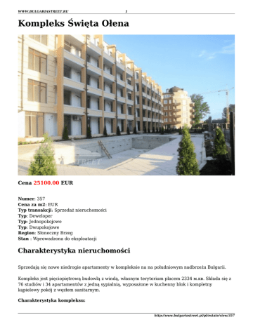 WWW.BULGARIASTREET.RU 1 Kompleks Święta Ołena Cena 25100.00 EUR Numer: 357 Cena za m2: EUR Typ transakcji: Sprzedaż nieruchomości Typ: Deweloper Typ: Jednopokojowe Typ: Dwupokojowe Region: Słoneczny Brzeg Stan : Wprowadzona do eksploatacji Charakterystyka nieruchomości Sprzedają się nowe niedrogie apartamenty w kompleksie na na południowym nadbrzeżu Bułgarii. Kompleks jest pięciopiętrową budowlą z windą, własnym terytorium placem 2334 м.кв. Składa się z 76 studiów i 34 apartamentów z jedną sypialnią, wyposażone w kuchenny blok i kompletny kąpielowy pokój z węzłem sanitarnym. Charakterystyka kompleksu: http://www.bulgariastreet.pl/pl/estate/view/357 WWW.BULGARIASTREET.RU 2 Na terytorium znajduje się dziecięcy i dorosły baseny, dziecięcy zabawowy placyk, parking. Proponujemy wam kupić mieszkanie w zdrojowym apartamentem kompleksie, który jest rozmieszczony w cichym, zagospodarowanym rejonie Słonecznego Brzegu w 380 metrach od przepięknej piaszczystej plaży, morza i przechadzki nabrzeża z obiektami dla odpoczynku i rozrywek. Nieoprocentowane Rozłożenie na raty Spłaty do 2 lata Urządzenie budowli, apartamentów: ● ● ● ● ● Żelazobetonowa konstrukcja, ściany i przegrody z ceramicznej cegły, naturalny tynk z lateksem zabarwieniem; Klimatyzowanie indywidualistyczne w każdym pokoju; Liczniki wód i эл. energie indywidualistyczne; Kablowa telewizja i internet; Ogrzanie podłóg na zamówienie; Infrastruktura ● ● ● ● ● ● ● ● ● Pralka Sprzatanie apartamentow Kamery ochrony Ochrona Internet Telewizja kablowa Basen odkryty Restauracja Recepcja Informacje o regionie Największy kurort bułgarskiego czarnomorskiego nadbrzeża - Słoneczny Brzeg, rozmieszczony w zatoce między prastarym miastem Nesebar a Świętym Własem. Międzynarodowy port lotniczy m. Burgas znajduje się na odległości 35 km, a port lotniczy Warny - 95 km Klimat Słoneczny brzeg różni się sprzyjającym śródziemnomorskim klimatem. Lato jest słoneczne i gorące, średnia temperatura w lipcu składa 22-23 stopni Celsjusza. Średnia temperatura morskiej wody - 2026 stopni Celsjusza. W okres z maja miesiąca po października włącznie ilość słonecznych godzin istnieje więcej 1700. Słonecznemu brzegowi jest nadany Błękitny sztandar - międzynarodowa nagroda, która potwierdza, że woda i plaże odpowiadają najwyższym standardom i przydatne dla bezpiecznej kąpieli i odpoczynku. Plaże Słoneczny Brzeg ma w rozporządzeniu naprawdę zbytkowną plażę z drobnym złocistym piaskiem i bezpiecznym pochyłym zachodem w morze. Czysty, współcześnie wyposażony i taki, że ochrania się plaża jest prawdziwą chlubą kurortu. Na plaży są możliwości dla surfingu, przejażdżka na ślizgaczach i wodnych rowerach. Tu są zbudowane współczesne tenisowe korty. Skoki z spadochronem i wierzchowa jazda - dla Waszego zadowolenia! Infrastruktura http://www.bulgariastreet.pl/pl/estate/view/357 WWW.BULGARIASTREET.RU 3 Słoneczny brzeg ma doskonale opracowaną infrastrukturę. W tym kurorcie są wszystkie warunki dla rodzinnego, dziecięcego i młodzieżowego odpoczynku. Duża ilość parkowych terytoriów, co zadrzewia, ze strefami odpoczynku i dziecięcymi placykami jest bezsprzeczną przewagą kurortu. W kompleksie są trenażery sale, sauny, pływalnie dla dorosłych i dzieci, masażowe gabinety, salony piękności i medyczne centra. Duża ilość rozmaitych restauracji i kawiarń, co proponuje internacjonalną i bułgarską kuchnię, poza wątpliwością, ucieszy smakoszy. Młodzież we właściwy sposób oceni nocne kluby, modne dyskoteki, bary z żywą muzyką. Dla amatorów aktywnego odpoczynek i sportu są stworzone liczne warunki. http://www.bulgariastreet.pl/pl/estate/view/357 WWW.BULGARIASTREET.RU 4 Kontakty Agencja "Ulica Bułgarska" (Bulgaria Street Ltd) Bułgaria m. Burgas, 8000 ul. Mitropolit Simeon 3 Strona: www.bulgariastreet.ru Tel: + 359 894 51 50 51 Tel: + 48 223 906 334 Mail: [email protected] Mail: [email protected] Skype: bulstreet http://www.bulgariastreet.pl/pl/estate/view/357