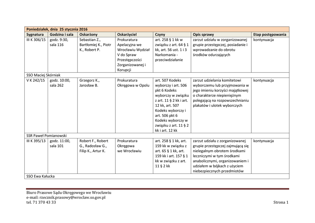 Poniedziałek, dnia 25 stycznia 2016 Sygnatura Godzina i sala Oskarżony III K 306/15 godz. 9:30, Sebastian Z., sala 116 Bartłomiej K., Piotr K., Robert P. SSO Maciej Skórniak V K 242/15 godz. 10:00, sala 262 SSR Paweł Pomianowski III K 395/13 godz. 11:00, sala 101 Oskarżyciel Prokuratura Apelacyjna we Wrocławiu Wydział V do Spraw Przestępczości Zorganizowanej i Korupcji Czyny art. 258 § 1 kk w związku z art. 64 § 1 kk, art. 56 ust. 1 i 3 Narkomania przeciwdziałanie Opis sprawy zarzut udziału w zorganizowanej grupie przestępczej, posiadanie i wprowadzanie do obrotu środków odurzających Etap postępowania kontynuacja Grzegorz K., Jarosław B. Prokuratura Okręgowa w Opolu art. 507 Kodeks wyborczy i art. 506 pkt 6 Kodeks wyborczy w związku z art. 11 § 2 kk i art. 12 kk, art. 507 Kodeks wyborczy i art. 506 pkt 6 Kodeks wyborczy w związku z art. 11 § 2 kk i art. 12 kk zarzut udzielania komitetowi wyborczemu lub przyjmowania w jego imieniu korzyści majątkowej o charakterze niepieniężnym polegającą na rozpowszechnianiu plakatów i ulotek wyborczych kontynuacja Robert F., Robert G., Radosław G., Filip K., Artur K. Prokuratura Okręgowa we Wrocławiu art. 258 § 1 kk, art. 159 kk w związku z art. 65 § 1 kk, art. 159 kk i art. 157 § 1 kk w związku z art. 11 § 2 kk zarzut udziału z zorganizowanej grupie przestępczej zajmującą się nielegalnym obrotem środkami leczniczymi w tym środkami anabolicznymi, organizowaniem i udziałem w bójkach z użyciem niebezpiecznych przedmiotów kontynuacja SSO Ewa Kałucka Biuro Prasowe Sądu Okręgowego we Wrocławiu e-mail: [email protected] tel. 71 370 43 33 Strona 1 Wtorek, dnia 26 stycznia 2016 Sygnatura Godzina i sala Oskarżony III K 208/15 godz. 9:30, Tomasz F., Dorota sala 102 P., Maciej D., Arkadiusz S. SSO Beata Kinstler III K 331/15 godz. 9:30, sala 101 Ireneusz S. Oskarżyciel Prokuratura Okręgowa we Wrocławiu Czyny art. 258 § 1 kk, art. 286 § 1 kk w związku z art. 294 § 1 kk i art. 270 § 1 kk w związku z art. 11 § 2 kk w związku z art. 12 kk, art. 79 pkt 4 Rachunkowośd w związku z art. 11 § 2 kk, art. 79 pkt 4 Rachunkowośd w związku z art. 11 § 2 kk Opis sprawy Tomasz F. oskarżony o to, że w okresie od listopada 2011 roku do maja 2012 roku we Wrocławiu i innych miejscowościach brał udział w zorganizowanej grupie przestępczej, w skład której wchodzili Arkadiusz S., Dorota M., Maciej D. i inne osoby, mającej na celu dokonywanie przestępstw polegających na dokonywaniu w ramach różnych podmiotów gospodarczych wyłudzeo mienia, przestępstw przeciwko wiarygodności dokumentów, w tym przerabiania dokumentów, przestępstw skarbowych i innych Etap postępowania kontynuacja Prokuratura Rejonowa dla Wrocławia – Fabrycznej we Wrocławiu art. 148 § 1 kk, art. 263 § 2 kk, art. 286 § 1 k.k. w zw. z art. 12 k.k., art. 286 § 1 kk i art. 233 § 6 kk w związku z art. 11 § 2 kk i art. 12 kk Ireneusz S. oskarżony o to, że w dniu 24 października 2014 roku działając w zamiarze bezpośrednim pozbawienia życia swojej żony, oddał w jej kierunku jeden strzał z broni palnej powodując obrażenia, które skutkowały zgonem kontynuacja SSO Marcin Sosioski (sprawa z losowania składu sędziowskiego z dnia 23 października 2015 roku) Biuro Prasowe Sądu Okręgowego we Wrocławiu e-mail: [email protected] tel. 71 370 43 33 Strona 2 III K 179/15 godz. 9:30, sala 101 SSO Anna Oraoska – Zdych III K 112/15 godz. 9:30, sala 115 Adrian W., Piotr S., Tomasz M., Andrzej A. Prokuratura Apelacyjna we Wrocławiu art. 258 § 1 kk, art. 56 ust. 1 Narkomania przeciwdziałanie i art. 56 ust. 3 Narkomania przeciwdziałanie w związku z art. 65 § 1 kk, art. 18 § 3 kk w związku z art. 53 ust. 1 Narkomania przeciwdziałanie i art. 53 ust. 2 Narkomania przeciwdziałanie i art. 63 ust. 2 Narkomania przeciwdziałanie w związku z art. 11 § 2 kk w związku z art. 64 § 1 kk, art. 56 ust. 1 Narkomania przeciwdziałanie i art. 56 ust. 3 Narkomania przeciwdziałanie Adrian W. oskarżony o to, że w okresie od grudnia 2008 r. do grudnia 2009 r. we Wrocławiu, brał udział w zorganizowanej grupie przestępczej kierowanej przez objętego odrębnym postępowaniem karnym Lecha W., w skład której wchodzili między innymi, Piotr S., Tomasz M., Andrzej A. oraz objęci odrębnym postępowaniem karnym Piotr D., Paweł P., Andrzej N., Paweł S., zajmującej się nielegalnym wewnątrzwspólnotowym obrotem znacznych ilości środków odurzających oraz substancji psychotropowych, obrotem znacznych ilości środków odurzających na terenie kraju, a nadto uprawą konopi innych niż włókniste i wytwarzaniem z nich środków odurzających w postaci ziela konopi innych niż włókniste kontynuacja Patryk W., Paweł K. Prokuratura Rejonowa dla Wrocławia – Stare Miasto we art. 119 § 1 kk i art. 257 kk i art. 157 § 1 kk i art. 158 § 1 kk w związku z art. 11 Patryk W. oskarżony o to, że w dniu 3 sierpnia 2014 r. we Wrocławiu, działając wspólnie i w porozumieniu z Pawłem K. oraz kontynuacja Biuro Prasowe Sądu Okręgowego we Wrocławiu e-mail: [email protected] tel. 71 370 43 33 Strona 3 Wrocławiu § 2 kk, art. 157 § 2 kk, art. 158 § 1 kk i art. 157 § 2 kk w związku z art. 11 § 2 kk, art. 157 § 2 kk nieustalonym mężczyzną, publicznie znieważył Davy D. słowami powszechnie uważanymi za obelżywe i wulgarne oraz stosował przemoc wobec Davy D. z powodu jego przynależności narodowej i rasowej SSO Elżbieta Sztenc Biuro Prasowe Sądu Okręgowego we Wrocławiu e-mail: [email protected] tel. 71 370 43 33 Strona 4 Środa, dnia 27 stycznia 2016 Sygnatura Godzina i sala III K 174/14 godz. 9:00, sala 101 SSO Marek Poteralski III K 335/13 godz. 9:30, sala 110 Oskarżony Rafał D., Łukasz J., Marek J., Aleksander S., Marek Z. i inni Oskarżyciel Prokuratura Apelacyjna we Wrocławiu Czyny art. 159 kk i art. 158 § 2 kk w związku z art. 11 § 2 kk w związku z art. 64 § 1 kk, art. 258 § 1 kk, art. 159 kk i art. 