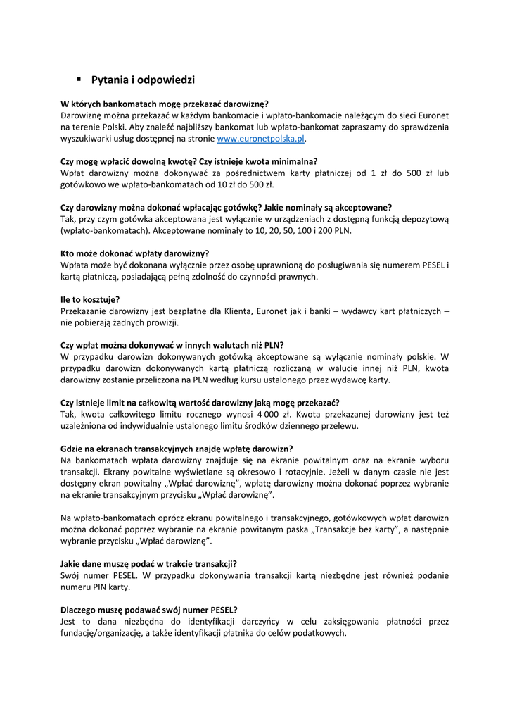 Pytania i odpowiedzi W których bankomatach mogę przekazać darowiznę? Darowiznę można przekazać w każdym bankomacie i wpłato-bankomacie należącym do sieci Euronet na terenie Polski. Aby znaleźć najbliższy bankomat lub wpłato-bankomat zapraszamy do sprawdzenia wyszukiwarki usług dostępnej na stronie www.euronetpolska.pl. Czy mogę wpłacić dowolną kwotę? Czy istnieje kwota minimalna? Wpłat darowizny można dokonywać za pośrednictwem karty płatniczej od 1 zł do 500 zł lub gotówkowo we wpłato-bankomatach od 10 zł do 500 zł. Czy darowizny można dokonać wpłacając gotówkę? Jakie nominały są akceptowane? Tak, przy czym gotówka akceptowana jest wyłącznie w urządzeniach z dostępną funkcją depozytową (wpłato-bankomatach). Akceptowane nominały to 10, 20, 50, 100 i 200 PLN. Kto może dokonać wpłaty darowizny? Wpłata może być dokonana wyłącznie przez osobę uprawnioną do posługiwania się numerem PESEL i kartą płatniczą, posiadającą pełną zdolność do czynności prawnych. Ile to kosztuje? Przekazanie darowizny jest bezpłatne dla Klienta, Euronet jak i banki – wydawcy kart płatniczych – nie pobierają żadnych prowizji. Czy wpłat można dokonywać w innych walutach niż PLN? W przypadku darowizn dokonywanych gotówką akceptowane są wyłącznie nominały polskie. W przypadku darowizn dokonywanych kartą płatniczą rozliczaną w walucie innej niż PLN, kwota darowizny zostanie przeliczona na PLN według kursu ustalonego przez wydawcę karty. Czy istnieje limit na całkowitą wartość darowizny jaką mogę przekazać? Tak, kwota całkowitego limitu rocznego wynosi 4 000 zł. Kwota przekazanej darowizny jest też uzależniona od indywidualnie ustalonego limitu środków dziennego przelewu. Gdzie na ekranach transakcyjnych znajdę wpłatę darowizn? Na bankomatach wpłata darowizny znajduje się na ekranie powitalnym oraz na ekranie wyboru transakcji. Ekrany powitalne wyświetlane są okresowo i rotacyjnie. Jeżeli w danym czasie nie jest dostępny ekran powitalny „Wpłać darowiznę”, wpłatę darowizny można dokonać poprzez wybranie na ekranie transakcyjnym przycisku „Wpłać darowiznę”. Na wpłato-bankomatach oprócz ekranu powitalnego i transakcyjnego, gotówkowych wpłat darowizn można dokonać poprzez wybranie na ekranie powitanym paska „Transakcje bez karty”, a następnie wybranie przycisku „Wpłać darowiznę”. Jakie dane muszę podać w trakcie transakcji? Swój numer PESEL. W przypadku dokonywania transakcji kartą niezbędne jest również podanie numeru PIN karty. Dlaczego muszę podawać swój numer PESEL? Jest to dana niezbędna do identyfikacji darczyńcy w celu zaksięgowania płatności przez fundację/organizację, a także identyfikacji płatnika do celów podatkowych. Czy moje dane będą bezpieczne? Tak. Są one przechowywane na zabezpieczonym dysku, do którego dostęp mają jedynie osoby upoważnione w fundacji/organizacji do pracy z danymi osobowymi. Administratorem Twoich danych jest fundacja/organizacja. Są one przetwarzane jedynie w celu dokonania wpłaty do fundacji/organizacji oraz w celach księgowych, a także do procesu reklamacyjnego. Czy taką darowiznę mogę odpisać od podatku? Tak. Zasadniczo do rozliczenia darowizny konieczne jest zachowanie wydruku potwierdzenia, które otrzymali Państwo po dokonaniu transakcji. Dodatkowo na żądanie darczyńcy fundacja lub organizacja może wystawić potwierdzenie otrzymania darowizny. W celu uzyskania dalszych informacji dotyczących możliwości skorzystania z odliczenia podatkowego należy kontaktować się z właściwym Urzędem Skarbowym. Do kogo mogę zgłosić reklamację? Jak przebiega procedura reklamacji? Zgłoszenie reklamacji możliwe jest poprzez kontakt z Euronet Polska a odwołanie wpłat przez kontakt z fundacją/organizacją. Rozpatrzenie reklamacji następuje w ciągu 14 dni kalendarzowych od dnia otrzymania reklamacji. W przypadku pozytywnie uznanej reklamacji transakcji kartowej Euronet zwróci środki na konto karty Klienta w ciągu 14 dni od dnia zgłoszenia reklamacji. W przypadku uznanejreklamacji transakcji gotówkowej, transakcję uznaje się za udaną i środki trafiają bezpośrednio do wybranej przez Klienta organizacji. Do kogo mogę zgłosić problemy z dokonaniem transakcji? Prosimy o kontakt z Biurem Obsługi Euronet tel.: 801 324 024/22 519 77 71. Gdzie dostępny jest regulamin? Regulamin wyświetlany jest na ekranach bankomatów i wpłato-bankomatów Euronet z możliwością wydrukowania, a także na stronie internetowej www.euronetpolska.pl. Nie mogę przekazać darowizny? Dlaczego? Przyczyn może być kilka. Darowizny mogą dokonać jedynie posiadacze kart VISA i MasterCard, więc proszę upewnić się, że posiadacie Państwo kartę jednej z wymienionych organizacji. Inną przyczyną może być brak wystarczających środków na koncie, proszę sprawdzić saldo na swoim koncie. Możliwe jest również wprowadzenie błędnego numeru PESEL, należy wtedy dokonać transakcji ponownie, wprowadzając swój prawidłowy numer PESEL. W przypadku problemów technicznych z dokonaniem transakcji, prosimy o kontakt z Biurem Obsługi Klienta Euronet, tel.: 801 324 024 / 22 519 77 71.