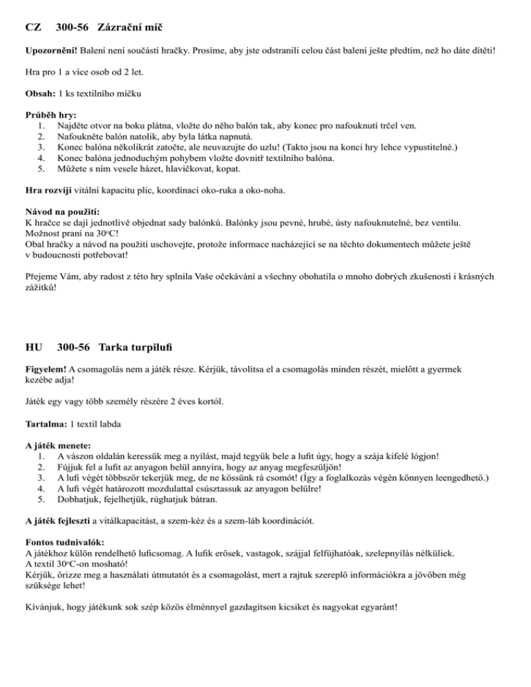 CZ 300-56 Zázrační míč Upozornění! Balení není součástí hračky. Prosíme, aby jste odstranili celou část balení ješte předtím, než ho dáte dítěti! Hra pro 1 a více osob od 2 let. Obsah: 1 ks textilního míčku Průběh hry: 1. Najděte otvor na boku plátna, vložte do něho balón tak, aby konec pro nafouknutí trčel ven. 2. Nafoukněte balón natolik, aby byla látka napnutá. 3. Konec balóna několikrát zatočte, ale neuvazujte do uzlu! (Takto jsou na konci hry lehce vypustitelné.) 4. Konec balóna jednoduchým pohybem vložte dovnitř textilního balóna. 5. Můžete s ním vesele házet, hlavičkovat, kopat. Hra rozvíjí vitální kapacitu plic, koordinaci oko-ruka a oko-noha. Návod na použití: K hračce se dají jednotlivě objednat sady balónků. Balónky jsou pevné, hrubé, ústy nafouknutelné, bez ventilu. Možnost praní na 30oC! Obal hračky a návod na použití uschovejte, protože informace nacházející se na těchto dokumentech můžete ještě v budoucnosti potřebovat! Přejeme Vám, aby radost z této hry splnila Vaše očekávání a všechny obohatila o mnoho dobrých zkušeností i krásných zážitků! HU 300-56 Tarka turpilufi Figyelem! A csomagolás nem a játék része. Kérjük, távolítsa el a csomagolás minden részét, mielőtt a gyermek kezébe adja! Játék egy vagy több személy részére 2 éves kortól. Tartalma: 1 textil labda A játék menete: 1. A vászon oldalán keressük meg a nyílást, majd tegyük bele a lufit úgy, hogy a szája kifelé lógjon! 2. Fújjuk fel a lufit az anyagon belül annyira, hogy az anyag megfeszüljön! 3. A lufi végét többször tekerjük meg, de ne kössünk rá csomót! (Így a foglalkozás végén könnyen leengedhető.) 4. A lufi végét határozott mozdulattal csúsztassuk az anyagon belülre! 5. Dobhatjuk, fejelhetjük, rúghatjuk bátran. A játék fejleszti a vitálkapacitást, a szem-kéz és a szem-láb koordinációt. Fontos tudnivalók: A játékhoz külön rendelhető luficsomag. A lufik erősek, vastagok, szájjal felfújhatóak, szelepnyílás nélküliek. A textil 30oC-on mosható! Kérjük, őrizze meg a használati útmutatót és a csomagolást, mert a rajtuk szereplő információkra a jövőben még szüksége lehet! Kívánjuk, hogy játékunk sok szép közös élménnyel gazdagítson kicsiket és nagyokat egyaránt! PL 300-56 Cudowny balon wielokolorowy Uwaga! Opakowanie nie wchodzi w skład zabawki. Prosimy o usunięcie całego opakowania z zabawki jeszcze przed tym jak ją dacie dziecku do zabawy! Gra jest przeznaczona dla 1 i więcej osób powyżej 2 roku życia. Zawartość: 1 szt piłka Przebieg gry: 1. Znajdź otwór na boku materiału, włóż do niego balon, w taki sposób aby końcówka balonu znajdowała się na zewnątrz otworu. 2. Nadmuchaj balon znajdujący się wewnątrz balonu z materiału, dmuchaj aż będzie tkanina wystarczająco napięta. 3. Końcówkę balonu należy kilkakrotnie zakręćić, ale nie wiązać do węzła!(Potem na końcu zabawy jest łatwo wypuśćić z niego powietrze.) 4. Końcówkę balonu po prostu wsuń do środka balonu z materiału. 5. Można go śmiało rzucać, główkować, kopać. Gra rozwija pojemność płuc, koordynację oczu-rąk oraz oczu-nóg. Instrukcja obsługi: Do zabawki można zamówić samodzielne komplety baloników. Balony są wytrzymałe, grube, łatwe do nadmuchania ustami, nie posiadają wentyli. Można prać w tamperaturze 30 stopni! Prosimy o zachowanie instrukcji oraz opakowania, ponieważ informacje w nich zawarte mogą być potrzebne! Życzymy udanej zabawy i wspaniałych wrażeń. Wierzymy, że gra spełni wasze oczekiwania i obogaci was o mnóstwo doświadczeń. RO 300-56 Mingea minune colorată Atenţie! Ambalajul nu este parte a jocului. Îndepărtaţi orice ambalaj al produsului înainte de a da jucăria copilului! Joc pentru una sau mai multe persoane cu vârsta peste 2 ani. Conținut: 1 minge din textil Jocul: 1. 2. 3. 4. 5. Introduceţi balonul în orificiul de material lăsând gura balonului afară. Umfaţi în aşa fel încât materialul să se întindă. Capătul balonului trebuie răsucit de mai multe ori dar nu trebuie înnodat. (Aşa la sfârşitul jocului se poate dezumfla uşor.) Cu o mişcare energică capătul balonului trebuie introdus în interiorul materialului. Se poate arunca, lovi cu piciorul, pasa cu încredere. Jocul dezvoltă capacitatea vitală, coordonarea ochi-mâna și ochi-picioare. Important de știut: Există posibilitatea să comandaţi separat baloane pentru minge. Baloanele sunt tari, groase şi se pot umfla, fără ventil. Textilul este lavabil la 30oC! Vă rugăm păstraţi ambalajul şi instrucţiunile de utilizare, deoarece vă poate fi utile pe viitor! Distracţie plăcută! SK 300-56 Zázračný balón Upozornenie! Balenie nie je súčasťou hračky. Prosíme, aby ste odstránili celú časť balenia ešte predtým, ako ho dáte dieťaťu! Hra pre 1 a viac osôb od 2 rokov. Obsah: 1 ks textilnej lopty Priebeh hry: 1. Pohľadajte otvor na boku plátna, vložte do neho balón tak, aby koniec balóna trčal von. 2. Nafúkajte balón vo vnútri zázračného balóna natoľko, aby bola látka napnutá. 3. Koniec balóna niekoľkokrát zakrúťte, ale neuviažte do uzla! (Takto na konci hry sú ľahko spustiteľné.) 4. Koniec balóna jednoduchým pohybom vložte do vnútra zázračného balóna. 5. Môžete ho smelo hádzať, hlavičkovať, kopať. Hra rozvíja vitálnu kapacitu pľúc, koordináciu očí-rúk a očí-nôh. Návod na použitie: K hračke sa dajú jednotlivo objednať sady balónov. Balóny sú pevné, hrubé, ústami nafúknuteľné, bez ventilu. Možnosť prania pri 30oC! Obal hračky a návod na použitie uschovajte, pretože informácie nachádzajúce sa na týchto dokumentoch môžete ešte v budúcnosti potrebovať! Prajeme Vám, aby radosť z tejto hry splnila Vaše očakávania a obohatila všetkých o veľa dobrých skúsenos