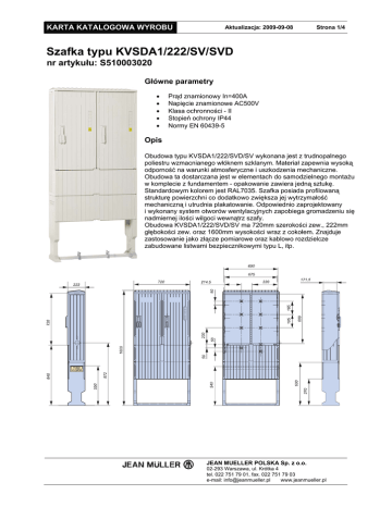 KARTA KATALOGOWA WYROBU Aktualizacja: 2009-09-08 Strona 1/4 Szafka typu KVSDA1/222/SV/SVD nr artykułu: S510003020 Główne parametry • • • • • Prąd znamionowy In=400A Napięcie znamionowe AC500V Klasa ochronności - II Stopień ochrony IP44 Normy EN 60439-5 Opis Obudowa typu KVSDA1/222/SVD/SV wykonana jest z trudnopalnego poliestru wzmacnianego włóknem szklanym. Materiał zapewnia wysoką odporność na warunki atmosferyczne i uszkodzenia mechaniczne. Obudowa ta dostarczana jest w elementach do samodzielnego montażu w komplecie z fundamentem - opakowanie zawiera jedną sztukę. Standardowym kolorem jest RAL7035. Szafka posiada profilowaną strukturę powierzchni co dodatkowo zwiększa jej wytrzymałość mechaniczną i utrudnia plakatowanie. Odpowiednio zaprojektowany i wykonany system otworów wentylacyjnych zapobiega gromadzeniu się nadmiernej ilości wilgoci wewnątrz szafy. Obudowa KVSDA1/222/SVD/SV ma 720mm szerokości zew., 222mm głębokości zew. oraz 1600mm wysokości wraz z cokołem. Znajduje zastosowanie jako złącze pomiarowe oraz kablowo rozdzielcze zabudowane listwami bezpiecznikowymi typu L, itp. JEAN MUELLER POLSKA Sp. z o.o. 02-293 Warszawa, ul. Krótka 4 tel. 022 751 79 01, fax. 022 751 79 03 e-mail: [email protected] www.jeanmueller.pl KARTA KATALOGOWA WYROBU Aktualizacja: 2009-09-08 Strona 2/4 Szafka typu KVSDA1/222/SV/SVD nr artykułu: S510003020 DANE TECHNICZNE Parametry i warunki pracy Napięcie znamionowe Prąd znamionowy Kolor Stopień ochrony Odporność na uderzenia mechaniczne Klasa ochronności Odporność na żar Temperatura otoczenia Ue Ie V A Tu °C °C AC400 400A RAL7035 IP44 IK10 II 960 - 25 do + 80 Wymiary i objaśnienia symboli Szerokość Wysokość Głębokość SV SVD mm mm mm 720 1 600 222 Zamek pojedynczy (bez wkładki patentowej) Zamek podwójny (bez wkładki patentowej) JEAN MUELLER POLSKA Sp. z o.o. 02-293 Warszawa, ul. Krótka 4 tel. 022 751 79 01, fax. 022 751 79 03 e-mail: [email protected] www.jeanmueller.pl KARTA KATALOGOWA WYROBU Aktualizacja: 2009-09-08 Strona 3/4 Szafka typu KVSDA1/222/SV/SVD nr artykułu: S510003020 Akcesoria System szyn zbiorczych ze śrubami 400A (4 sztuki) Szyny należy odpowiednio skrócić. Płyta montażowa Wymiary: szerokość – 335 mm wysokość – 895 mm grubość – 6 mm Płyta kratkowa do szafek KVS1/222 Płyta kratkowa mocowana do dolnej szyny w cokole w celu stabilizacji posadowienia szafki. W komplecie 2 sztuki połączone ze sobą. Osłona pustego pola 185 mm, szerokość 100 mm Zabezpieczenie przed wyciągnięciem kabla do szafek typu KVS.../222 Klamka do kłódki energetycznej Typ Nr artykułu SA-KVS0/222 S8000255 Typ Nr artykułu MPL00/222 S8500579 Typ Nr artykułu GBPL1/222 S8100942 Typ Nr artykułu H-RF S8900954 Typ Nr artykułu ZE-222 S8900897 Typ Nr artykułu SVV S8900126 JEAN MUELLER POLSKA Sp. z o.o. 02-293 Warszawa, ul. Krótka 4 tel. 022 751 79 01, fax. 022 751 79 03 e-mail: [email protected] www.jeanmueller.pl KARTA KATALOGOWA WYROBU Aktualizacja: 2009-09-08 Strona 4/4 Szafka typu KVSDA1/222/SV/SVD nr artykułu: S510003020 Akcesoria Tabliczka oznaczeniowa Typ Tabliczka bez nadruku (szara) Tabliczka oznaczeniowa S8900428 Typ Tabliczka z nadrukiem (żółta) Tabliczka oznaczeniowa Tabliczka z kieszenią dla szafek wszystkich wielkości Tabliczka oznaczeniowa Kieszeń na tabliczki dla szafek wszystkich wielkości Nr artykułu Nr artykułu S8900504 Typ Nr artykułu BZT S8900802 Typ Nr artykułu BZ S8900711 JEAN MUELLER POLSKA Sp. z o.o. 02-293 Warszawa, ul. Krótka 4 tel. 022 751 79 01, fax. 022 751 79 03 e-mail: [email protected] www.jeanmueller.pl