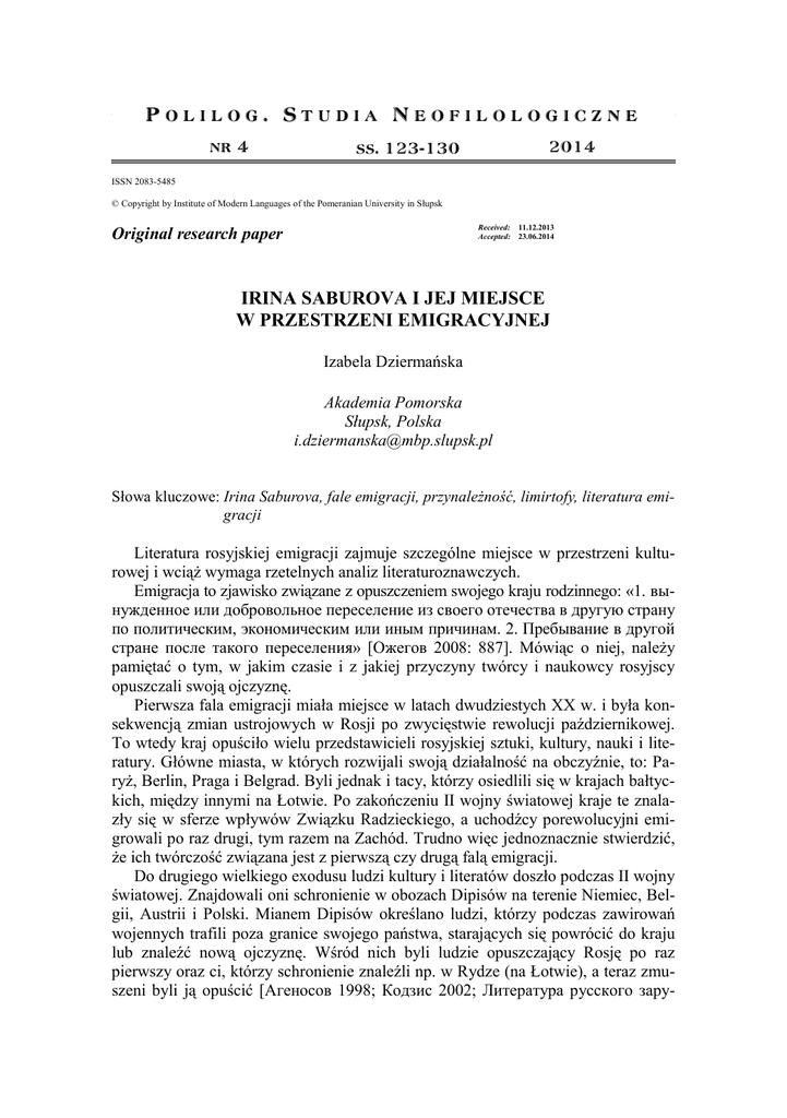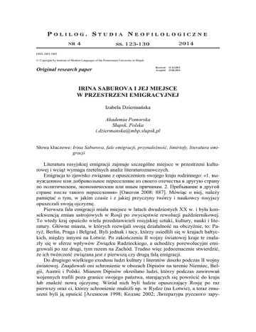 Irina Saburova i jej miejsce w przestrzeni emigracyjnej POLI LOG. STUDIA NEOFILOLOGICZNE nr 4 123 2014 ss. 123-130 ISSN 2083-5485 © Copyright by Institute of Modern Languages of the Pomeranian University in Słupsk Received: Accepted: Original research paper 11.12.2013 23.06.2014 IRINA SABUROVA I JEJ MIEJSCE W PRZESTRZENI EMIGRACYJNEJ Izabela Dziermańska Akademia Pomorska Słupsk, Polska [email protected] Słowa kluczowe: Irina Saburova, fale emigracji, przynależność, limirtofy, literatura emigracji Literatura rosyjskiej emigracji zajmuje szczególne miejsce w przestrzeni kulturowej i wciąż wymaga rzetelnych analiz literaturoznawczych. Emigracja to zjawisko związane z opuszczeniem swojego kraju rodzinnego: «1. вынужденное или добровольное переселение из своего отечества в другую страну по политическим, экономическим или иным причинам. 2. Пребывание в другой стране после такого переселения» [Ожегов 2008: 887]. Mówiąc o niej, należy pamiętać o tym, w jakim czasie i z jakiej przyczyny twórcy i naukowcy rosyjscy opuszczali swoją ojczyznę. Pierwsza fala emigracji miała miejsce w latach dwudziestych XX w. i była konsekwencją zmian ustrojowych w Rosji po zwycięstwie rewolucji październikowej. To wtedy kraj opuściło wielu przedstawicieli rosyjskiej sztuki, kultury, nauki i literatury. Główne miasta, w których rozwijali swoją działalność na obczyźnie, to: Paryż, Berlin, Praga i Belgrad. Byli jednak i tacy, którzy osiedlili się w krajach bałtyckich, między innymi na Łotwie. Po zakończeniu II wojny światowej kraje te znalazły się w sferze wpływów Związku Radzieckiego, a uchodźcy porewolucyjni emigrowali po raz drugi, tym razem na Zachód. Trudno więc jednoznacznie stwierdzić, że ich twórczość związana jest z pierwszą czy drugą falą emigracji. Do drugiego wielkiego exodusu ludzi kultury i literatów doszło podczas II wojny światowej. Znajdowali oni schronienie w obozach Dipisów na terenie Niemiec, Belgii, Austrii i Polski. Mianem Dipisów określano ludzi, którzy podczas zawirowań wojennych trafili poza granice swojego państwa, starających się powrócić do kraju lub znaleźć nową ojczyznę. Wśród nich byli ludzie opuszczający Rosję po raz pierwszy oraz ci, którzy schronienie znaleźli np. w Rydze (na Łotwie), a teraz zmuszeni byli ją opuścić [Агеносов 1998; Кодзис 2002; Литература русского зару- 124 Izabela Dziermańska бежья... 2003; Литература русского зарубежья... 1993; Литература русского зарубежья... 2007; Литературная энциклопедия... 1997]. W takiej sytuacji znalazła się Irina Saburova (prawdziwe imię i nazwisko: Ирина Евгеньевна Кутитонская), pisarka, dziennikarka i poetka. W. Berezin (В. Березин) w przedmowie do jej książki Королевство Алых Башен, którą zatytułował Советы Калиостро второй волне русской эмиграции, napisał: „Литература этой второй волны – хотя русская эмиграция, будто море, имела много волн, просто были они разной величины, – так вот, эта литература известна у нас мало и вряд ли будет популярной. Вещи, которые писали эти люди в своих лагерях в английской и американской зонах оккупации, со страхом ожидая выдачи в Советский Союз. Потом, осев в разных странах, они неспешно писали свои рассказы и романы, стихи и статьи. Это была действительно неспешная литература – в двадцатом году сидевшие в парижских кафе могли рассуждать о скором падении большевиков. А во второй половине сороковых СССР уже казался вечным. Другим стал мир, торопиться было некуда. Даже язык менялся – у Сабуровой это особый русский язык, который время от времени спотыкается, выворачивает ногу” [Березин 2000]. Krótkie omówienie życia i twórczości autorki jest niezbędne, aby zrozumiane zostały argumenty, na podstawie których twórczość Saburovej można odnieść do określonej fali emigracji. I chociaż sprawa ta może wydawać się nieważna, to istotna jest ona w badaniu twórczości indywidualnego pisarza oraz w rozpatrywaniu całej literatury emigracyjnej. Saburova sama o sobie pisała tak: „Пережила две мировых войны, два бегства, несколько гражданских войн, революций, оккупации и рухнувших миров, после чего приходилось начинать все с начала” [Витковский 2000: 508]. Urodzona w 1907 r., opuściła Rosję wraz z rodzicami, mając dziesięć lat. Wyjazd ten był związany z pracą ojca, rosyjskiego morskiego oficera, którego jednostka stacjonowała na Łotwie. Ryga stała się dla niej ojczyzną. Starała się szybko usamodzielnić, żeby nie być ciężarem dla rodziny w tych trudnych czasach. Tu zadebiutowała w roku 1922, w wieku piętnastu lat, w ryskiej gazecie Сегодня. W 1925 r. wyszła za mąż za Aleksandra Pierfilieva (Александр Перфильев). Wspólnie z poetą publikowała w miejscowych gazetach pod pseudonimami „Тонский”, „Раэр”, 