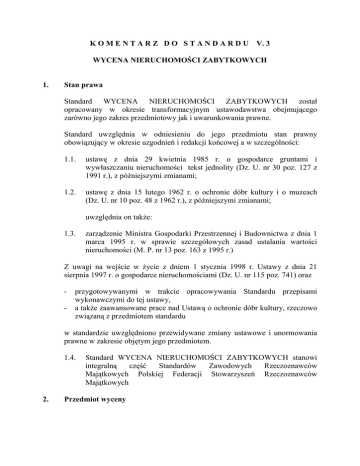 KOMENTARZ DO STANDARDU V. 3 WYCENA NIERUCHOMOŚCI ZABYTKOWYCH 1. Stan prawa Standard WYCENA NIERUCHOMOŚCI ZABYTKOWYCH został opracowany w okresie transformacyjnym ustawodawstwa obejmującego zarówno jego zakres przedmiotowy jak i uwarunkowania prawne. Standard uwzględnia w odniesieniu do jego przedmiotu stan prawny obowiązujący w okresie uzgodnień i redakcji końcowej a w szczególności: 1.1. ustawę z dnia 29 kwietnia 1985 r. o gospodarce gruntami i wywłaszczaniu nieruchomości tekst jednolity (Dz. U. nr 30 poz. 127 z 1991 r.), z późniejszymi zmianami; 1.2. ustawę z dnia 15 lutego 1962 r. o ochronie dóbr kultury i o muzeach (Dz. U. nr 10 poz. 48 z 1962 r.), z późniejszymi zmianami; uwzględnia on takŜe: 1.3. zarządzenie Ministra Gospodarki Przestrzennej i Budownictwa z dnia 1 marca 1995 r. w sprawie szczegółowych zasad ustalania wartości nieruchomości (M. P. nr 13 poz. 163 z 1995 r.) Z uwagi na wejście w Ŝycie z dniem 1 stycznia 1998 r. Ustawy z dnia 21 sierpnia 1997 r. o gospodarce nieruchomościami (Dz. U. nr 115 poz. 741) oraz - przygotowywanymi w trakcie opracowywania Standardu przepisami wykonawczymi do tej ustawy, a takŜe zaawansowane prace nad Ustawą o ochronie dóbr kultury, rzeczowo związaną z przedmiotem standardu w standardzie uwzględniono przewidywane zmiany ustawowe i unormowania prawne w zakresie objętym jego przedmiotem. 1.4. 2. Standard WYCENA NIERUCHOMOŚCI ZABYTKOWYCH stanowi integralną część Standardów Zawodowych Rzeczoznawców Majątkowych Polskiej Federacji Stowarzyszeń Rzeczoznawców Majątkowych Przedmiot wyceny W poz. 1 standardu zdefiniowano pojęcie nieruchomości zabytkowej w/g podanej klasyfikacji ochrony prawnej gwarantowanej ustawowo. Za nieruchomości objęte ewidencją zabytków oraz nieruchomości inne jeŜeli z przepisów szczególnych prawa wynika ich szczególny charakter dla dziedzictwa kultury, naleŜy rozumieć nieruchomości, które podlegają ochronie na podstawie przepisów prawa miejscowego lub przepisów gminnych (np. nieruchomości połoŜone w strefach ochrony konserwatorskiej w/g zapisu miejscowego planu zagospodarowania przestrzennego gminy). Zakres rzeczowy przedmiotu ochrony zdefiniowany jest jednoznacznie i nie wymaga komentarza. 3. Szczególne cechy nieruchomości zabytkowych W odniesieniu do czynników wyróŜniających nieruchomości zabytkowe od innych nieruchomości, komentarza wymaga uŜyte sformułowanie: ...integralność ich traktowania wraz z przestrzenią i bezpośrednim otoczeniem (gruntem, układem przestrzennym, percepcją i wzajemnymi relacjami widoków z nieruchomości i widokiem na nieruchomość, jej tło, kulisy i obrzeŜa itp.)... Oznacza to, Ŝe nieruchomości zabytkowe wyróŜniają się od innych nieruchomości szczególnością postrzegania ich elementów składowych w sposób integralny z miejscem ich połoŜenia tzn. bezpośrednim sąsiedztwem uwzględniającym: 4. - teren jako przestrzeń otwartą, harmonijnie umoŜliwiającą i eksponującą widok, wytłumiającą zakłócenia przestrzenne poprzez maskowanie zielenią fragmentów negatywnych widoku i podkreślającą walory przestrzennoarchitektoniczne takiej nieruchomości, - percepcję widoku gabarytów i formy (jej negatywne skutki oddziaływania zakłócające odbiór zabytkowej sylwety niewłaściwą formą bezpośredniego otoczenia bądź wysokością przesłaniającą istotną część widoku leŜącej w głębi, a stanowiącej główny przedmiot ochrony nieruchomości) oraz właściwościami pozytywnymi wyraŜonymi między innymi poprzez eksponowanie dominant i akcentów przestrzenno-architektonicznych, szczególne walory kompozycyjne miejsca, eksponowaną sylwetą w widokach zewnętrznych z zachowaniem tła, kulis i obrzeŜy w lokalnym gabarycie; Źródła informacji Wymienione źródła informacji w odniesieniu do wszystkich rodzajów nieruchomości zabytkowych naleŜy traktować obligatoryjnie z zastrzeŜeniem, Ŝe rzeczoznawca majątkowy przed przystąpieniem do sporządzania operatu szacunkowego kaŜdorazowo dokona aktualizacji zebranych danych i informacji w trakcie ustaleń dokonanych w miejscu lokalizacji nieruchomości. Dane i informacje zawarte w decyzji o wpisaniu do rejestru zabytków bądź ź objęciu ewidencją zabytków nie mogą podlegać w Ŝadnym wypadku takiej weryfikacji przez rzeczoznawcę majątkowego. 5. Ogólne zasady określenia wartości nieruchomości zabytkowych 5.1. Standard jednoznacznie określa, Ŝe wartość nieruchomości zabytkowej winna być określana integralnie ze szczególnym uwzględnieniem czynników odróŜniających i wyróŜniających tego typu nieruchomości od innych. Rzeczoznawca majątkowy winien zwrócić przy tym szczególną uwagę na integralność traktowania elementów składowych nieruchomości zabytkowej i miejsca ich ulokowania w przestrzeni bezpośredniego otoczenia. Ma to bowiem niejednokrotnie znaczący wpływ na wzrost lub spadek wartości nieruchomości zabytkowej (np. zbyt mały teren bezpośredniego otoczenia, nie zapewniający tzw. przedpola dla prawidłowej ekspozycji, dalekich widoków i bliskich względów nieruchomości znacznie obniŜa wartość nieruchomości; atrakcyjna ekspozycja i harmonijnie skomponowane otoczenie uatrakcyjniając nieruchomość zwiększa jej faktyczną wartość itp.) Z uwagi na powyŜsze rzeczoznawca majątkowy winien ograniczyć do minimum wycenę tego typu nieruchomości w formie sumarycznej wartości jej poszczególnych elementów składowych - i posiłkować się tą metodologią jedynie w przypadkach, kiedy cel wyceny w sposób nakazowy go do tego obliguje. 5.2. Standard zaleca, aby rzeczoznawca majątkowy opracowując opinię o wartości nieruchomości zabytkowej, w sytuacjach, kiedy jest to moŜliwe i szczególnie uzasadnione posługiwał się dwoma rodzajami podejść: rynkową i odtworzeniową. Nieruchomości zabytkowe jako nieruchomości szczególne róŜniące się od innych nieruchomości, charakteryzuje duŜa 