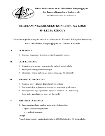 Szkoła Podstawowa nr 4 z Oddziałami Integracyjnymi im. Janusza Korczaka w Sochaczewie 96-500 Sochaczew, ul. Staszica 25 REGULAMIN SZKOLNEGO KONKURSU NA LOGO 50− −LECIA SZKOŁY Konkurs organizowany w związku z obchodami 50−lecia Szkoły Podstawowej nr 4 z Oddziałami Integracyjnymi im. Janusza Korczaka I. UCZESTNICY: 1. Konkurs skierowany jest do wszystkich uczniów szkoły. II. CELE KONKURSU 1. Kształtowanie postawy szacunku dla tradycji naszej szkoły. 2. Rozwijanie umiejętności twórczych. 3. Stworzenie znaku graficznego symbolizującego 50 lat szkoły. III. WYMOGI KONKURSOWE 1. Rozmiar pracy : 20cm x 20cm lub 20cm x 15cm. 2. Praca moŜe być wykonana w dowolnym programie graficznym. 3. Praca powinna być zapisana na płycie w formacie JPG pod nazwą: logo_imię_nazwisko np. logo_jan_kowalski IV. KRYTERIA OCENIANIA 1. Prace oceniane będą według następujących kryteriów: − ogólne wraŜenie artystyczne − oryginalność pomysłu Uwaga ! Praca, która zwycięŜy stanie się oficjalnym LOGO obchodów 50−lecia szkoły. V. TERMIN SKŁADANIA PRAC 1. Czas trwania konkursu: 1.06. − 15.09.2013r. Uwaga! Klasy szóste prosimy o dostarczenie prac do końca r. szk. 2012/13. Rozstrzygnięcie konkursu nastąpi w nowym roku szkolnym 25.09.2013r. Uroczyste ogłoszenie wyników konkursu, wręczenie nagród, wyróŜnień, dyplomów pamiątkowych oraz podziękowań dla nauczycieli planowane jest w maju 2014r.