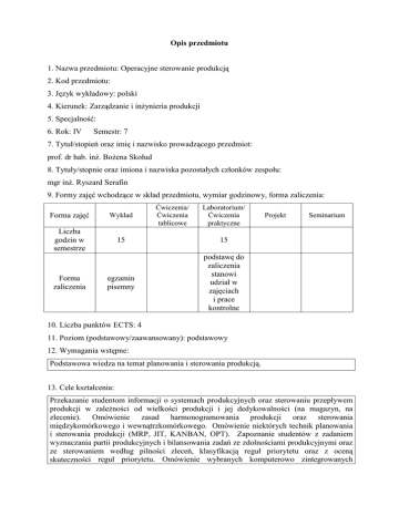 Opis przedmiotu 1. Nazwa przedmiotu: Operacyjne sterowanie produkcją 2. Kod przedmiotu: 3. Język wykładowy: polski 4. Kierunek: Zarządzanie i inŜynieria produkcji 5. Specjalność: 6. Rok: IV Semestr: 7 7. Tytuł/stopień oraz imię i nazwisko prowadzącego przedmiot: prof. dr hab. inŜ. BoŜena Skołud 8. Tytuły/stopnie oraz imiona i nazwiska pozostałych członków zespołu: mgr inŜ. Ryszard Serafin 9. Formy zajęć wchodzące w skład przedmiotu, wymiar godzinowy, forma zaliczenia: Ćwiczenia/ Ćwiczenia tablicowe Laboratorium/ Ćwiczenia praktyczne Forma zajęć Wykład Liczba godzin w semestrze 15 15 egzamin pisemny podstawę do zaliczenia stanowi udział w zajęciach i prace kontrolne Forma zaliczenia Projekt Seminarium 10. Liczba punktów ECTS: 4 11. Poziom (podstawowy/zaawansowany): podstawowy 12. Wymagania wstępne: Podstawowa wiedza na temat planowania i sterowania produkcją. 13. Cele kształcenia: Przekazanie studentom informacji o systemach produkcyjnych oraz sterowaniu przepływem produkcji w zaleŜności od wielkości produkcji i jej dedykowalności (na magazyn, na zlecenie). Omówienie zasad harmonogramowania produkcji oraz sterowania międzykomórkowego i wewnątrzkomórkowego. Omówienie niektórych technik planowania i sterowania produkcji (MRP, JIT, KANBAN, OPT). Zapoznanie studentów z zadaniem wyznaczania partii produkcyjnych i bilansowania zadań ze zdolnościami produkcyjnymi oraz ze sterowaniem według pilności zleceń, klasyfikacją reguł priorytetu oraz z oceną skuteczności reguł priorytetu. Omówienie wybranych komputerowo zintegrowanych systemów planowania i sterowania produkcją (np. CDN XL, IFS). 14. Opis treści kształcenia w ramach poszczególnych form zajęć: 14.1. Wykład: Harmonogramowanie Zasady tworzenia harmonogramu. Metody międzykomórkowego sterowania przepływem produkcji. Metody wewnątrzkomórkowego sterowania przepływem produkcji. Sterowanie operacyjne: szeregowanie wejściowe części, szeregowanie operacji, szeregowanie zamocowań. Zasady sterowania przepływem produkcji. Sformułowanie zadania harmonogramowania oraz klasyfikacja zadań harmonogramowania. Ogólne zadanie wyznaczania partii produkcyjnych i obciąŜenia maszyn. Sterowanie według pilności zleceń. Klasyfikacja reguł priorytetu. Ocena skuteczności reguł priorytetu. Typy, formy o odmiany organizacji produkcji, planowanie i sterowanie produkcją (MRP, JIT, KANBAN, OPT). 14.2. Ćwiczenia/Ćwiczenia tablicowe: 14.3. Laboratorium/ Ćwiczenia praktyczne: Omówienie modułowej budowy zintegrowanych systemów do zarządzania przedsiębiorstwem. Zajęcia laboratoryjne bazujące na module wspomagającym planowanie i sterowanie produkcji. Omówienie przeznaczenia modułu „Produkcja CDN XL”. Definiowanie receptur dot. produktów, składników, robocizny, materiałów ubocznych. Definiowanie listy zleceń kompletacji/dekompletacji. Tworzenie dokumentu zlecenia oraz jego predekretacja i księgowanie. Sposoby realizacji i rozliczeń zleceń. Definiowanie raportów o stopniu realizacji zleceń produkcyjnych, braków, historii towarów i kontrahentów. 14.4. Projekt: 14.5. Seminarium: 15. Literatura podstawowa: Wróblewski K. Podstawy sterowania przepływem produkcji, Warszawa, WNT, 1993. Durlik I., InŜynieria zarządzania: strategia i projektowanie systemów produkcyjnych. Cz. 1., Warszawa, Plecet, 2000. Durlik I., InŜynieria zarządzania: strategia i projektowanie systemów produkcyjnych. Cz.2., Warszawa, Plecet, 2000. Brzeziński M, Organizacja i sterowanie produkcją: projektowanie systemów produkcyjnych i procesów sterowania produkcją, Warszawa, Placet, 2002. 16. Literatura towarzysząca: Muhlemann A.P., Zarządzanie: produkcja i usługi, Warszawa, PWN, 2001.