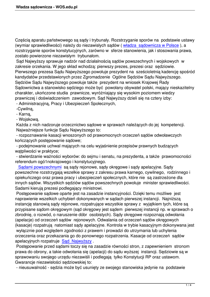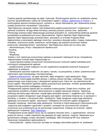 Władza sądownicza - WOS.edu.pl Częścią aparatu państwowego są sądy i trybunały. Rozstrzyganie sporów na podstawie ustawy (wymiar sprawiedliwości) należy do niezawisłych sądów ( władza sądownicza w Polsce ), a rozstrzyganie sporów konstytucyjnych, zarówno w sferze stanowienia, jak i stosowania prawa, zostało powierzone niezawisłym trybunałom. Sąd Najwyższy sprawuje nadzór nad działalnością sądów powszechnych i wojskowych w zakresie orzekania. W jego skład wchodzą: pierwszy prezes, prezesi oraz sędziowie. Pierwszego prezesa Sądu Najwyższego powołuje prezydent na sześcioletnią kadencję spośród kandydatów przedstawionych przez Zgromadzenie Ogólne Sędziów Sądu Najwyższego. Sędziów Sądu Najwyższego powołuje także prezydent na wniosek Krajowej Rady Sądownictwa a stanowisko sędziego może być powołany obywatel polski, mający nieskazitelny charakter, ukończone studia prawnicze, wyróżniający się wysokim poziomem wiedzy prawniczej i doświadczeniem zawodowym. Sąd Najwyższy dzieli się na cztery izby: - Administracyjną, Pracy i Ubezpieczeń Społecznych, -Cywilną, - Karną, - Wojskową. Każda z nich nadzoruje orzecznictwo sądowe w sprawach należących do jej kompetencji. Najważniejsze funkcje Sądu Najwyższego to: - rozpoznawanie kasacji wnoszonych od prawomocnych orzeczeń sądów odwoławczych kończących postępowanie sądowe; - podejmowanie uchwal mających na celu wyjaśnienie przepisów prawnych budzących wątpliwości w praktyce; - stwierdzanie ważności wyborów: do sejmu i senatu, na prezydenta, a także prawomocności referendum ogó1nokrajowego i konstytucyjnego. Sądami powszechnymi są sądy rejonowe, sądy okręgowe i sądy apelacyjne. Sądy powszechne rozstrzygają wszelkie sprawy z zakresu prawa karnego, cywilnego, rodzinnego i opiekuńczego oraz prawa pracy i ubezpieczeń społecznych, które nie są zastrzeżone dla innych sądów. Wszystkich sędziów sądów powszechnych powołuje minister sprawiedliwości. Sadami kierują prezesi podlegający ministrowi. Postępowanie sądowe oparte jest na zasadzie instancyjności. Dzięki temu możliwe jest naprawienie wszelkich uchybień dokonywanych w sądach pierwszej instancji. Najniższą instancję stanowią sądy rejonowe, rozpatrujące wszystkie sprawy z wyjątkiem tych, które są przypisane sądom okręgowym (sąd okręgowy jest sądem pierwszej instancji np. w sprawach o zbrodnię, o rozwód, o naruszenie dóbr osobistych). Sądy okręgowe rozpoznają odwołania (apelacje) od orzeczeń sądów rejonowych. Odwalania od orzeczeń sądów okręgowych (kasacje) rozpatrują natomiast sądy apelacyjne. Kontrola w trybie kasacyjnym dokonywana jest wyłącznie pod względem zgodności z prawem i prowadzi do utrzymania lub uchylenia orzeczenia oraz przekazania go do ponownego rozpatrzenia. Kasacje od orzeczeń sądów apelacyjnych rozpatruje Sąd Najwyższy . Postępowanie przed sądami toczy się na zasadzie równości stron, z zapewnieniem stronom prawa do obrony, a takie odwołania się (apelacji) do sądu wyższej instancji. Sędziowie są w sprawowaniu swojego urzędu niezawiśli i podlegają tylko Konstytucji RP oraz ustawom. Gwarancje niezawisłości sędziowskiej to: - nieusuwalność - sędzia może być usunięty ze swojego stanowiska jedynie na podstawie 1/4 Władza sądownicza - WOS.edu.pl orzeczenia sądu; - immunitet sędziowski - sędzia nie może być zatrzymany ani pociągnięty do odpowiedzialności karnej bez zezwolenia właściwego sądu dyscyplinarnego; - niepołączalność - zakaz łączenia stanowiska sędziego ze sprawowaniem mandatu posła lub senatora; - apolityczność - sędzia nie może być członkiem partii politycznej i związku zawodowego. Sąd lustracyjny zastał utworzony na podstawie ustawy z 11 kwietnia 1997 roku o ujawnieniu pracy lub służby w organach bezpieczeństwa państwa, bądź tez współpracy z nimi w latach 1944-1990 osób pełniących funkcje publiczne (tzw. ustawa lustracyjna). Sąd ten stanowi organ Sądu Apelacyjnego w Warszawie. Obowiązek złażenia oświadczeń dotyczących pracy lub współpracy ze służbami bezpieczeństwa mają osoby urodzone przed 1972 rokiem, kandydujące na prezydenta, posłów, senatorów, osoby desygnowane na stanowisko prezesa Rady Ministrów, kandydaci na kierownicze stanowiska państwowe. Lustracja bada prawdziwość oświadczenia, a nie fakt współpracy z organami bezpieczeństwa. W procesie lustracyjnym szczególną rolę odgrywa rzecznik interesu publicznego. Do zadań rzecznika należy analiza oświadczeń wpływających do sadu lustracyjnego, zbieranie informacji niezbędnych do sprawdzenia oświadczeń, składanie wniosków do tego sądu o wszczęcie postępowania lustracyjnego w razie wątpliwości co do prawdziwości oświadczenia. Postępowanie lustracyjne wszczyna się na wniosek rzecznika lub jego zastępcy. Od orzeczenia sądu można się odwołać. Sądownictwo administracyjne zostało reaktywowane w Polsce w 1980 roku na mocy ustawy o Naczelnym sądzie Administracyjnym (NSA). NSA sprawuje wymiar sprawiedliwości przez sądową kontrolę działalności administracji publicznej. Kontrola ta obejmuje również orzekanie o zgodności z ustawami uchwał organów samorządu terytorialnego i aktów normatywnych terenowych organów administracji Rządowej. Do zadań SA należy rozstrzyganie spraw spornych między obywatelem a organem administracji, który podjął decyzję odmawiającą mu pewnego uprawnienia lub nakładającą nam określony obowiązek praw?ny. NSA rozpatruje także spory kompetencyjne między organami administracji samorządowej i administracji rządowej. Zatem każda decyzja administracyjna może być zaskarżoną do sądu administracyjnego w razie jej niezgodności z prawem. Wymiar sprawiedliwości w silach zbrojnych należy do Sądów wojskowych, które organizacyjnie wchodzą w ich skład. Zgodnie z zasadą instancyjności sądy wojskowe pierwszej insta