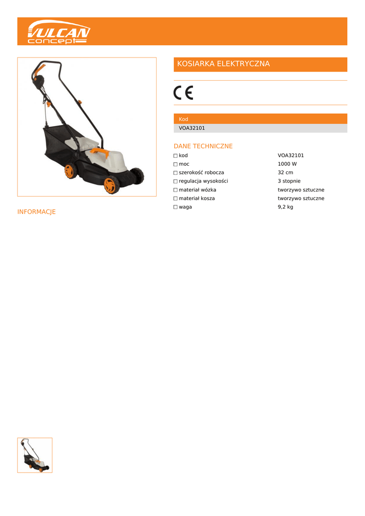 Powered by TCPDF (www.tcpdf.org) KOSIARKA ELEKTRYCZNA Kod VOA32101 DANE TECHNICZNE INFORMACJE kod VOA32101 moc 1000 W szerokość robocza 32 cm regulacja wysokości 3 stopnie materiał wózka tworzywo sztuczne materiał kosza tworzywo sztuczne waga 9,2 kg