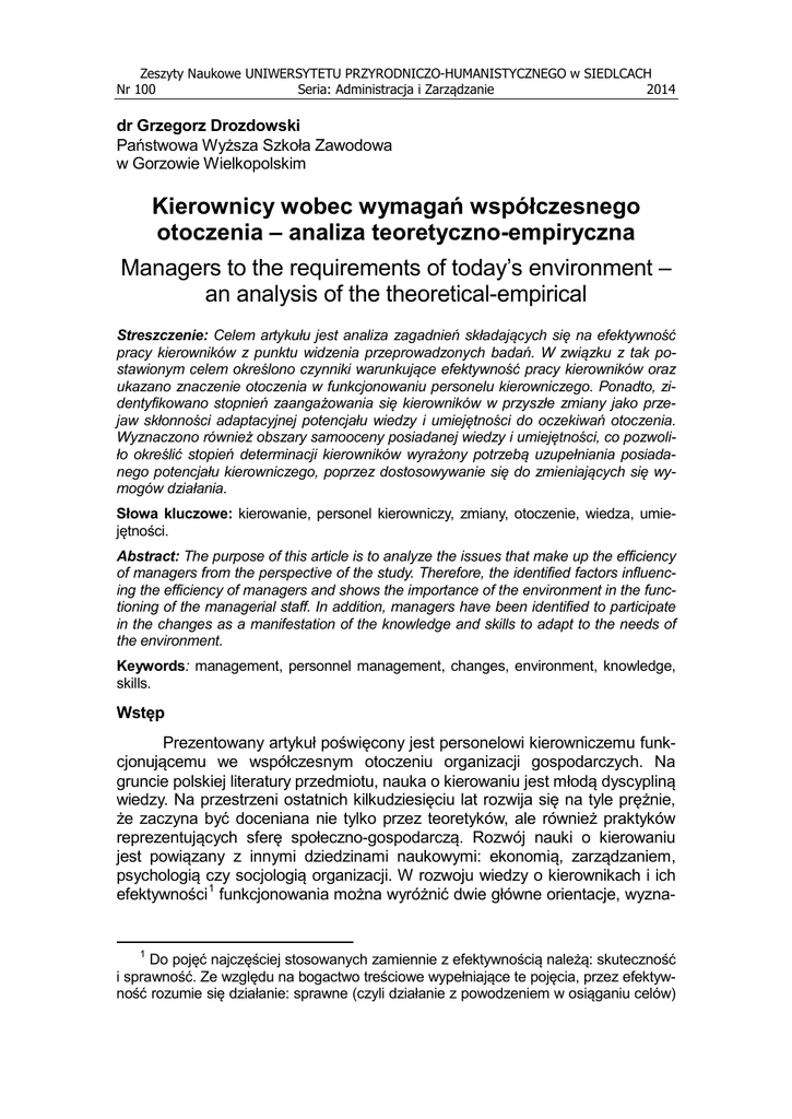Zeszyty Naukowe UNIWERSYTETU PRZYRODNICZO-HUMANISTYCZNEGO w SIEDLCACH Nr 100 Seria: Administracja i Zarządzanie 2014 dr Grzegorz Drozdowski Państwowa Wyższa Szkoła Zawodowa w Gorzowie Wielkopolskim Kierownicy wobec wymagań współczesnego otoczenia – analiza teoretyczno-empiryczna Managers to the requirements of today’s environment – an analysis of the theoretical-empirical Streszczenie: Celem artykułu jest analiza zagadnień składających się na efektywność pracy kierowników z punktu widzenia przeprowadzonych badań. W związku z tak postawionym celem określono czynniki warunkujące efektywność pracy kierowników oraz ukazano znaczenie otoczenia w funkcjonowaniu personelu kierowniczego. Ponadto, zidentyfikowano stopnień zaangażowania się kierowników w przyszłe zmiany jako przejaw skłonności adaptacyjnej potencjału wiedzy i umiejętności do oczekiwań otoczenia. Wyznaczono również obszary samooceny posiadanej wiedzy i umiejętności, co pozwoliło określić stopień determinacji kierowników wyrażony potrzebą uzupełniania posiadanego potencjału kierowniczego, poprzez dostosowywanie się do zmieniających się wymogów działania. Słowa kluczowe: kierowanie, personel kierowniczy, zmiany, otoczenie, wiedza, umiejętności. Abstract: The purpose of this article is to analyze the issues that make up the efficiency of managers from the perspective of the study. Therefore, the identified factors influencing the efficiency of managers and shows the importance of the environment in the functioning of the managerial staff. In addition, managers have been identified to participate in the changes as a manifestation of the knowledge and skills to adapt to the needs of the environment. Keywords: management, personnel management, changes, environment, knowledge, skills. Wstęp Prezentowany artykuł poświęcony jest personelowi kierowniczemu funkcjonującemu we współczesnym otoczeniu organizacji gospodarczych. Na gruncie polskiej literatury przedmiotu, nauka o kierowaniu jest młodą dyscypliną wiedzy. Na przestrzeni ostatnich kilkudziesięciu lat rozwija się na tyle prężnie, że zaczyna być doceniana nie tylko przez teoretyków, ale również praktyków reprezentujących sferę społeczno-gospodarczą. Rozwój nauki o kierowaniu jest powiązany z innymi dziedzinami naukowymi: ekonomią, zarządzaniem, psychologią czy socjologią organizacji. W rozwoju wiedzy o kierownikach i ich 1 efektywności funkcjonowania można wyróżnić dwie główne orientacje, wyzna- Do pojęć najczęściej stosowanych zamiennie z efektywnością należą: skuteczność i sprawność. Ze względu na bogactwo treściowe wypełniające te pojęcia, przez efektywność rozumie się działanie: sprawne (czyli działanie z powodzeniem w osiąganiu celów) 1 202 Grzegorz Drozdowski czające determinanty osiągania przez tą grupę pracowników sukcesu w zarządzanych organizacjach. Pierwsza dotyczy czynników podmiotowych, druga – funkcjonalnych. W obszarze podmiotowym eksponowane są przede wszystkim predyspozycje powiązane z cechami osobowościowymi. Według orientacji funkcjonalnej, osiągnięcie sukcesu uzależnione jest od efektywnego realizowania zadań, jakie powierzono kierownikowi w zależności od posiadanej wiedzy 2 3 i umiejętności . Zarysowujący się w ten sposób podział nie jest jedynie metodologicznym zabiegiem porządkującym treść dyskusji nad wyznacznikami sprawności kierowania. Pozwala on także na pogłębiony opis zagadnień mieszczących się w każdym z dwóch obszarów analizy. W rzeczywistości bowiem na sukces kierownictwa przedsiębiorstwa składa się zarówno specyficzna struktura zadań kierowanych do realizacji, jak i zakres oraz stopień odpowiedniego wykorzystania walorów osobowościowych, które są wymagane oraz zdeterminowane uwarunkowaniami zewnętrznym i celami do osiągnięcia. Przegląd dociekań zmierzających do propozycji poprawy efektywności kierowników doprowadził do konkluzji, że modele decyzyjne muszą być budo4 wane w oparciu o otoczenie . Nieuchronność dostosowania organizacji do zjawisk, jakie zachodzą w otoczeniu spowodowała konieczność wprowadzania zmian. Szybko rosnący zakres i tempo ich występowania wymaga systematycznego przystosowania się pracowników, w tym personelu kierowniczego do 5 płynących z zewnątrz sygnałów w postaci nowych koncepcji i form działania . Warunkiem przystosowania się jest dążenie do ukształtowania u kierowników odpowiedniego potencjału wiedzy i umiejętności zgodnie z wymogami otocze6 nia . Jak pisze P. F. Drucker, kierownicy powinni analizować swoje predyspoi skuteczne (czyli działanie bez zbędnego marnotrawstwa przy wykorzystaniu zasobów). (por. R.W. Griffin, Podstawy zarządzania organizacjami, PWN, Warszawa 1999, s. 38). 2 Przedmiotem zainteresowania autora w niniejszym artykule będzie obszar funkcjonalny pracy kierowników, bazujący na posiadanym potencjale wiedzy i umiejętności, który jest wyznacznikiem funkcji kierowniczych zarówno w odniesieniu do ludzi, jak i zasobów materialnych organizacji. 3 Według S. Tokarskiego podejścia te były rezultatem poglądów wielu twórców i kształtowały się w określonych formacjach naukowych zdeterminowanych dodatkowo uwarunkowaniami, społecznymi, politycznymi oraz kulturowymi (por. S. Tokarski, Kierownik w organizacji, Difin, Warszawa 2006, s. 7). 4 Jak zauważa M. Juchnowicz, otoczenie i uwarunkowanie wewnętrzne organizacji ulegają ciągłym zmianom. „Powoduje to konieczność przeformowania wielu fundamentalnych założeń teorii zarządzania, a sporo technik zarządzania staje się nieprzydatne […]” (M. Juchnowicz, Zaangażowanie pracowników. Sposoby oceny i motywowania, PWE, Warszawa 2012, s. 12). 5 Zdaniem P. Grajewskiego monitorowanie otoczenia w celu identyfikacji zachodzących w nich zmian jest podstawą efektywnego działania kierowników (por. P. Grajewski, Proces jako element kształtują