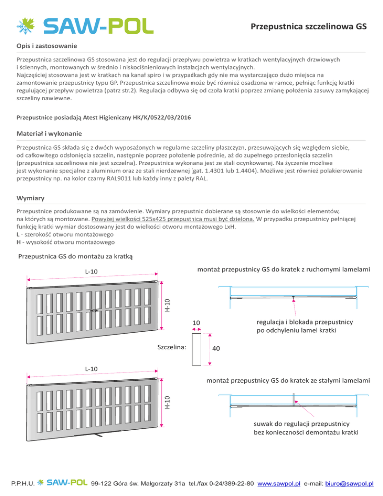 Przepustnica szczelinowa GS Opis i zastosowanie Przepustnica szczelinowa GS stosowana jest do regulacji przepływu powietrza w kratkach wentylacyjnych drzwiowych i ściennych, montowanych w średnio i niskociśnieniowych instalacjach wentylacyjnych. Najczęściej stosowana jest w kratkach na kanał spiro i w przypadkach gdy nie ma wystarczająco dużo miejsca na zamontowanie przepustnicy typu GP. Przepustnica szczelinowa może być również osadzona w ramce, pełniąc funkcję kratki regulującej przepływ powietrza (patrz str.2). Regulacja odbywa się od czoła kratki poprzez zmianę położenia zasuwy zamykającej szczeliny nawiewne. Przepustnice posiadają Atest Higieniczny HK/K/0522/03/2016 Materiał i wykonanie Przepustnica GS składa się z dwóch wyposażonych w regularne szczeliny płaszczyzn, przesuwających się względem siebie, od całkowitego odsłonięcia szczelin, następnie poprzez położenie pośrednie, aż do zupełnego przesłonięcia szczelin (przepustnica szczelinowa nie jest szczelna). Przepustnica wykonana jest ze stali ocynkowanej. Na życzenie możliwe jest wykonanie specjalne z aluminium oraz ze stali nierdzewnej (gat. 1.4301 lub 1.4404). Możliwe jest również polakierowanie przepustnicy np. na kolor czarny RAL9011 lub każdy inny z palety RAL. Wymiary Przepustnice produkowane są na zamówienie. Wymiary przepustnic dobierane są stosownie do wielkości elementów, na których są montowane. Powyżej wielkości 525x425 przepustnica musi być dzielona. W przypadku przepustnicy pełniącej funkcję kratki wymiar dostosowany jest do wielkości otworu montażowego LxH. L - szerokość otworu montażowego H - wysokość otworu montażowego Przepustnica GS do montażu za kratką montaż przepustnicy GS do kratek z ruchomymi lamelami H-10 L-10 regulacja i blokada przepustnicy po odchyleniu lamel kratki 10 Szczelina: 40 L-10 H-10 montaż przepustnicy GS do kratek ze stałymi lamelami suwak do regulacji przepustnicy bez konieczności demontażu kratki P.P.H.U. 99-122 Góra św. Małgorzaty 31a tel./fax 0-24/389-22-80 www.sawpol.pl e-mail: [email protected] Przepustnica szczelinowa GS Sposób montażu przepustnicy w funkcji kratki Przepustnica GS w funkcji kratki, najczęściej montowana jest w bramach garażowych lub panelu drzwiowym w połączeniu z kratką wentylacyjną montowaną z drugiej strony panelu (np. jako jedna z maskownic kratki KWSP). UWAGA: Przy zamówieniu przepustnicy szczelinowej montowanej w drzwiach bardzo ważne jest podanie głębokości panelu. 25mm 25 20 kratka KWSP H panel drzwiowy (min. 24mm) Sposób złożenia zamówienia Zamówienia prosimy składać wg poniższego wzoru: GS / 'LxH' / 'RAL' / 'M' 'G' 'LxH' 'RAL' 'M' - wariant wykonania przepustnicy: GS - przepustnica szczelinowa do montażu za kratką * GS/R - przepustnica szczelinowa w funkcji kratki - wymiar otworu montażowego (szerokość x wysokość) w mm - kolor przepustnicy wg palety RAL (standard brak koloru*) - materiał: OC - stal ocynkowana* AL - aluminium KO - stal nierdzewna/kwasoodporna (gat. 1.4301 lub 1.4404) * - w przypadku nie podania informacji zostaną zastosowane standardowe parametry P.P.H.U. 99-122 Góra św. Małgorzaty 31a tel./fax 0-24/389-22-80 www.sawpol.pl e-mail: [email protected]