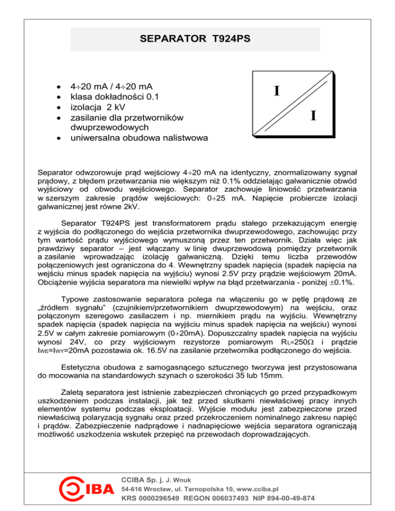 SEPARATOR T924PS 420 mA / 420 mA klasa dokładności 0.1 izolacja 2 kV zasilanie dla przetworników dwuprzewodowych uniwersalna obudowa nalistwowa I I Separator odwzorowuje prąd wejściowy 420 mA na identyczny, znormalizowany sygnał prądowy, z błędem przetwarzania nie większym niż 0.1% oddzielając galwanicznie obwód wyjściowy od obwodu wejściowego. Separator zachowuje liniowość przetwarzania w szerszym zakresie prądów wejściowych: 025 mA. Napięcie probiercze izolacji galwanicznej jest równe 2kV. Separator T924PS jest transformatorem prądu stałego przekazującym energię z wyjścia do podłączonego do wejścia przetwornika dwuprzewodowego, zachowując przy tym wartość prądu wyjściowego wymuszoną przez ten przetwornik. Działa więc jak prawdziwy separator – jest włączany w linię dwuprzewodową pomiędzy przetwornik a zasilanie wprowadzając izolację galwaniczną. Dzięki temu liczba przewodów połączeniowych jest ograniczona do 4. Wewnętrzny spadek napięcia (spadek napięcia na wejściu minus spadek napięcia na wyjściu) wynosi 2.5V przy prądzie wejściowym 20mA. Obciążenie wyjścia separatora ma niewielki wpływ na błąd przetwarzania - poniżej 0.1%. Typowe zastosowanie separatora polega na włączeniu go w pętlę prądową ze „źródłem sygnału” (czujnikiem/przetwornikiem dwuprzewodowym) na wejściu, oraz połączonym szeregowo zasilaczem i np. miernikiem prądu na wyjściu. Wewnętrzny spadek napięcia (spadek napięcia na wyjściu minus spadek napięcia na wejściu) wynosi 2.5V w całym zakresie pomiarowym (020mA). Dopuszczalny spadek napięcia na wyjściu wynosi 24V, co przy wyjściowym rezystorze pomiarowym R L=250 i prądzie IWE=IWY=20mA pozostawia ok. 16.5V na zasilanie przetwornika podłączonego do wejścia. Estetyczna obudowa z samogasnącego sztucznego tworzywa jest przystosowana do mocowania na standardowych szynach o szerokości 35 lub 15mm. Zaletą separatora jest istnienie zabezpieczeń chroniących go przed przypadkowym uszkodzeniem podczas instalacji, jak też przed skutkami niewłaściwej pracy innych elementów systemu podczas eksploatacji. Wyjście modułu jest zabezpieczone przed niewłaściwą polaryzacją sygnału oraz przed przekroczeniem nominalnego zakresu napięć i prądów. Zabezpieczenie nadprądowe i nadnapięciowe wejścia separatora ograniczają możliwość uszkodzenia wskutek przepięć na przewodach doprowadzających. CCIBA Sp. j. J. Wnuk 54-616 Wrocław, ul. Tarnopolska 10, www.cciba.pl KRS 0000296549 REGON 006037493 NIP 894-00-49-874 Przykład podłączenia przetwornika : 1 2 T924PS I I 3 0/420mA 4 U Z 5 RL 6 0/4÷20mA Dane techniczne: Wejście: prąd wejściowy spadek napięcia 0/420 mA UZ-2.5V - (I WERL) Wyjście: prąd wyjściowy spadek napięcia 0/420 mA 24V Klasa dokładności: Napięcie probiercze izolacji: 0.1 2 kV Ogólne parametry techniczne: pasmo przenoszenia zawartość szumów nieliniowość przetwarzania współczynnik temperaturowy czas nagrzewania zakres temperatur pracy zakres temperatur przechowywania wilgotność względna otoczenia ciśnienie atmosferyczne zewnętrzne pole magnetyczne pozycja pracy zapylenie wymiary obudowy stopień ochrony 4 Hz < 20 A < 0.05 % 50ppm/C 5 min -4060 C -4080 C 090 % (bez kond.) 1000200 hPa 0400 A/m dowolna nieznaczne 22.57985.5mm IP 40 Maksymalne wartości parametrów: spadek napięcia na wyjściu 24 V CCIBA Sp. j. J. Wnuk 54-616 Wrocław, ul. Tarnopolska 10, www.cciba.pl KRS 0000296549 REGON 006037493 NIP 894-00-49-874