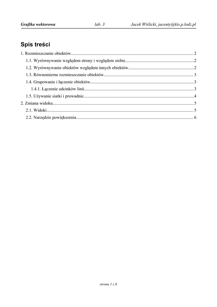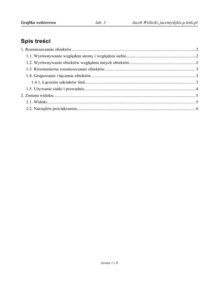 Grafika wektorowa lab. 3 Jacek Wiślicki, [email protected] Spis treści 1. Rozmieszczanie obiektów................................................................................................................ 2 1.1. Wyrównywanie względem strony i względem siebie...............................................................2 1.2. Wyrównywanie obiektów względem innych obiektów............................................................2 1.3. Równomierne rozmieszczanie obiektów.................................................................................. 3 1.4. Grupowanie i łączenie obiektów...............................................................................................3 1.4.1. Łączenie odcinków linii.................................................................................................... 3 1.5. Używanie siatki i prowadnic.....................................................................................................4 2. Zmiana widoku................................................................................................................................. 5 2.1. Widoki...................................................................................................................................... 5 2.2. Narzędzie powiększenia........................................................................................................... 6 strona 1 z 6 Grafika wektorowa lab. 3 Jacek Wiślicki, [email protected] 1. Rozmieszczanie obiektów 1.1. Wyrównywanie względem strony i względem siebie Wybierzmy obiekty, które chcemy wyrównać za pomocą wskaźnika. Następnie z menu Rozmieszczenie wybieramy Wyrównanie i rozkład i pożądaną opcję rozmieszczenia. Obiekty powinny “przeskoczyć” zgodnie z wyborem (np. na środek strony lub ułożyć się w linii). Operację tę można powtórzyć dla pojedynczego obiektu. Rys. 1: Menu wyrównania i rozkładu obiektów Obiekty można (zgodnie z rysunkiem poniżej) rozmieszczać względem siebie (podstawowe opcje dostępne są bezpośrednio z pokazanego powyżej meny). Proszę narysować kilka obiektów i spróbować porozmieszczać je względem siebie w różnych kombinacjach. Rys. 2: Okno dialogowe wyrównania i rozkładu obiektów 1.2. Wyrównywanie obiektów względem innych obiektów Metoda wyboru obiektów, które mają podlegać wyrównaniu jest tutaj niezwykle istotna. Jeżeli po prostu zakreślimy je wskaźnikiem, obiekty zostaną wyrównane do tego, który leży najgłębiej. Natomiast, kiedy wybierzemy kilka obiektów klikając z przyciskiem Shift, obiekty zostaną wyrównane do tego, który został kliknięty jako ostatni. Zobaczmy jak to działa. Wybierzmy kilka obiektów klikając z Shiftem. Kliknijmy przycisk Wyrównanie i rozkład na pasku właściwości (albo wejdźmy jeszcze w menu opisane powyżej). Wybierzmy „Do środka” zarówno w pionie jak i w poziomie. Naciśnijmy OK. Na ilustracji poniżej najpierw został wybrany pięciokąt, potem prostokąt, na końcu koło. Obiekty zostaną wyrównane względem okręgu. strona 2 z 6 Grafika wektorowa lab. 3 Jacek Wiślicki, [email protected] Rys. 3: Zaznaczenie kilku obiektów do wyrównania względem jednego z nich 1.3. Równomierne rozmieszczanie obiektów Wybierzmy obiekty, które mają podlegać rozmieszczeniu. Ilustracja pokazuje trzy linie, które mają zostać wyrównane do lewej i rozmieszczone w równych odstępach w pionie. Tym razem w oknie dialogowym wybierzmy „Do lewej” w zakładce „Wyrównanie” i „Środek” lub „Odstępy” w zakładce „Rozkład”. Kliknijmy OK. Rys. 4: Obiekty do rozmieszczenia równomiernego Wypróbujmy inne kombinacje na różnych grupach obiektów. 1.4. Grupowanie i łączenie obiektów Różnica pomiędzy obiektami połączonymi, a zgrupowanymi polega na tym, że grupa jest traktowana jako całość – akcje takie jak przenoszenie, kopiowanie czy transformowanie zachodzą dla wszystkich obiektów grupy. Natomiast grupę można także rozgrupować i zmieniać właściwości poszczególnych obiektów. Natomiast połączenie obiektów tworzy nowy obiekt. Przykładowo, często łączymy ze sobą odcinki linii dla stworzenia zamkniętego kształtu w celu wypełnienia. Ilustracja pokazuje 2 koncentryczne koła skombinowane w celu utworzenia pierścienia. Widać stąd podstawowe zastosowanie łączenia i cechy różniące ją od grupy. Rys. 5: Łączenie obiektów (przed i po) Proszę sprawdzić, jaka zachowają się takie koła po zgrupowaniu. 1.4.1. Łączenie odcinków linii Rys. 6 pokazuje dwa obiekty – łagodną krzywą (zaznaczona) i krzywą złożoną z trzech prostych odcinków. Użytkownik chce połączyć obiekty w celu utworzenia zamkniętej powierzchni do wypełnienia kolorem. Procedura jest następująca: 1. Za pomocą wskaźnika kliknijmy z Shiftem na albo zakreślmy (całkowicie) obydwa obiekty. 2. Z menu Rozmieszczenie wybierzmy „Połącz” (ew. przycisk na pasku właściwości, skrót: Ctrl+L). strona 3 z 6 Grafika wektorowa lab. 3 Jacek Wiślicki, [email protected] 3. Zazwyczaj połączone obiekty na tym etapie nie mogą jeszcze być wypełnione. 4. Wybierzmy narzędzie edycji kształtu. 5. Kliknijmy na połączonej krzywej w celu zaznaczenia. 6. Zaznaczmy węzły początkowych obiektów, które mają zostać złączone (zakreślając je lub klikając z Shiftem). 7. Kliknijmy odpowiedni przycisk na pasku właściwości (można także jeden węzeł “naciągnąć” na inny w celu połączenia). 8. Wybierzmy teraz odpowiedni kolor z palety (prawa strona ekranu) albo rodzaj wypełnienia z przybornika Rys. 6: Dwie linie (obiekty) do połączenia Czasem odnalezienie węzłów, które mają zostać połączone jest nieco trudniejsze niż w naszym przykładzie. Jeżeli obiekt nie uległ wypełnieniu, oznacz to, że krzywa jest wciąż otwarta. Musimy łączyć kolejne pary węzłów. 1.5. Używanie siatki i prowadnic Siatka jest regularną strukturą punkt