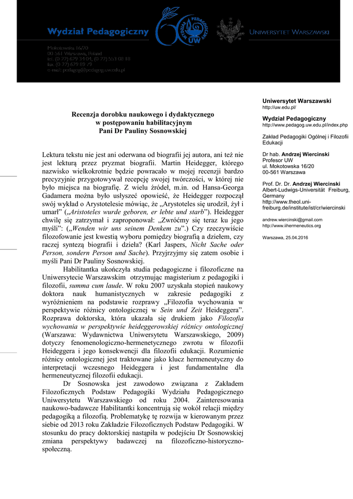 Uniwersytet Warszawski http://uw.edu.pl/ Recenzja dorobku naukowego i dydaktycznego w postępowaniu habilitacyjnym Pani Dr Pauliny Sosnowskiej Lektura tekstu nie jest ani oderwana od biografii jej autora, ani też nie jest lekturą przez pryzmat biografii. Martin Heidegger, którego nazwisko wielkokrotnie będzie powracało w mojej recenzji bardzo precyzyjnie przygotowywał recepcję swojej twórczości, w której nie było miejsca na biografię. Z wielu źródeł, m.in. od Hansa-Georga Gadamera można było usłyszeć opowieść, że Heidegger rozpoczął swój wykład o Arystotelesie mówiąc, że „Arystoteles się urodził, żył i umarł” („Aristoteles wurde geboren, er lebte und starb”). Heidegger chwilę się zatrzymał i zaproponował: „Zwróćmy się teraz ku jego myśli”: („Wenden wir uns seinem Denkem zu”.) Czy rzeczywiście filozofowanie jest kwestią wyboru pomiędzy biografią a dziełem, czy raczej syntezą biografii i dzieła? (Karl Jaspers, Nicht Sache oder Person, sondern Person und Sache). Przyjrzyjmy się zatem osobie i myśli Pani Dr Pauliny Sosnowskiej. Habilitantka ukończyła studia pedagogiczne i filozoficzne na Uniwersytecie Warszawskim otrzymując magisterium z pedagogiki i filozofii, summa cum laude. W roku 2007 uzyskała stopień naukowy doktora nauk humanistycznych w zakresie pedagogiki z wyróżnieniem na podstawie rozprawy „Filozofia wychowania w perspektywie różnicy ontologicznej w Sein und Zeit Heideggera”. Rozprawa doktorska, która ukazała się drukiem jako Filozofia wychowania w perspektywie heideggerowskiej różnicy ontologicznej (Warszawa: Wydawnictwa Uniwersytetu Warszawskiego, 2009) dotyczy fenomenologiczno-hermenetycznego zwrotu w filozofii Heideggera i jego konsekwencji dla filozofii edukacji. Rozumienie różnicy ontologicznej jest traktowane jako klucz hermeneutyczny do interpretacji wczesnego Heideggera i jest fundamentalne dla hermeneutycznej filozofii edukacji. Dr Sosnowska jest zawodowo związana z Zakładem Filozoficznych Podstaw Pedagogiki Wydziału Pedagogicznego Uniwersytetu Warszawskiego od roku 2004. Zainteresowania naukowo-badawcze Habilitantki koncentrują się wokół relacji między pedagogiką a filozofią. Problematykę tę rozwija w kierowanym przez siebie od 2013 roku Zakładzie Filozoficznych Podstaw Pedagogiki. W stosunku do pracy doktorskiej nastąpiła w podejściu Dr Sosnowskiej zmiana perspektywy badawczej na filozoficzno-historycznospołeczną. Wydział Pedagogiczny http://www.pedagog.uw.edu.pl/index.php Zakład Pedagogiki Ogólnej i Filozofii Edukacji Dr hab. Andrzej Wiercinski Profesor UW ul. Mokotowska 16/20 00-561 Warszawa Prof. Dr. Dr. Andrzej Wiercinski Albert-Ludwigs-Universität Freiburg, Germany http://www.theol.unifreiburg.de/institute/ist/cr/wiercinski [email protected] http://www.iihermeneutics.org Warszawa, 25.04.2016 Dorobek naukowo-badawczy Dr Sosnowskiej składa się obok wspomnianej już Filozofii wychowania w perspektywie Heideggerowskiej różnicy ontologicznej, poszerzonej o podrozdział Heidegger i Levinas, ss. 211-224, z serii artykułów i rozprawy Arendt i Heidegger. Pedagogiczna obietnica filozofii (Universitas: Kraków, 2015). Opublikowane dotychczas artykuły (16) jasno zakreślają szeroką perspektywę badawczą Habilitantki. Zarówno artykuł „Kepler i Platon: o możliwym znaczeniu kosmologii dla filozofii wychowania”, który nie tylko egzemplifikuje relację między starożytną kosmologią a Keplerem, prekursorem rewolucji naukowej, ale pokazuje konieczność komplementarnej refleksji o rzeczywistości, jak i „Teologia polityczna i nowożytność: Hans Blumenberg kontra Carl Schmitt”, prezentujący polemikę Hansa Blumenberga i Carla Schmitta, traktowane są przez Habilitantkę jako poszerzenie horyzontów badawczych, koniecznych dla bardziej twórczego rozumienia relacji między filozofią a pedagogiką. Artykuły „Od sporu między parweniuszem a pariasem do napięcia między życiem i światem”, „O genezie filozoficznych i pedagogicznych kategorii Hannah Arendt”, „Idea niemieckiego uniwersytetu. Mit Humboldta?” „Spór o zasadę Bildung i problem tożsamości żydowskiej w perspektywie ‘wczesnej’ Hannah Arendt” oraz „Plato’s Allegory of the Cave Reconsidered: The Heideggerian Approach” spójnie podkreślają konsekwentny wysiłek docierania do rozumienia nowożytnej idei edukacji w jej odmienności od greckiej παιδεία. Kolejną grupę artykułów, „Spór o prawomocność epoki nowożytnej”, „Czy Hannah Arendt była fenomenologiem?” „Is Hannah Arendt a Modernist After All”, “Arendt — Heidegger: Visual Art and the Public Space”, „Poprawność polityczna i myślenie o polityce. Przypadek Hannah Arendt” można, zgodnie z intencją ich Autorki, traktować jako wielowymiarowe przygotowanie do podjęcia tematyki rozprawy habilitacyjnej, zarówno w wymiarze szczególnego przygotowania warsztatowego, jak i erudycyjnego. Obok wymienionych artykułów, Habilitantka dokonała też przekładów tekstów naukowych z języka angielskiego i niemieckiego (12) oraz napisała kilka (6) recenzji. Tłumaczenie zachodniej literatury filozoficznej na język polski jest ważnym elementem własnego rozwoju naukowego, a nie jedynie służbą wobec społeczeństwa. Jeżeli przyjmiemy, że każdy przekład jest interpretacją, to tłumaczenie tekstów filozoficznych nie jest jedynie przyczynkiem do uprawiania filozofii, ale filozofowaniem sensu sticto. Nie chodzi tu o preferencyjność języka, w którym się filozofuje, ale o rozumienie, że język nie jest jedynie narzędziem komunikacji, ale sposobem bycia w świecie, modus existendi. Szkoda, że ten ważny wymiar (samo)kształcenia filozoficznego jest w świetle obowiązujących w Polsce wymagań systemowych traktowany wciąż bardzo marginalnie. 2 Habilitantka brała aktywny udział w dziesięciu międzynarodowych i krajowych konferencjach naukowych. Warto podkreślić dwie 