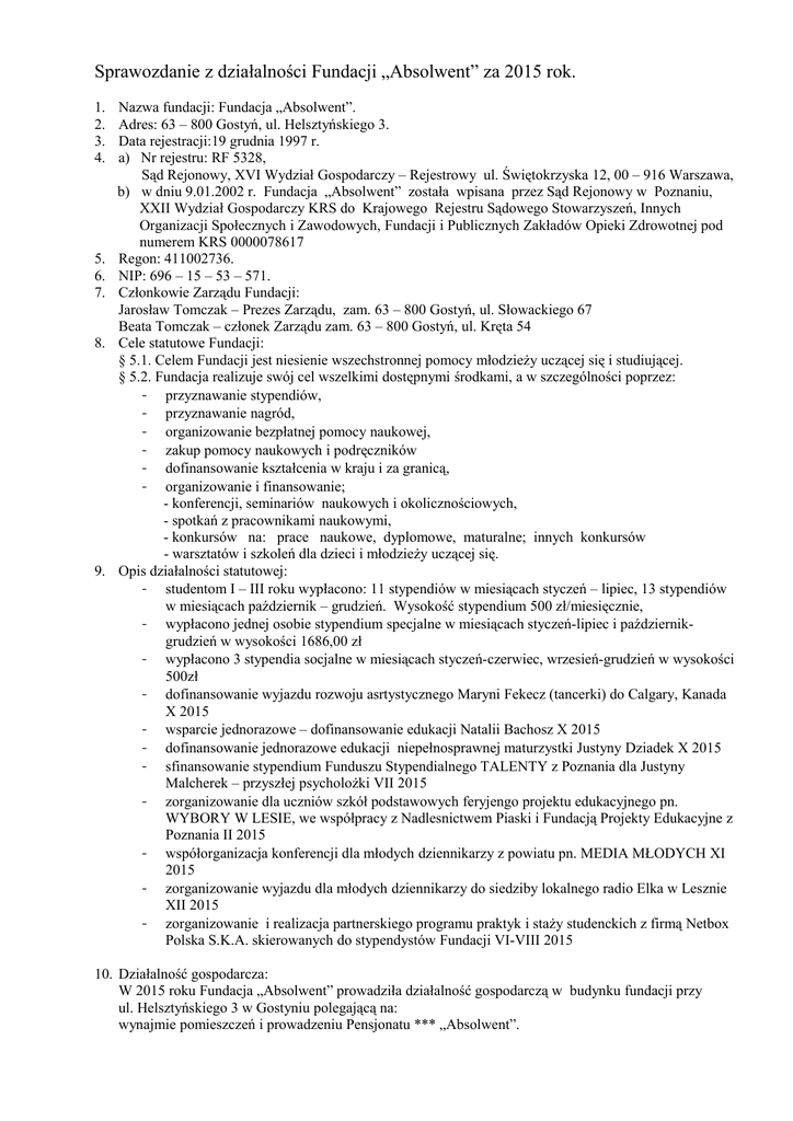 Sprawozdanie z działalności Fundacji „Absolwent” za 2015 rok. 1. 2. 3. 4. 5. 6. 7. 8. 9. Nazwa fundacji: Fundacja „Absolwent”. Adres: 63 – 800 Gostyń, ul. Helsztyńskiego 3. Data rejestracji:19 grudnia 1997 r. a) Nr rejestru: RF 5328, Sąd Rejonowy, XVI Wydział Gospodarczy – Rejestrowy ul. Świętokrzyska 12, 00 – 916 Warszawa, b) w dniu 9.01.2002 r. Fundacja „Absolwent” została wpisana przez Sąd Rejonowy w Poznaniu, XXII Wydział Gospodarczy KRS do Krajowego Rejestru Sądowego Stowarzyszeń, Innych Organizacji Społecznych i Zawodowych, Fundacji i Publicznych Zakładów Opieki Zdrowotnej pod numerem KRS 0000078617 Regon: 411002736. NIP: 696 – 15 – 53 – 571. Członkowie Zarządu Fundacji: Jarosław Tomczak – Prezes Zarządu, zam. 63 – 800 Gostyń, ul. Słowackiego 67 Beata Tomczak – członek Zarządu zam. 63 – 800 Gostyń, ul. Kręta 54 Cele statutowe Fundacji: § 5.1. Celem Fundacji jest niesienie wszechstronnej pomocy młodzieży uczącej się i studiującej. § 5.2. Fundacja realizuje swój cel wszelkimi dostępnymi środkami, a w szczególności poprzez: - przyznawanie stypendiów, - przyznawanie nagród, - organizowanie bezpłatnej pomocy naukowej, - zakup pomocy naukowych i podręczników - dofinansowanie kształcenia w kraju i za granicą, - organizowanie i finansowanie; - konferencji, seminariów naukowych i okolicznościowych, - spotkań z pracownikami naukowymi, - konkursów na: prace naukowe, dyplomowe, maturalne; innych konkursów - warsztatów i szkoleń dla dzieci i młodzieży uczącej się. Opis działalności statutowej: - studentom I – III roku wypłacono: 11 stypendiów w miesiącach styczeń – lipiec, 13 stypendiów w miesiącach październik – grudzień. Wysokość stypendium 500 zł/miesięcznie, - wypłacono jednej osobie stypendium specjalne w miesiącach styczeń-lipiec i październikgrudzień w wysokości 1686,00 zł - wypłacono 3 stypendia socjalne w miesiącach styczeń-czerwiec, wrzesień-grudzień w wysokości 500zł - dofinansowanie wyjazdu rozwoju asrtystycznego Maryni Fekecz (tancerki) do Calgary, Kanada X 2015 - wsparcie jednorazowe – dofinansowanie edukacji Natalii Bachosz X 2015 - dofinansowanie jednorazowe edukacji niepełnosprawnej maturzystki Justyny Dziadek X 2015 - sfinansowanie stypendium Funduszu Stypendialnego TALENTY z Poznania dla Justyny Malcherek – przyszłej psycholożki VII 2015 - zorganizowanie dla uczniów szkół podstawowych feryjengo projektu edukacyjnego pn. WYBORY W LESIE, we współpracy z Nadlesnictwem Piaski i Fundacją Projekty Edukacyjne z Poznania II 2015 - współorganizacja konferencji dla młodych dziennikarzy z powiatu pn. MEDIA MŁODYCH XI 2015 - zorganizowanie wyjazdu dla młodych dziennikarzy do siedziby lokalnego radio Elka w Lesznie XII 2015 - zorganizowanie i realizacja partnerskiego programu praktyk i staży studenckich z firmą Netbox Polska S.K.A. skierowanych do stypendystów Fundacji VI-VIII 2015 10. Działalność gospodarcza: W 2015 roku Fundacja „Absolwent” prowadziła działalność gospodarczą w budynku fundacji przy ul. Helsztyńskiego 3 w Gostyniu polegającą na: wynajmie pomieszczeń i prowadzeniu Pensjonatu *** „Absolwent”. 11. Informacja o działalności finansowej w załącznikach: - wprowadzenie do sprawozdania finansowego za rok 2015, - rachunek zysków i strat, - bilans jednostki - informacja dodatkowa do bilansu. 12. Liczba zatrudnionych: 5 osób: - 2 członków Zarządu, - 1 pedagog , - 2 pracowników hotelu. 13. Przeciętne wynagrodzenie członków Zarządu: 4.091,94 zł brutto 14. Saldo na rachunku bankowym: 96.102,17 zł (stan na 31.12.2014r.) + lokaty terminowe lokata Santander 154.314,17 zł, lokata BGŻ 181.153,65 zł. 15. W okresie sprawozdawczym przeprowadzono następujące kontrole: okresowa Państwowego Powiatowego Inspektora Sanitarnego. Kontrola dotyczyła działalności gospodarczej prowadzonej przez Fundację „Absolwent”. Za Zarząd: Jarosław Tomczak: Gostyń, dnia 7 lipca 2016 r.