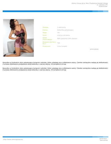 Aliens Group Jerzy Stec Produkcja-Handel-Usługi ul. Lipowa 17C Inowrocław Zestaw: 2 elementy Cecha: kokardka,połyskujące Nago: nie Kolor: czarny,czerwony Skład materiałowy: 90% poliamid 10% elastan Większe rozmiary Tak XL+: Producent: Livia Corsetti price gross: Koszulka w hinduskim stylu połyskująca tysiącem cekinów, które układają się w efektowne wzory. Cienkie ramiączka nadają jej delikatności. Z przodu efektownie przepasana dużą kokardą z czarnej satyny. W komplecie stringi. Koszulka w hinduskim stylu połyskująca tysiącem cekinów, które układają się w efektowne wzory. Cienkie ramiączka nadają jej delikatności. Z przodu efektownie przepasana dużą kokardą z czarnej satyny. W komplecie stringi. http://www.aliensgroup.eu generator: aptusshop