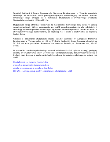 Wydział Edukacji i Spraw Społecznych Starostwa Powiatowego w Toruniu uprzejmie informuje, że uczniowie szkół ponadgimnazjalnych zamieszkujący na terenie powiatu toruńskiego mogą ubiegać się o uzyskanie Stypendium z Powiatowego Funduszu Stypendialnego do dnia 15 lipca 2015 r. Stypendium mogą otrzymać uczniowie po ukończeniu pierwszego roku nauki w szkole ponadgimnazjalnej, którzy uczęszczają do szkół ponadgimnazjalnych dla młodzieży i mieszkają na terenie powiatu toruńskiego, legitymują się średnią ocen za ostatni rok nauki z obowiązkowych zajęć edukacyjnych, co najmniej 4,75 i oceną z zachowania, co najmniej bardzo dobrą. Wnioski o przyznanie stypendium można składać osobiście w Kancelarii Starostwa Powiatowego w Toruniu pokój nr 100, w Wydziale Edukacji i Spraw Społecznych pokój nr 207 lub też pocztą na adres: Starostwo Powiatowe w Toruniu, ul. Towarowa 4-6, 87-100 Toruń. W przypadku ucznia niepełnoletniego wniosek składa rodzic (lub opiekun prawny), pedagog szkolny lub wychowawca klasy. Do wniosku o stypendium należy dołączyć zaświadczenie o średniej ocen i ocenie z zachowania bądź kserokopię świadectwa szkolnego za ostatni rok nauki. Oswiadczenie_o_numerze_konta-1.doc wniosek-o-przyznanie-stypendium.docx zasady-przyznawania-stypendiow-doc-1.doc PIT-2C_-_Oswiadczenie_osoby_otrzymujacej_stypendium[1].pdf