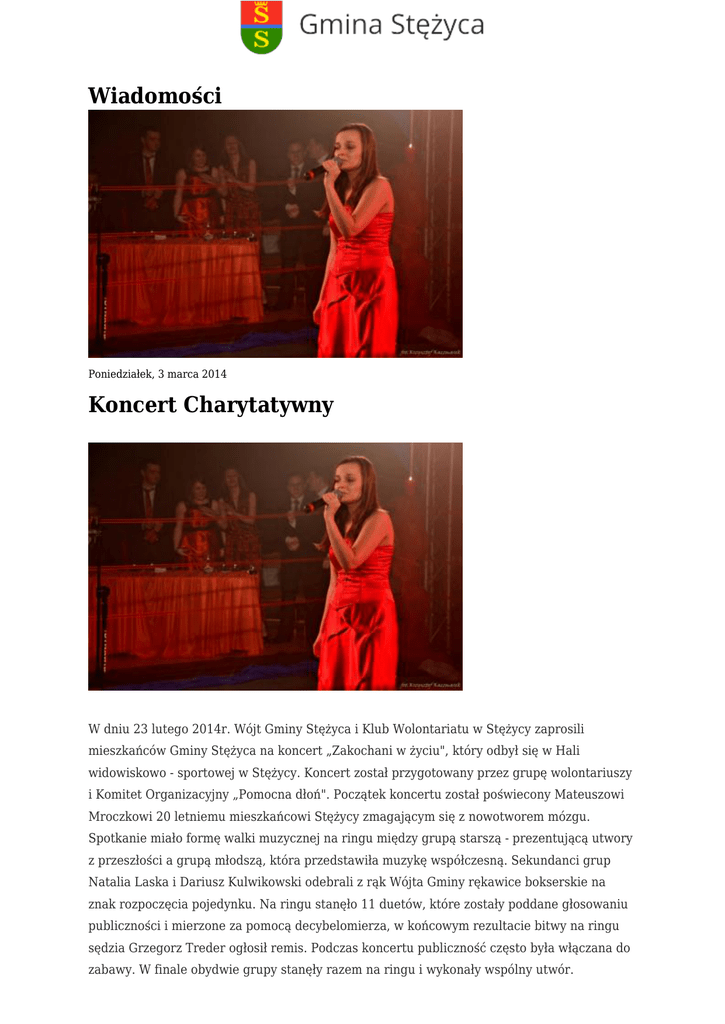 Wiadomości Poniedziałek, 3 marca 2014 Koncert Charytatywny W dniu 23 lutego 2014r. Wójt Gminy Stężyca i Klub Wolontariatu w Stężycy zaprosili mieszkańców Gminy Stężyca na koncert „Zakochani w życiu", który odbył się w Hali widowiskowo - sportowej w Stężycy. Koncert został przygotowany przez grupę wolontariuszy i Komitet Organizacyjny „Pomocna dłoń". Początek koncertu został poświecony Mateuszowi Mroczkowi 20 letniemu mieszkańcowi Stężycy zmagającym się z nowotworem mózgu. Spotkanie miało formę walki muzycznej na ringu między grupą starszą - prezentującą utwory z przeszłości a grupą młodszą, która przedstawiła muzykę współczesną. Sekundanci grup Natalia Laska i Dariusz Kulwikowski odebrali z rąk Wójta Gminy rękawice bokserskie na znak rozpoczęcia pojedynku. Na ringu stanęło 11 duetów, które zostały poddane głosowaniu publiczności i mierzone za pomocą decybelomierza, w końcowym rezultacie bitwy na ringu sędzia Grzegorz Treder ogłosił remis. Podczas koncertu publiczność często była włączana do zabawy. W finale obydwie grupy stanęły razem na ringu i wykonały wspólny utwór. ORGANIZATORZY: Wójt Gminy Stężyca, Klub Wolontariatu Współorganizatorzy: Ochotnicza Staż Pożarna w Stężycy, Rada Sołecka Stężyca, Wolontariat 50 + Występujący: 1. Marta Skwierawska 2. Marcin Szmytke 3. Monika Stanisławska 4. Alicja Kulwikowska 5. Lilla Stencel 6. Kinga Szmyt 7. Kamila Brunka 8. Agata Szymańska 9. Błażej Głodowski 10. Gabriela Cyman 11. Weronika Suchodolska 12. Helena Bronk 13. Przemysław Sikorski 14. Artur Brunka 15. Martyna Łącka 16. Johanna Las 17. Julia Kulwikowska 18. Joanna Głodowska 19. Julia Mach 20. Weronika Mach 21. Tadeusz Pobłocki Sekundanci: Natalia Laska Dariusz Kulwikowski Asystentka - Anna Majewska Prowadzący Hanna Stencel Grzegorz Treder Dekoracja Alicja Domaschke Pomoc techniczna ; Wiktoria Rekowska, Anna Wiczkowska Reżyseria Hanna Stencel