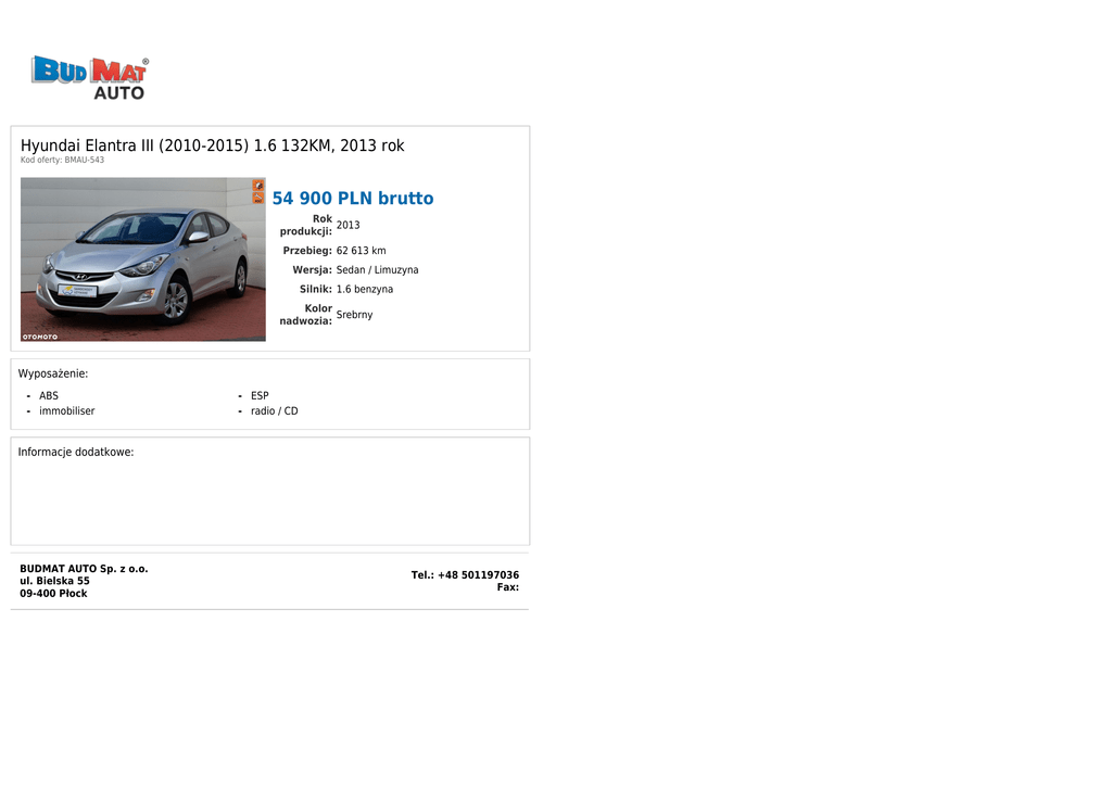 Hyundai Elantra III (2010-2015) 1.6 132KM, 2013 rok Kod oferty: BMAU-543 54 900 PLN brutto Rok 2013 produkcji: Przebieg: 62 613 km Wersja: Sedan / Limuzyna Silnik: 1.6 benzyna Kolor Srebrny nadwozia: Wyposażenie: - ABS - immobiliser - ESP - radio / CD Informacje dodatkowe: BUDMAT AUTO Sp. z o.o. ul. Bielska 55 09-400 Płock Tel.: +48 501197036 Fax: