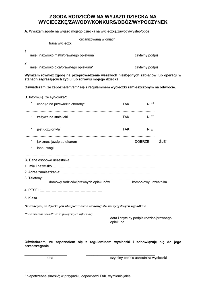 ZGODA RODZICÓW NA WYJAZD DZIECKA NA WYCIECZKĘ/ZAWODY/KONKURS/OBÓZ/WYPOCZYNEK A. Wyrażam zgodę na wyjazd mojego dziecka na wycieczkę/zawody/występ/obóz ____________________________ organizowaną w dniach:___________________ trasa wycieczki 1. __________________________ ______________________________ imię i nazwisko matki/prawnego opiekuna* czytelny podpis 2. __________________________ imię i nazwisko ojca/prawnego opiekuna* ______________________________ czytelny podpis Wyrażam również zgodę na przeprowadzenie wszelkich niezbędnych zabiegów lub operacji w stanach zagrażających życiu lub zdrowiu mojego dziecka. Oświadczam, że zapoznałem/am* się z regulaminem wycieczki zamieszczonym na odwrocie. B. Informuję, że syn/córka*: choruje na przewlekłe choroby: TAK NIE1 ………………………………………………………………………………………………….. zażywa na stałe leki TAK NIE* ………………………………………………………………………………………………….. jest uczulony/a* TAK NIE* ………………………………………………………………………………………………….. jak znosi jazdę autokarem inne uwagi DOBRZE ŹLE* ………………………………………………………………………………………………….. C. Dane osobowe uczestnika 1. Imię i nazwisko …………………………………………………………………………….. 2. Adres zamieszkania:……………………………………………………………………… 3. Telefony: …………………………………… …………………………………………… domowy rodziców/prawnych opiekunów komórkowy uczestnika 4. PESEL:__ __ __ __ __ __ __ __ __ __ __ 5. Klasa ……………… Oświadczam, że dziecko jest ubezpiecznowne od następstw nieszczęśliwych wypadków Potwierdzam rawidłowość powyższych informacji …............................…………………………………………… data i czytelny podpis rodzica/prawnego opiekuna Oświadczam, że zapoznałem się z regulaminem wycieczki i zobowiązuję się do jego przestrzegania ______________________ data 1 ____________________________________ czytelny podpis uczestnika wycieczki niepotrzebne skreślić; w przypadku odpowiedzi TAK, wymienić jakie. REGULAMIN WYCIECZKI (KRAJOWEJ I ZAGRANICZNEJ) 1. Uczestnik wycieczki zobowiązany jest stosować się do postanowień, przepisów i regulaminów obowiązujących w obiekcie zakwaterowania oraz miejscach realizacji programu wycieczki (m.in. przepisów przeciwpożarowych, komunikacyjnych, poruszania się po drogach publicznych, ciszy nocnej i korzystania z kąpielisk). 2. Uczestnik powinien zachowywać się w sposób zdyscyplinowany i kulturalny, a obiekty zabytkowe i eksponaty muzealne traktować z należytym szacunkiem. 3. Uczestnik wycieczki podlega opiekunom i jest zobowiązany do bezwzględnego wykonywania ich poleceń. 4. Podczas podróży uczestnik zobowiązany jest do przestrzegania przepisów podróżnych oraz stosowania się do poleceń opiekunów, pilota i kierowców. 5. Uczestników obowiązuje bezwzględny zakaz palenia tytoniu, zażywania narkotyków, środków odurzających oraz napojów alkoholowych, w tym także piwa. 6. Oddalanie się uczestnika z terenu zakwaterowania oraz miejsca prowadzenia zajęć może nastąpić wyłącznie za wiedzą i zgodą opiekunów. W przypadku wyjazdu zagranicznego uczestnicy zobowiązani są również do zachowywania się zgodnie z ogólnie przyjętymi obyczajami, zasadami i zwyczajami panującymi w danym kraju. 7. Ewentualne wyjście na dyskotekę i powrót z niej odbywa się grupą, pod opieką opiekuna. Podczas trwania dyskoteki uczestników obowiązuje zakaz wychodzenia z niej, poza ściśle określonymi i wyjątkowymi przypadkami, uzgodnionymi z opiekunami. 8. Każdorazowe wyjście na plażę oraz kąpiel w akwenie (jeżeli taka możliwość zaistnieje) może nastąpić wyłącznie pod nadzorem, a także za wiedzą i zgodą opiekunów. Uczestnicy wycieczki, na plaży przebywają w miejscu wskazanym przez opiekuna. 9. Uczestnicy bez zgody i nadzoru opiekunów nie mogą korzystać ze sprzętu pływającego. 10. Wszystkich uczestników wycieczki obowiązuje zachowanie nienarażające bezpieczeństwa własnego i innych. 11. Uczestnicy zobowiązani są do przebywania w miejscu zakwaterowania w godzinach określonych przez kierownika wycieczki. 12. Cisza nocna obowiązuje w godzinach 22.00 – 7.00. Po godzinie 23.00 w miejscu zakwaterowania obowiązuje cisza bezwzględna. 13. Każdy uczestnik obowiązany jest dbać o swój bagaż i pieniądze oraz o porządek w miejscu zakwaterowania. Ma również obowiązek dbania o mienie i wyposażenie miejsca, w którym przebywa. Za szkody wyrządzone przez uczestnika wycieczki odpowiedzialność ponosi on sam, a w przypadku ucznia niepełnoletniego, jego rodzice lub opiekunowie prawni. 14. Rodzice lub prawni opiekunowie zobowiązani są do zadbania o to, aby dziecko, będące uczestnikiem wycieczki zostało właściwie na nią wyposażone. Dotyczy to zwłaszcza ewentualnych lekarstw, legitymacji szkolnej, bądź ważnego paszportu, a także stosownego obuwia i odzieży. Uczestnik DRASTYCZNIE nieprzygotowany do wycieczki może być odesłany do domu nawet z miejsca zbiórki. 15. Uczestnik naruszający regulamin wycieczki może być wydalony z wycieczki na koszt rodziców (prawnych opiekunów). W przypadku ucznia niepełnoletniego rodzice (prawni opiekunowie) zostaną również obciążeni kosztami podróży opiekuna, który będzie eskortował ucznia. 16. Uczestnik może sam dawkować sobie leki na podstawie pisemnego oświadczenia rodziców (prawnych opiekunów).