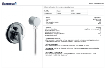 Rubin: Premium Class Bateria jednouchwytowa, wannowa podtynkowa Indeks kolor EAN 569-410-00 chrom 5907571560085 PKWiU: montaż: typ: ilosc w op jedn / zb.: waga netto: materiał: element sterujący: przepływ wody [l/min]: ciśnienie robocze [atm]: temperatura wody [°C] maks.: grupa akustyczna: 28.14.12.0 podtynkowy ścienna 1/5 1.98 mosiądz regulator ceramiczny Ø40 20 3 ≤90 II opakowanie zawiera: baterię, rozetę z uszczelką, uchwyt regulatora, łącznik natrysku, rozetkę płaską, klucz uniwersalny z tworzywa, instrukcję montażu, kartę gwarancyjną zalecany osprzęt: wylot wannowy 836-001-00, natrysk przesuwny SATURN 841-310-00 gwarancja: 100 lat na elementy odlewane, 5 lat na bezawaryjną pracę regulatorów ceramicznych certyfikaty i deklaracje: produkt wykonany zgodnie z normą PN-EN 817, posiada Znak Budowlany , Atest Higieniczny , Deklarację Zgodności Rubin: Premium Class Rubin: Premium Class