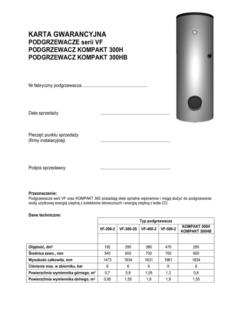 KARTA GWARANCYJNA PODGRZEWACZE serii VF