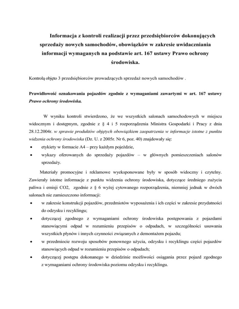 Informacja z kontroli realizacji przez przedsiębiorców dokonujących sprzedaży nowych samochodów, obowiązków w zakresie uwidaczniania informacji wymaganych na podstawie art. 167 ustawy Prawo ochrony środowiska. Kontrolą objęto 3 przedsiębiorców prowadzących sprzedaż nowych samochodów . Prawidłowość oznakowania pojazdów zgodnie z wymaganiami zawartymi w art. 167 ustawy Prawo ochrony środowiska. W wyniku kontroli stwierdzono, że we wszystkich salonach samochodowych w miejscu widocznym i dostępnym, zgodnie z § 4 i 5 rozporządzenia Ministra Gospodarki i Pracy z dnia 28.12.2004r. w sprawie produktów objętych obowiązkiem zaopatrzenia w informacje istotne z punktu widzenia ochrony środowiska (Dz. U. z 2005r. Nr 6, poz. 40) znajdowały się: etykiety w formacie A4 – przy każdym pojeździe, wykazy oferowanych do sprzedaży pojazdów – w głównych pomieszczeniach salonów sprzedaży. Materiały promocyjne i reklamowe wyeksponowane były w sposób widoczny i czytelny. Zawierały istotne informacje z punktu widzenia ochrony środowiska, dotyczące średniego zużycia paliwa i emisji CO2, zgodnie z § 6 wyżej cytowanego rozporządzenia, niemniej jednak w dwóch salonach nie zamieszczono informacji: w zakresie konstrukcji pojazdów, przedmiotów wyposażenia i ich części w zakresie przydatności do odzysku i recyklingu; dotyczącej zgodnego z wymaganiami ochrony środowiska postępowania z pojazdami stanowiącymi odpad w rozumieniu przepisów o odpadach, w szczególności usuwania wszystkich płynów i innych czynności związanych z demontażem pojazdu; w przedmiocie rozwoju sposobów ponownego użycia, odzysku i recyklingu części pojazdów stanowiących odpad w rozumieniu przepisów o odpadach; dotyczącej postępu dokonanego w dziedzinie możliwości osiągania przez pojazd zgodnego z wymaganiami ochrony środowiska poziomu odzysku i recyklingu. W broszurach stanowiących materiały promocyjne znajdowały się jedynie napisy, że informacje dotyczące odzysku i recyklingu samochodów oraz ich przydatności w tym zakresie, dostępne są na stronach internetowych generalnych importerów samochodów na rynek polski . Przedsiębiorcy wyjaśnili, że broszury stanowiące materiały promocyjne są przysyłane przez generalnych importerów samochodów w Polsce i nie mają możliwości ingerowania w treść materiałów promocyjnych im przekazywanych. Przedsiębiorców, u których stwierdzono nieprawidłowości, pouczono o wymaganiach dotyczących zamieszczania w materiałach promocyjnych wyżej wymienionych informacji. Przestrzeganie przepisów ustawy z dnia 5 lipca 2001r. o cenach (Dz. U. Nr 97, poz. 1050 ze zm.) i rozporządzenia Ministra Finansów z dnia 10 czerwca 2002r. w sprawie szczegółowych zasad uwidaczniania cen towarów i usług oraz sposobu oznaczania ceną towarów przeznaczonych do sprzedaży (Dz. U. Nr 99, poz. 894 z póz. zm.) Wszystkie przeznaczone do sprzedaży pojazdy, a także inne produkty (akcesoria samochodowe) oferowane do sprzedaży w salonach samochodowych, oznakowane były ceną detaliczną zgodnie z art. 12 ust. 1 w/w ustawy oraz § 9 ust.1 w/w rozporządzenia Ministra Finansów. Ceny poszczególnych pojazdów i towarów uwidocznione były w sposób zapewniający prostą i nie budzącą wątpliwości informację. Prawidłowość dołączania do pojazdów instrukcji obsługi Przeprowadzone kontrole wykazały, że zgodnie z art. 3 ust. 5 ustawy z dnia 27 lipca 2002r. o szczególnych warunkach sprzedaży konsumenckiej oraz o zmianie Kodeksu cywilnego (Dz. U. Nr 141, poz.1176 z późn. zm.) sprzedawca wydaje kupującemu wraz z pojazdem wszystkie elementy jego wyposażenia oraz instrukcje obsługi, konserwacji i eksploatacji sporządzone w języku polskim. Kontrola w zakresie udostępniania zestawień W dwóch kontrolowanych salonach samochodowych nie był realizowany obowiązek udostępniania zestawień, o których mowa w art.171a ust.1 ustawy Prawo ochrony środowiska w związku z brzmieniem § 5 rozporządzenia Prezesa Rady Ministrów z dnia 29 kwietnia 2004r. w sprawie zestawień istotnych z punktu widzenia ochrony środowiska informacji o produktach (Dz. U. Nr 98, poz.999). Strona 2 z 3 Przedsiębiorcy zobowiązali się do opracowania w/w zestawienia oraz do udostępniania go w punktach sprzedaży konsumentom. Legalność prowadzonej działalności gospodarczej Wszyscy przedsiębiorcy prowadzą działalność w oparciu o wpis do Krajowego Rejestru Sądowego. Nieprawidłowości w badanym zakresie nie stwierdzono. Strona 3 z 3