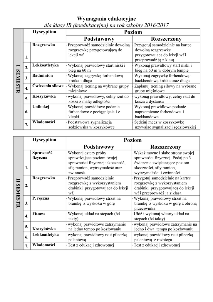 Wymagania edukacyjne dla klasy IB (koedukacyjna) na rok szkolny 2016/2017 Dyscyplina Poziom Podstawowy Rozszerzony Przeprowadź samodzielnie dowolną Przygotuj samodzielnie na kartce rozgrzewkę przygotowującą do dowolną rozgrzewkę lekcji wf. przygotowującą do lekcji wf i przeprowadź ją z klasą Lekkoatletyka Wykonaj prawidłowy start niski i Wykonaj prawidłowy start niski i bieg na 60 m bieg na 60 m w dobrym tempie Badminton Wykonaj zagrywkę forhendową Wykonaj zagrywkę forhendową i krótka i długa backhendową krótka oraz długa Ćwiczenia siłowe Wykonaj trening na wybrane grupy Zaplanuj trening siłowy na wybrane mięśniowe grupy mięśniowe Koszykówka wykonaj prawidłowy, celny rzut do wykonaj prawidłowy, celny rzut do kosza z małej odległości kosza z dystansu Unihokej Wykonaj prawidłowe podanie Wykonaj prawidłowe podanie forhendowe z pociągnięcia i z naprzemienne forhendowe i klepki backhandowe Wiadomości Podstawowa sygnalizacja Sędziuj mecz w koszykówkę sędziowska w koszykówce używając sygnalizacji sędziowskiej Rozgrzewka 1. I SEMESTR 2. 3. 4. 5. 6. 7. Dyscyplina Poziom Podstawowy Sprawność fizyczna 1. II SEMESTR Rozgrzewka 2. P. ręczna 3. 4. 5. 6. Fitness Koszykówka Lekkoatletyka 7. Wiadomości Rozszerzony Wykonaj cztery próby Wskaż mocne i słabe strony swojej sprawdzające poziom twojej sprawności fizycznej. Podaj po 3 sprawności fizycznej: skoczność, ćwiczenia zwiększające poziom siłę ramion, wytrzymałość oraz skoczności, siły ramion, zwinność. wytrzymałości i zwinności Przeprowadź samodzielnie Przygotuj samodzielnie na kartce rozgrzewkę z wykorzystaniem rozgrzewkę z wykorzystaniem drabinki przygotowującą do lekcji drabinki przygotowującą do lekcji wf. wf i przeprowadź ją z klasą. Wykonaj prawidłowy strzał na Wykonaj prawidłowy strzał na bramkę z wyskoku w górę bramkę z wyskoku w górę z obroną przeciwnika Wykonaj układ na stepach (64 Ułóż i wykonaj własny układ na takty) stepach (64 takty) wykonaj prawidłowe zatrzymanie wykonaj prawidłowe zatrzymanie na na jedno tempo po kozłowaniu jedno i dwa tempa po kozłowaniu wykonaj prawidłowy rzut piłeczką wykonaj prawidłowy rzut piłeczką palantową palantową z rozbiegu Test z edukacji zdrowotnej Test z edukacji zdrowotnej