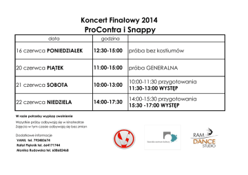 Koncert Finałowy 2014 ProContra i Snappy data godzina 16 czerwca PONIEDZIAŁEK 12:30-15:00 próba bez kostiumów 20 czerwca PIĄTEK 11:00-15:00 próba GENERALNA 21 czerwca SOBOTA 10:00-13:00 10:00-11:30 przygotowania 11:30-13:00 WYSTĘP 22 czerwca NIEDZIELA 14:00-17:30 14:00-15:30 przygotowania 15:30 -17:00 WYSTĘP W razie potrzeby wypiszę zwolnienie Wszystkie próby odbywają się w kinoteatrze Zajęcia w tym czasie odbywają się bez zmian Dodatkowe informacje VANIL tel. 792483674 Rafał Pięknik tel. 664171744 Monika Rudowska tel. 608682468