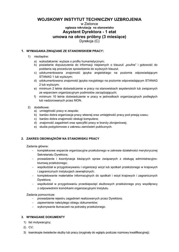 WOJSKOWY INSTYTUT TECHNICZNY UZBROJENIA w Zielonce ogłasza rekrutację na stanowisko Asystent Dyrektora - 1 etat umowa na okres próbny (3 miesiące) Dyrekcja (C) 1. WYMAGANIA ZWIĄZANE ZE STANOWISKIEM PRACY: 1) niezbędne: a) wykształcenie: wyższe o profilu humanistycznym; b) posiadanie dopuszczenia do informacji niejawnych o klauzuli „poufne” i gotowość do poddania się procedurze sprawdzenia do wyższych klauzul; c) udokumentowana znajomość języka angielskiego na poziomie odpowiadającym STANAG 1 lub wyższym; d) udokumentowana znajomość języka rosyjskiego na poziomie odpowiadającym STANAG 2 lub wyższym; e) minimum 2 letnie doświadczenie w pracy na stanowiskach asystenckich lub związanych ze wsparciem organizacyjnym podmiotów zarządzających; f) minimum 10 letnie doświadczenie w pracy w jednostkach organizacyjnych podległych lub nadzorowanych przez MON. 2) dodatkowe: a) umiejętność pracy w zespole; b) bardzo dobra organizacja pracy własnej oraz umiejętność pracy pod presją czasu; c) bardzo dobra znajomość obsługi komputera; d) znajomość zagadnień oraz specyfiki pracy w branży zbrojeniowej; e) studia podyplomowe z zakresu zamówień publicznych. 2. ZAKRES OBOWIĄZKÓW NA STANOWISKU PRACY Zadania główne: kompleksowe wsparcie organizacyjne przełożonego w zakresie działalności merytorycznej Sekretariatu Dyrektora; prowadzenie i koordynacja bieżących spraw związanych z obsługą administracyjnobiurową przełożonego; współudział w przygotowywaniu i organizacji wizyt lub spotkań przełożonego w krajowych i zagranicznych instytucjach zewnętrznych; kompletowanie materiałów informacyjnych do spotkań i wizyt krajowych i zagranicznych Dyrektora; współudział w przygotowaniu przedsięwzięć służbowych przełożonego przy współpracy z odpowiednimi komórkami organizacyjnymi Instytutu. Zadania pomocnicze: prowadzenie rejestru zagadnień realizowanych przez Dyrektora; zapewnienie należytego obiegu dokumentów; wykonywanie tłumaczeń na potrzeby przełożonego. 3. WYMAGANE DOKUMENTY 1) list motywacyjny; 2) CV; 3) kserokopie świadectw służby lub pracy (oryginały do wglądu podczas rozmowy kwalifikacyjnej); 4) kserokopie dyplomów (świadectw) potwierdzających wykształcenie i kwalifikacje zawodowe (oryginały do wglądu podczas rozmowy kwalifikacyjnej); 5) kserokopie zaświadczeń o ukończonych kursach, szkoleniach i uprawnieniach. Składane dokumenty powinny być opatrzone klauzulą: „Wyrażam zgodę na przetwarzanie moich danych osobowych w celach rekrutacji, zgodnie z ustawą z dnia 29 sierpnia 1997 r. o ochronie danych osobowych (tj. Dz. U. z 2002 r. Nr 101, poz. 926 z późn. zm.)”. MIEJSCE I TERMIN SKŁADANIA DOKUMENTÓW Wymagane dokumenty należy składać lub przesłać pocztą w terminie do dnia 17 sierpnia 2016 r. na adres: Wojskowy Instytut Techniczny Uzbrojenia, ul. St. Wyszyńskiego 7, 05-220 Zielonka, w zaklejonych kopertach, z dopiskiem: „Oferta pracy na stanowisko Asystent Dyrektora” lub drogą elektroniczną na adres: [email protected]. Dokumenty, które wpłyną do Instytutu po określonym terminie nie będą rozpatrywane (decyduje data wpływu). 00 Komisyjne otwarcie dokumentów nastąpi w dniu 18 sierpnia 2016 r. o godz. 10 . Dodatkowe informacje można uzyskać pod numerem telefonu /22/ 761 44 77. Dokumenty aplikacje kandydatów powinny zawierać adres e-mail oraz nr telefonu kontaktowego. Kandydaci zakwalifikowani do rozmowy kwalifikacyjnej (jej kolejnego etapu), zostaną niezwłocznie poinformowani o jej miejscu i terminie. Jako kompletne będą uważane aplikacje zawierające wszystkie wymagane dokumenty i własnoręcznie podpisane oświadczenia. Po zakończeniu rekrutacji dokumenty aplikacyjne osób niezatrudnionych zostaną zniszczone lub odesłane nadawcy w ciągu 14 dni kalendarzowych od zakończenia rekrutacji.