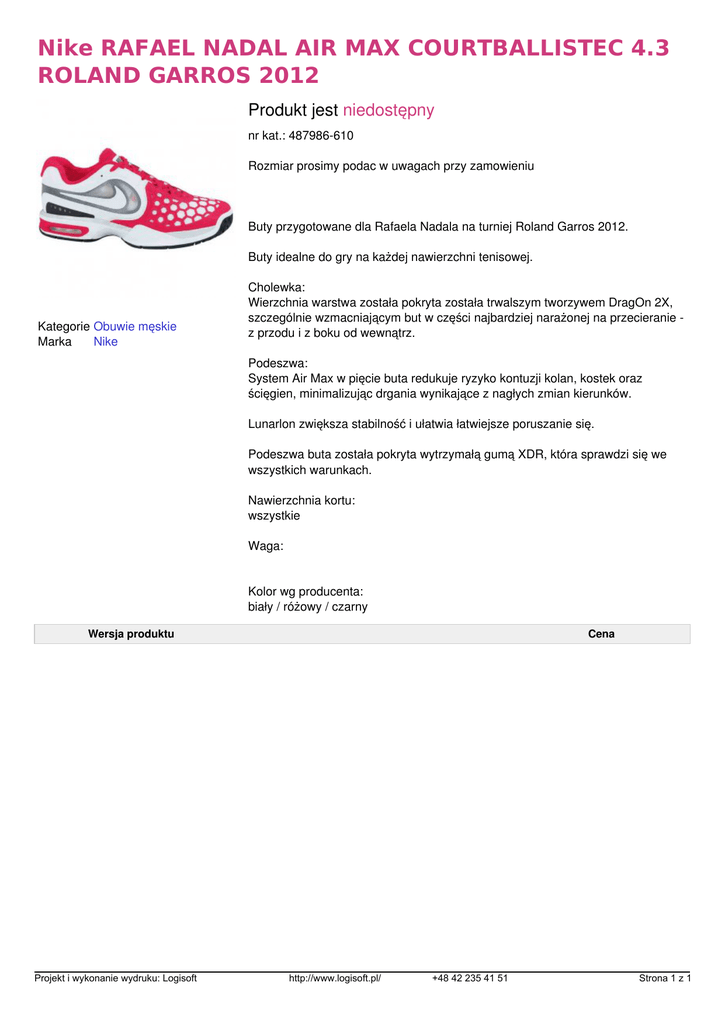 Nike RAFAEL NADAL AIR MAX COURTBALLISTEC 4.3 ROLAND GARROS 2012 Produkt jest niedostępny nr kat.: 487986-610 Rozmiar prosimy podac w uwagach przy zamowieniu Buty przygotowane dla Rafaela Nadala na turniej Roland Garros 2012. Buty idealne do gry na każdej nawierzchni tenisowej. Kategorie Obuwie męskie Marka Nike Cholewka: Wierzchnia warstwa została pokryta została trwalszym tworzywem DragOn 2X, szczególnie wzmacniającym but w części najbardziej narażonej na przecieranie z przodu i z boku od wewnątrz. Podeszwa: System Air Max w pięcie buta redukuje ryzyko kontuzji kolan, kostek oraz ścięgien, minimalizując drgania wynikające z nagłych zmian kierunków. Lunarlon zwiększa stabilność i ułatwia łatwiejsze poruszanie się. Podeszwa buta została pokryta wytrzymałą gumą XDR, która sprawdzi się we wszystkich warunkach. Nawierzchnia kortu: wszystkie Waga: Kolor wg producenta: biały / różowy / czarny Wersja produktu Projekt i wykonanie wydruku: Logisoft Powered by TCPDF (www.tcpdf.org) Cena http://www.logisoft.pl/ +48 42 235 41 51 Strona 1 z 1