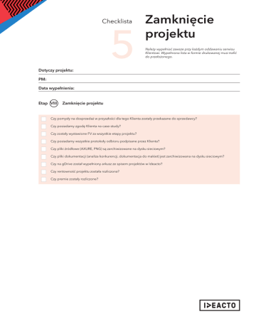 Checklista 5 Zamknięcie projektu Należy wypełniać zawsze przy każdym oddawaniu serwisu Klientowi. Wypełniona lista w formie drukowanej musi trafić do przełożonego. Dotyczy projektu: PM: Data wypełnienia: Etap VIII Zamknięcie projektu Czy pomysły na dosprzedaż w przyszłości dla tego Klienta zostały przekazane do sprzedawcy? Czy posiadamy zgodę Klienta na case-study? Czy zostały wystawione FV za wszystkie etapy projektu? Czy posiadamy wszystkie protokoły odbioru podpisane przez Klienta? Czy pliki źródłowe (AXURE, PNG) są zarchiwizowane na dysku sieciowym? Czy pliki dokumentacji (analiza konkurencji, dokumentacja do makiet) jest zarchiwizowana na dysku sieciowym? Czy na gDrive został wypełniony arkusz ze spisem projektów w Ideacto? Czy rentowność projektu została rozliczona? Czy premie zostały rozliczone?