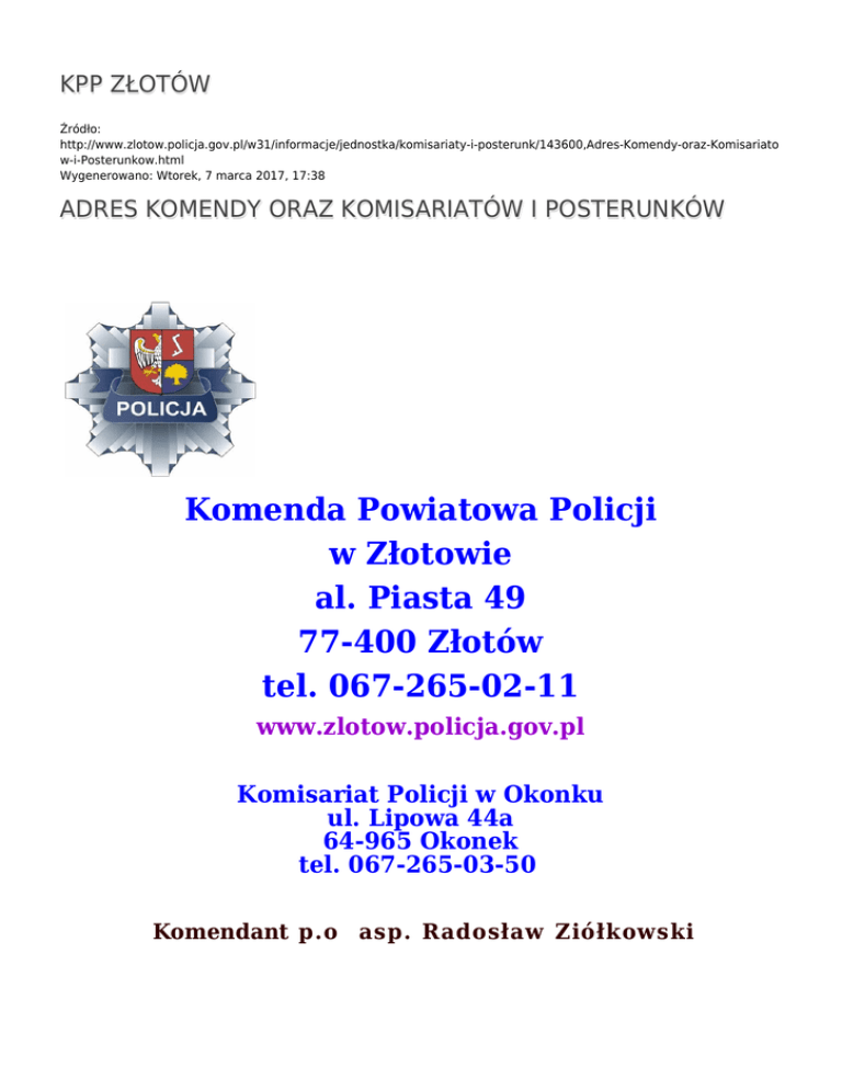 KPP ZŁOTÓW Źródło: http://www.zlotow.policja.gov.pl/w31/informacje/jednostka/komisariaty-i-posterunk/143600,Adres-Komendy-oraz-Komisariato w-i-Posterunkow.html Wygenerowano: Wtorek, 7 marca 2017, 17:38 ADRES KOMENDY ORAZ KOMISARIATÓW I POSTERUNKÓW Komenda Powiatowa Policji w Złotowie al. Piasta 49 77-400 Złotów tel. 067-265-02-11 www.zlotow.policja.gov.pl Komisariat Policji w Okonku ul. Lipowa 44a 64-965 Okonek tel. 067-265-03-50 Komendant p.o asp. Radosław Ziółkowski Komisariat Policji w Krajence ul. Domańskiego 9 77-430 Krajenka tel. 067-265-03-40 Komendant: asp. sztab. Jacek Jutrzenka -Trzebiatowski Komisariat Policji w Jastrowiu ul. 1 Maja 13 64-915 Jastrowie tel. 067-265-03-30 Komendant: p.o. asp. szt. Marek Wojtczak Posterunek Policji w Lipce ul. Kościuszki 16 77-420 Lipka tel. 067-265-03-60 Punkt przyjęć interesantów w Zakrzewie ul. Osmańczyka 7 77-424 Zakrzewo tel. 067-265-03-70 Kierownik asp. szt. Tomasz Maliszewski Ocena: 0/5 (0) Tweetnij